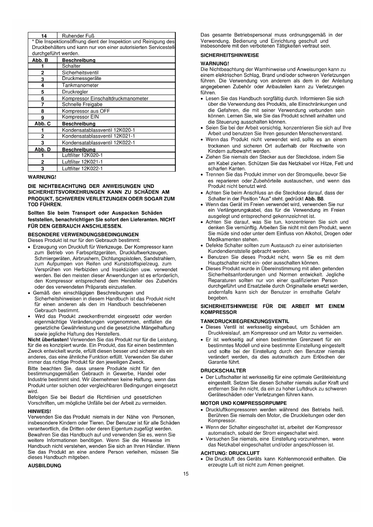 - Die Druckluft des Geräts kann Kohlenmonoxid enthalten. Die erzeugte Luft ist nicht zum Atmen geeignet.16