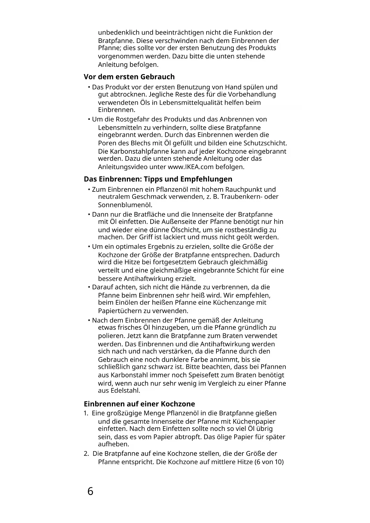 - Um die Rostgefahr des Produkts und das Anbrennen von Lebensmitteln zu verhindern, sollte diese Bratpfanne eingebrannt werden. Durch das Einbrennen werden die Poren des Blechs mit Öl gefüllt und bilden eine Schutzschicht. Die Karbonstahlpfanne kann auf jeder Kochzone eingebrannt werden. Dazu die unten stehende Anleitung oder das Anleitungsvideo unter www.IKEA.com befolgen. Das Einbrennen: Tipps und Empfehlungen