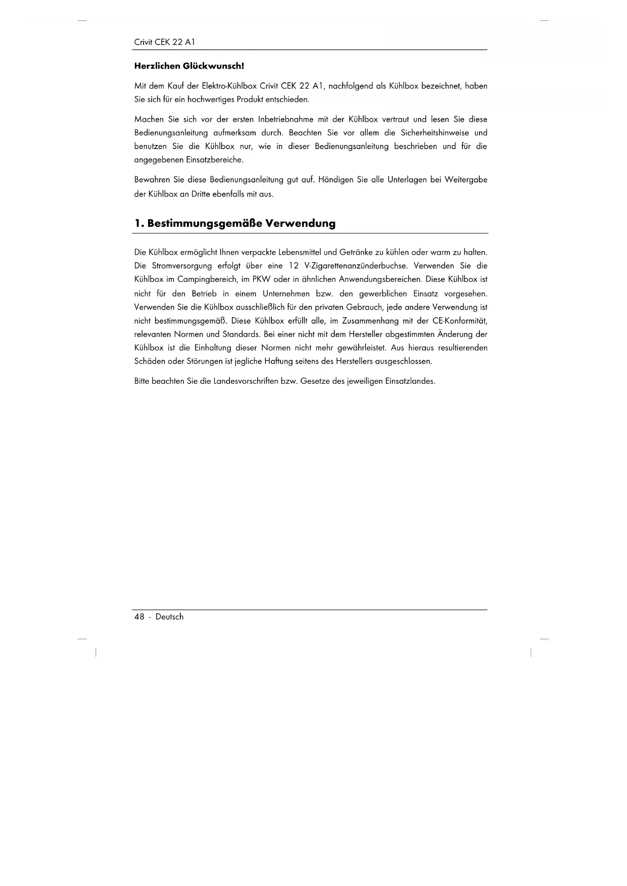 Die Kühlbox ermöglicht Ihnen verpackte Lebensmittel und Getränke zu kühlen oder warm zu halten. Die Stromversorgung erfolgt über eine 12 V-Zigarettenanzünderbuchse. Verwenden Sie die Kühlbox im Campingbereich, im PKW oder in ähnlichen Anwendungsbereichen. Diese Kühlbox ist nicht für den Betrieb in einem Unternehmen bzw. den gewerblichen Einsatz vorgesehen. Verwenden Sie die Kühlbox ausschließlich für den privaten Gebrauch, jede andere Verwendung ist nicht bestimmungsgemäß. Diese Kühlbox erfüllt alle, im Zusammenhang mit der CE-Konformität, relevanten Normen und Standards. Bei einer nicht mit dem Hersteller abgestimmten Änderung der Kühlbox ist die Einhaltung dieser Normen nicht mehr gewährleistet. Aus hieraus resultierenden Schäden oder Störungen ist jegliche Haftung seitens des Herstellers ausgeschlossen. Bitte beachten Sie die Landesvorschriften bzw. Gesetze des jeweiligen Einsatzlandes.Crivit CEK 22 A1 Deutsch - 49