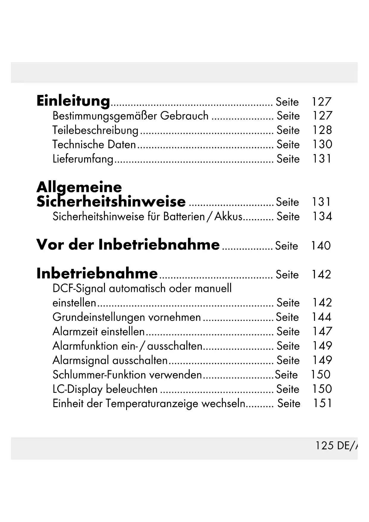 DER! Dieses Produkt kann von Kindern ab 8Jahren und darü- ber sowie von Personen mit verringerten physischen, sensorischen oder mentalen Fähigkeiten oder Mangel an Erfahrung und Wissen benutzt werden, wenn sie beaufsichtigt133 DE/AT/CH oder bezüglich des sicheren Gebrauchs des Produkts unter- wiesen wurden und die daraus resultierenden Gefahren verste- hen. Kinder dürfen nicht mit dem Produkt spielen. Reinigung und Benutzerwartung dürfen nicht von Kindern ohne Beauf- sichtigung durchgeführt werden.134 DE/AT/CH Sicherheitshinweise für Batterien / Akkus LEBENSGEFAHR! Halten Sie Batterien/Akkus außer Reich- weite von Kindern. Suchen Sie im Falle eines Verschluckens sofort einen Arzt auf! EXPLOSIONSGE- FAHR! Laden Sie nicht aufladbare Batterien niemals wieder auf. Schließen Sie Bat- terien/Akkus nicht kurz und/135 DE/AT/CH oder öffnen Sie diese nicht. Überhitzung, Brandgefahr oder Platzen können die Folge sein. Werfen Sie Batterien/Akkus niemals in Feuer oder Wasser. Setzen Sie Batterien/Akkus keiner mechanischen Belas- tung aus.136 DE/AT/CH Risiko des Auslaufens von Batterien / Akkus Vermeiden Sie extreme Bedin- gungen und Temperaturen, die auf Batterien/Akkus einwirken können z. B. auf Heizkörpern / direkte Sonneneinstrahlung. Wenn Batterien / Akkus ausge- laufen sind, vermeiden Sie den Kontakt von Haut, Augen und Schleimhäuten mit den Chemi- kalien! Spülen Sie die137 DE/AT/CH betroffenen Stellen sofort mit klarem Wasser und suchen Sie einen Arzt auf! SCHUTZHAND- SCHUHE TRAGEN! Ausgelaufene oder beschä- digte Batterien/Akkus können bei Berührung mit der Haut Verätzungen verursachen. Tra- gen Sie deshalb in diesem Fall geeignete Schutzhandschuhe.138 DE/AT/CH Im Falle eines Auslaufens der Batterien entfernen Sie diese sofort aus dem Produkt, um Be- schädigungen zu vermeiden. Verwenden Sie nur Batterien/ Akkus des gleichen Typs. Mischen Sie nicht alte Batte- rien/Akkus mit neuen! Entfernen Sie die Batterien/Ak- kus, wenn das Produkt längere Zeit nicht verwendet wird.139 DE/AT/CH Risiko der Beschädigung des Produkts Verwenden Sie ausschließlich den angegebenen Batterie- typ/Akkutyp! Setzen Sie Batterien / Akkus gemäß der Polaritätskenn- zeichnung (+) und (-) an Batterie / Akku und des Produkts ein.140 DE/AT/CH Reinigen Sie Kontakte an der Batterie und im Batteriefach vor dem Einlegen! Entfernen Sie erschöpfte Batte- rien/Akkus umgehend aus dem Produkt. Vor der Inbetriebnahme Ziehen Sie zunächst die Schutzfolie auf dem LC-Display des Produkts ab. Ziehen Sie den Kunststoffstreifen, der aus dem Batteriefach ragt, heraus. Hinweis: Das LC-Display führt nun einen kurzen Funktions- check durch und startet mit dem Empfang des DCF-Funksignals (zur näheren Erläuterung lesen Sie bitte: DCF-Signal141 DE/AT/CH automatisch oder manuell einstellen). Dieser Vorgang kann ei- nige Minuten dauern und wird durch Blinken des DCF-Sym- bols im Info-Feld