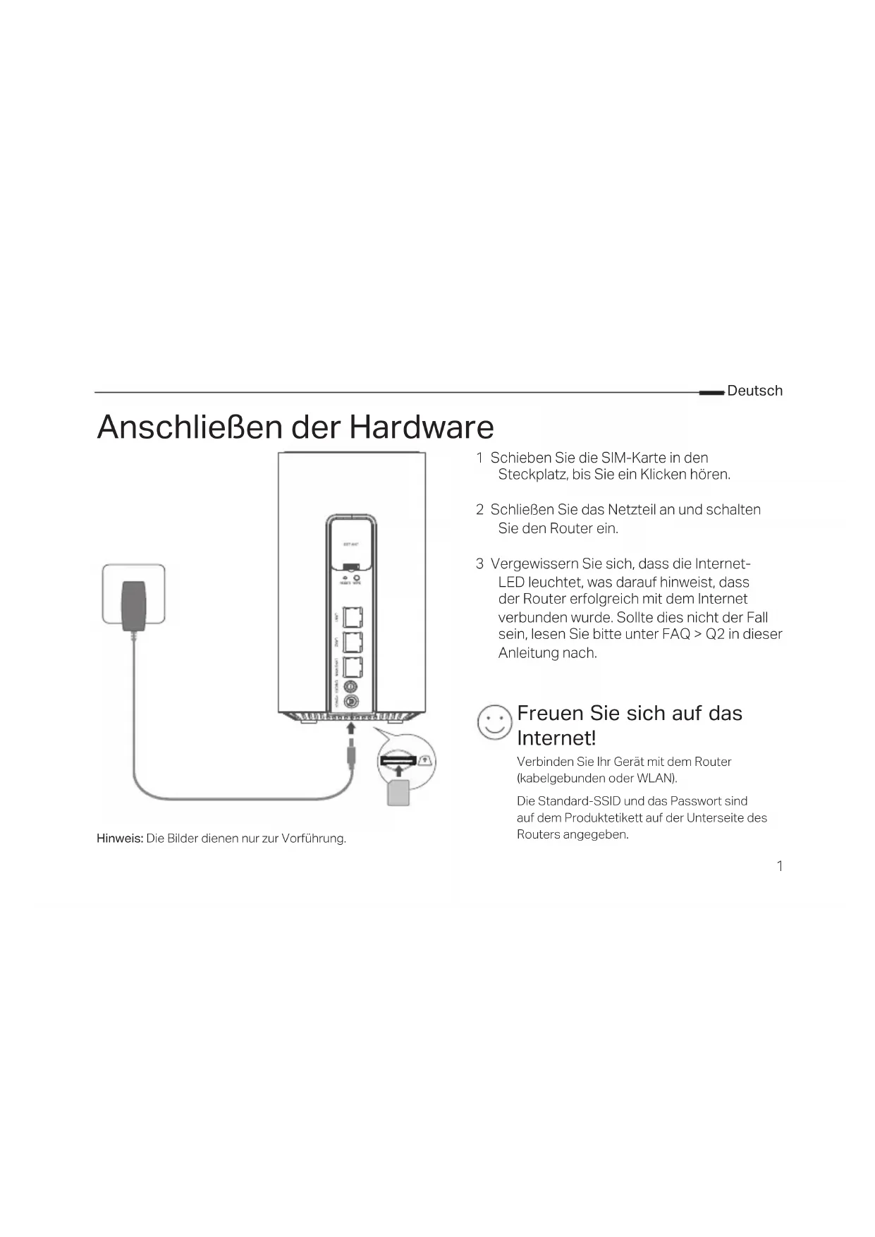 Quick Installation Guide 5G CPE Router © 2024 TP-Link 7106511769 REV1.0.1 For technical support, the user guide and more information, please visit https://www.tp-link.com/support/.CONTENTS 01 / Deutsch 05 / English 09 / Español 13 / Ελληνικά 17 / Français 21 / Italiano 25 / Português 29 / Suomi 33 / Nederlands 37 / Svenska 41 / Norsk 45 / Dansk1 Deutsch Anschließen der Hardware 1 Schieben Sie die SIM-Karte in den Steckplatz, bis Sie ein Klicken hören. 2 Schließen Sie das Netzteil an und schalten Sie den Router ein. 3 Vergewissern Sie sich, dass die Internet- LED leuchtet, was darauf hinweist, dass der Router erfolgreich mit dem Internet verbunden wurde. Sollte dies nicht der Fall sein, lesen Sie bitte unter FAQ > Q2 in dieser Anleitung nach. Verbinden Sie Ihr Gerät mit dem Router (kabelgebunden oder WLAN). Die Standard-SSID und das Passwort sind auf dem Produktetikett auf der Unterseite des Routers angegeben. Freuen Sie sich auf das Internet! Hinweis: Die Bilder dienen nur zur Vorführung.2 Deutsch Anpassen des 5G/4G+-Routers 1 Vergewissern Sie sich, dass Ihr Computer mit dem Router verbunden ist (über Kabel oder über WLAN). 2 Geben Sie http://tplinkmodem.net oder http://192.168.1.1 in die Adressleiste eines Webbrowsers ein. Verwenden Sie auf der aktuellen Anmeldeseite für die Webverwaltung den Standard-Benutzernamen und das Standard-Passwort "admin" oder erstellen Sie ein neues Passwort, um sich anzumelden. 3 Befolgen Sie die Anweisungen Schritt für Schritt auf der Seite Schnelleinrichtung (Quick Setup), um die Erstkonfiguration abzuschließen. Hinweis: Der Router kann auch im WLAN-Router-Modus für Kabelverbindungen verwendet (oder konfiguriert) werden. Weitere Informationen hierzu finden Sie im Benutzerhandbuch unter www.tp-link.com/de. FAQ (Häug gestellte Fragen) Q1. Was soll ich tun, wenn ich nicht auf die Webverwaltungsseite zugreifen kann?