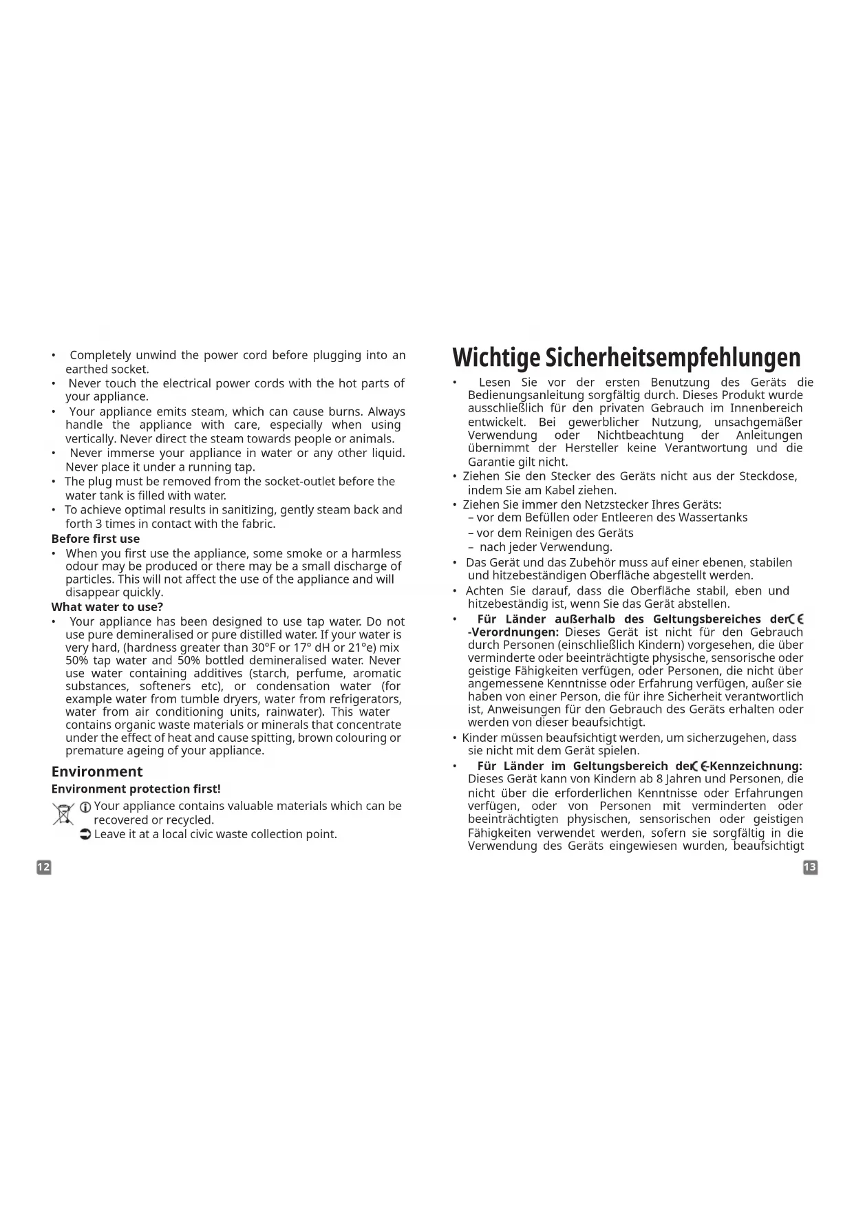 - Um optimale Ergebnisse bei der Desinfektion zu erzielen, führen Sie das Gerät 3 Mal vorsichtig mit Dampf über den Stoff. werden und die damit verbundenen Risiken verstanden haben. Kinder dürfen nicht mit dem Gerät spielen. Die Reinigung und Benutzerwartung darf nicht von Kindern ohne Aufsicht durchgeführt werden.