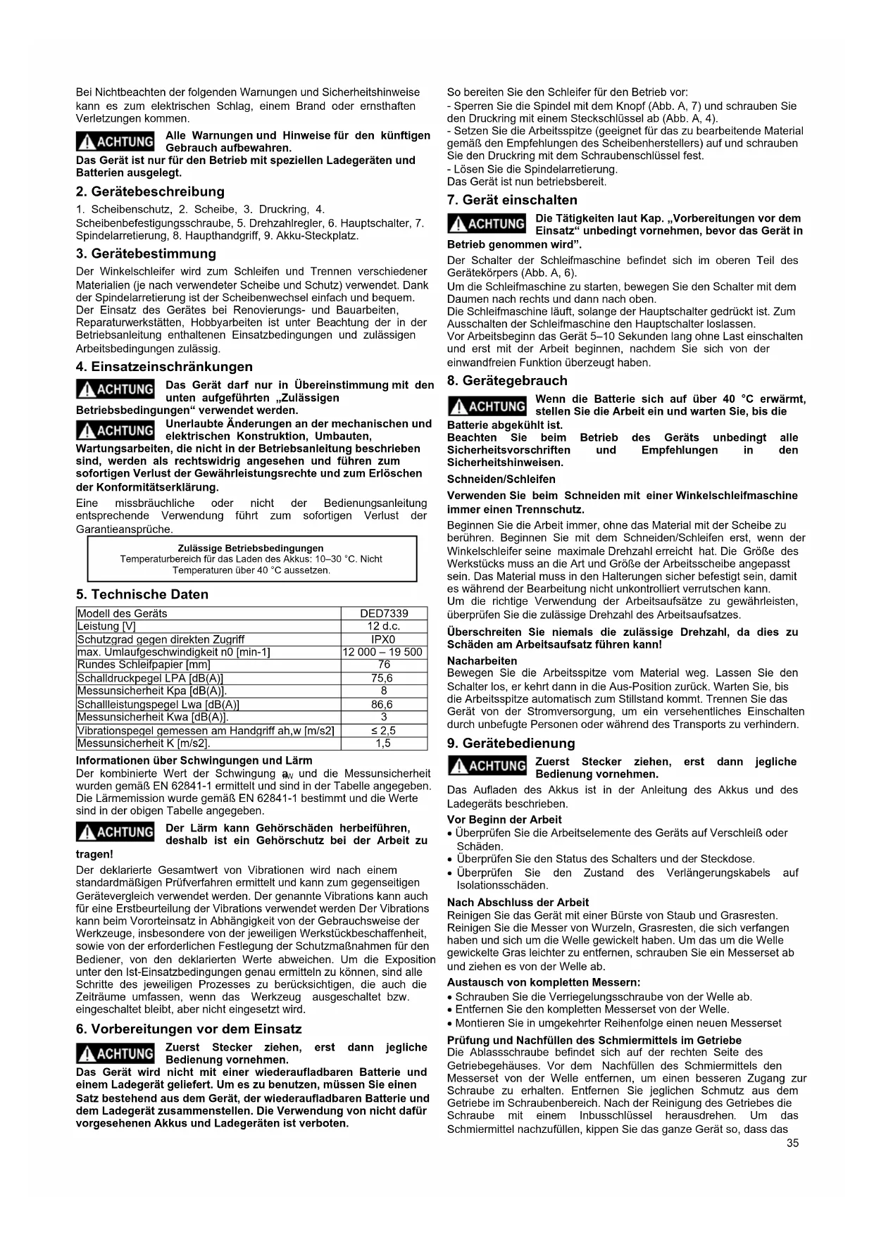 Übersetzung der Originalanleitung Die Konformitätserklärung wurde dieser Anleitung separat beigefügt. Fehlende Konformitätserklärung ist nach Rücksprache bei Dedra Exim Sp. z o.o. einzuholen. Allgemeine Sicherheitsbestimmungen wurden dieser Anleitung als ein separates Heft beigefügt. WARNUNG. Alle mit versehenen Warnungen und alle Hinweise gründlich lesen.35 Bei Nichtbeachten der folgenden Warnungen und Sicherheitshinweise kann es zum elektrischen Schlag, einem Brand oder ernsthaften Verletzungen kommen. Alle Warnungen und Hinweise für den künftigen Gebrauch aufbewahren. Das Gerät ist nur für den Betrieb mit speziellen Ladegeräten und Batterien ausgelegt.