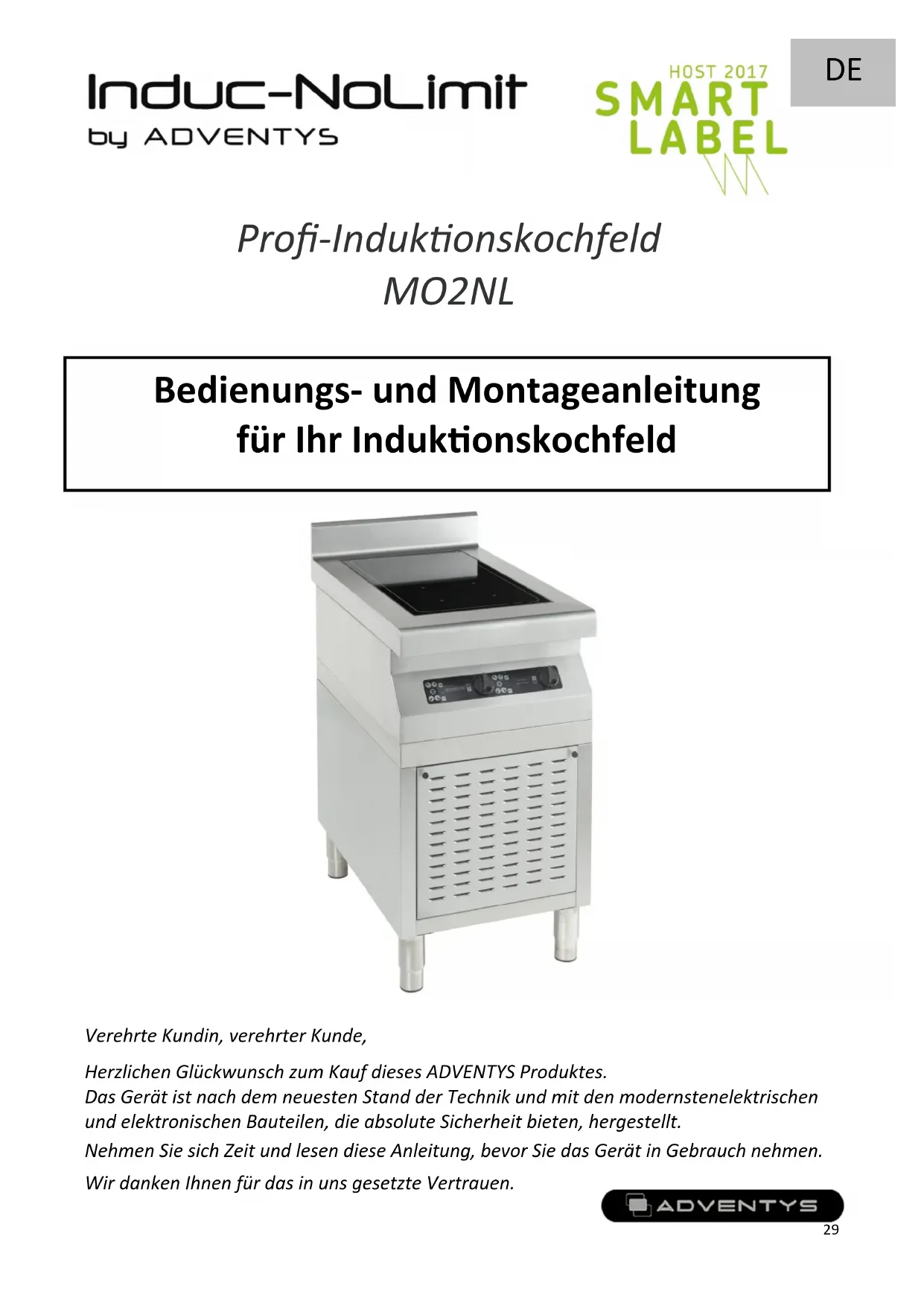 Made In France EN2829 Pro-Indukonskochfeld MO2NL Verehrte Kundin, verehrter Kunde, Herzlichen Glückwunsch zum Kauf dieses ADVENTYS Produktes. Das Gerät ist nach dem neuesten Stand der Technik und mit den modernstenelektrischen und elektronischen Bauteilen, die absolute Sicherheit bieten, hergestellt. Nehmen Sie sich Zeit und lesen diese Anleitung, bevor Sie das Gerät in Gebrauch nehmen. Wir danken Ihnen für das in uns gesetzte Vertrauen.