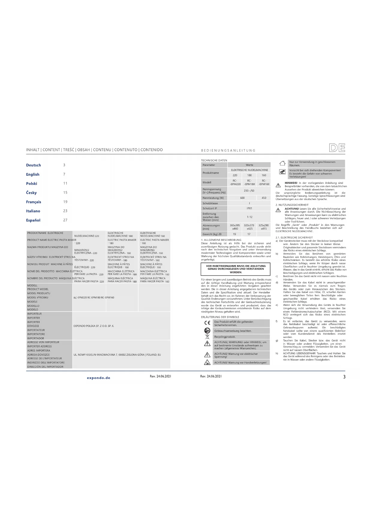 EPM220 RC-EPM180 RC-EPM160PRODUCT MODELMODEL PRODUKTUMODEL VÝROBKUMODÈLEMODELLOMODELOIMPORTEUREXPONDO POLSKA SP. Z O.O. SP. K.IMPORTERIMPORTERDOVOZCEIMPORTATEUR IMPORTATOREIMPORTADORADRESSE VON IMPORTEURUL. NOWY KISIELIN INNOWACYJNA 7, 66 002 ZIELONA GÓRA | POLAND, EUIMPORTER ADDRESSADRES IMPORTERAADRESA DOVOZCEADRESSE DE L'IMPORTATEUR INDIRIZZO DELL'IMPORTATOREDIRECCIÓN DEL IMPORTADOR TECHNISCHE DATEN Die Begrie „Gerät“ oder „Produkt“ in den Warnungen und Beschreibung des Handbuchs beziehen sich auf ELEKTRISCHE NUDELMACHINE . 2.1. ELEKTRISCHE SICHERHEIT a) Der Gerätestecker muss mit der Steckdose kompatibel sein. Ändern Sie den Stecker in keiner Weise. Originalstecker und passende Steckdosen vermindern das Risiko eines elektrischen Schlags. b) Vermeiden Sie das Berühren von geerdeten Bauteilen wie Rohrleitungen, Heizkörpern, Öfen und Kühlschränken. Es besteht das erhöhte Risiko eines elektrischen Schlags, wenn Ihr Körper durch nasse Oberächen und in feuchter Umgebung geerdet ist. Wasser, das in das Gerät eintritt, erhöht das Risiko von Beschädigungen und elektrischen Schlägen. c) Berühren Sie das Gerät nicht mit nassen oder feuchten Händen. d) Verwenden Sie das Kabel nicht in unsachgemäßer Weise. Verwenden Sie es niemals zum Tragen des Geräts oder zum Herausziehen des Steckers. Halten Sie das Kabel von Hitze, Öl, scharfen Kanten oder beweglichen Teilen fern. Beschädigte oder geschweißte Kabel erhöhen das Risiko eines elektrischen Schlags. e) Wenn sich die Verwendung des Geräts in feuchter Umgebung nicht verhindern lässt, verwenden Sie einen Fehlerstromschutzschalter (RCD). Mit einem RCD verringert sich das Risiko eines elektrischen Schlags. f) Es ist verboten, das Gerät zu verwenden, wenn das Netzkabel beschädigt ist oder oensichtliche Gebrauchsspuren aufweist. Ein beschädigtes Netzkabel sollte von einem qualizierten Elektriker oder vom Kundendienst des Herstellers ersetzt werden. g) Tauchen Sie Kabel, Stecker bzw. das Gerät nicht in Wasser oder andere Flüssigkeiten, um einen Stromschlag zu vermeiden. Verwenden Sie das Gerät nicht auf nassen Oberächen. h) ACHTUNG LEBENSGEFAHR! Tauchen und Halten Sie das Gerät während des Reinigens oder des Betriebes nie in Wasser oder andere Flüssigkeiten.