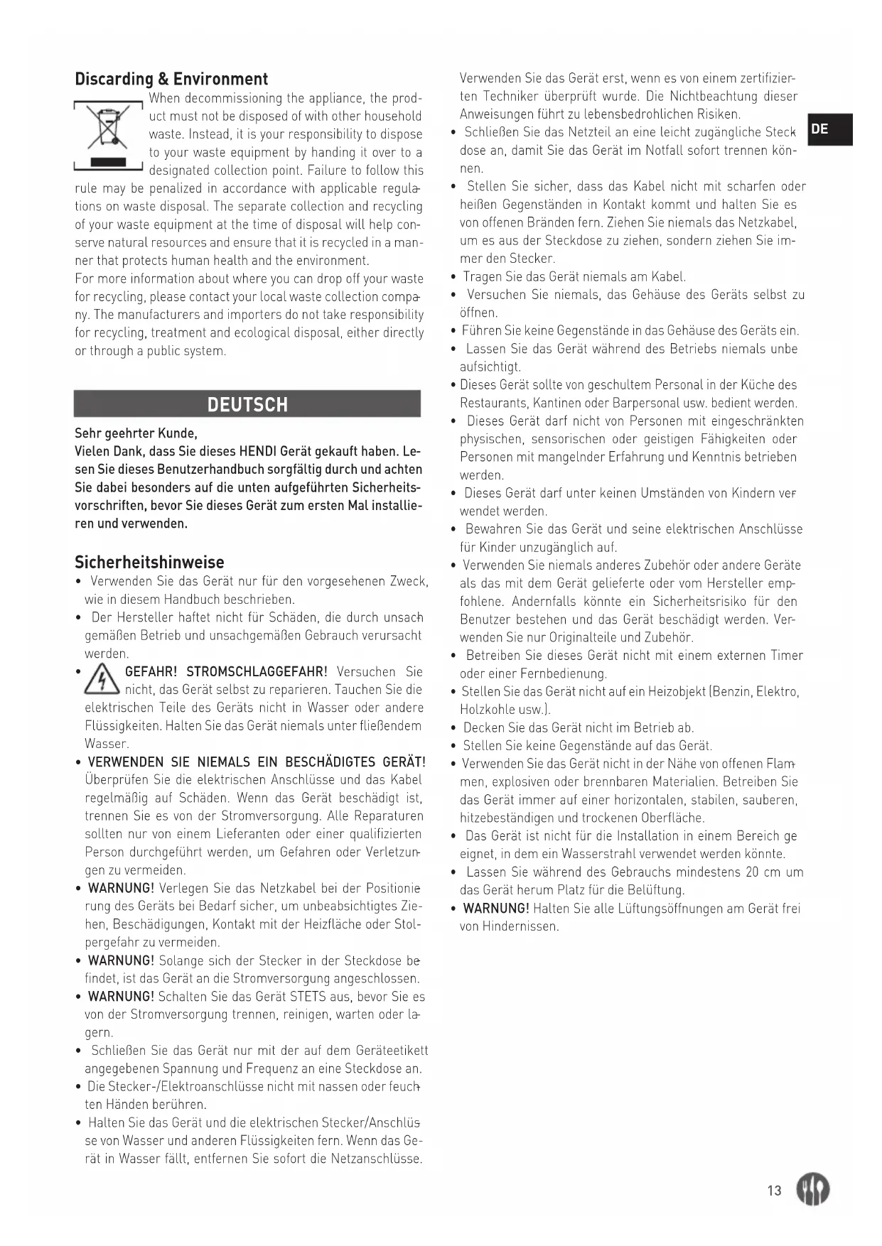 - Dieses Gerät ist für den kommerziellen Gebrauch bestimmt.