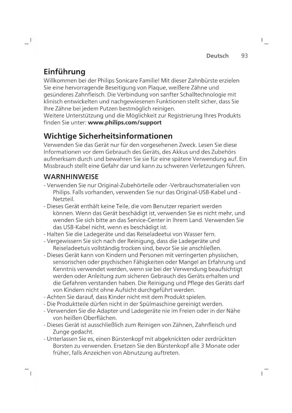 Deutsch Einführung Willkommen bei der Philips Sonicare Familie! Mit dieser Zahnbürste erzielen Sie eine hervorragende Beseitigung von Plaque, weißere Zähne und gesünderes Zahnfleisch. Die Verbindung von sanfter Schalltechnologie mit klinisch entwickelten und nachgewiesenen Funktionen stellt sicher, dass Sie Ihre Zähne bei jedem Putzen bestmöglich reinigen. Weitere Unterstützung und die Möglichkeit zur Registrierung Ihres Produkts finden Sie unter: www.philips.com/support Wichtige Sicherheitsinformationen Verwenden Sie das Gerät nur für den vorgesehenen Zweck. Lesen Sie diese Informationen vor dem Gebrauch des Geräts, des Akkus und des Zubehörs aufmerksam durch und bewahren Sie sie für eine spätere Verwendung auf. Ein Missbrauch stellt eine Gefahr dar und kann zu schweren Verletzungen führen. WARNHINWEISE - Verwenden Sie nur Original-Zubehörteile oder -Verbrauchsmaterialien von Philips. Falls vorhanden, verwenden Sie nur das Original-USB-Kabel und - Netzteil. - Dieses Gerät enthält keine Teile, die vom Benutzer repariert werden können. Wenn das Gerät beschädigt ist, verwenden Sie es nicht mehr, und wenden Sie sich bitte an das Service‑Center in Ihrem Land. Verwenden Sie das USB-Kabel nicht, wenn es beschädigt ist. - Halten Sie die Ladegeräte und das Reiseladeetui von Wasser fern. - Vergewissern Sie sich nach der Reinigung, dass die Ladegeräte und Reiseladeetuis vollständig trocken sind, bevor Sie sie anschließen. - Dieses Gerät kann von Kindern und Personen mit verringerten physischen, sensorischen oder psychischen Fähigkeiten oder Mangel an Erfahrung und Kenntnis verwendet werden, wenn sie bei der Verwendung beaufsichtigt werden oder Anleitung zum sicheren Gebrauch des Geräts erhalten und die Gefahren verstanden haben. Die Reinigung und Pflege des Geräts darf von Kindern nicht ohne Aufsicht durchgeführt werden. - Achten Sie darauf, dass Kinder nicht mit dem Produkt spielen. - Die Produktteile dürfen nicht in der Spülmaschine gereinigt werden. - Verwenden Sie die Adapter und Ladegeräte nie im Freien oder in der Nähe von heißen Oberflächen. - Dieses Gerät ist ausschließlich zum Reinigen von Zähnen, Zahnfleisch und Zunge gedacht. - Unterlassen Sie es, einen Bürstenkopf mit abgeknickten oder zerdrückten Borsten zu verwenden. Ersetzen Sie den Bürstenkopf alle 3Monate oder früher, falls Anzeichen von Abnutzung auftreten.94 Deutsch - Vermeiden Sie direkten Kontakt mit Produkten, die ätherische Öle oder Kokosnussöl enthalten. Der Kontakt kann zum Lösen von Borsten führen. - Die maximale Höhe der Nutzung beträgt 4500Meter. MEDIZINISCHE HINWEISE - Verwenden Sie das Gerät nicht mehr, und konsultieren Sie Ihren Zahnarzt/Arzt, wenn übermäßiges Zahnfleischbluten auftritt oder Zahnfleischbluten länger als eine Woche anhält oder wenn Sie beim Gebrauch Unbehagen oder Schmerzen verspüren. - Wenn in den vergangenen 2Monaten ein chirurgischer Eingriff an Ihren Zähnen oder am Zahnfleisch vorgenommen wurde, sollten Sie vor Benutzung des Geräts Ihren Zahnarzt konsultieren. - Wenden Sie sich als Träger eines Herzschrittmachers oder eines anderen Implantats vor der Verwendung dieses Geräts an Ihren Arzt oder den Hersteller des implantierten Gerätes. - Sollten Sie Bedenken wegen Ihrer Gesundheit haben, konsultieren Sie vor Benutzung dieses Geräts Ihren Arzt. - Dieses Gerät ist ein Gerät zur individuellen Mundpflege und nicht für die Verwendung durch mehrere Patienten in einer Zahnarztpraxis oder Zahnklinik geeignet. BATTERIE-SICHERHEITSANWEISUNGEN - Dieses Gerät verwendet Akkus, die nur von fachkundigen Personen entfernt werden dürfen. - Verwenden Sie das Gerät nur für den vorgesehenen Zweck. Lesen Sie diese Informationen vor dem Gebrauch des Geräts, des Akkus und des Zubehörs aufmerksam durch und bewahren Sie sie für eine spätere Verwendung auf. Ein Missbrauch stellt eine Gefahr dar und kann zu schweren Verletzungen führen. Das mitgelieferte Zubehör kann für verschiedene Produkte variieren. - Verwenden Sie nur Original-Zubehörteile und -Verbrauchsmaterialien von Philips. - Halten Sie das Produkt und die Akkus von Feuer fern und setzen Sie sie keinem direkten Sonnenlicht oder hohen Temperaturen aus. - Wenn das Produkt ungewöhnlich heiß wird, einen ungewöhnlichen Geruch entwickelt, die Farbe ändert oder wenn das Laden viel länger dauert als üblich, beenden Sie die Verwendung und das Laden des Produkts und wenden Sie sich an Philips. - Legen Sie die Produkte und die Batterien nicht in Mikrowellen oder auf Induktionsherde.95 Deutsch - Um die Aufheizung oder die Freisetzung giftiger oder gefährlicher Substanzen aus den Akkus zu verhindern, sollten Sie das Produkt oder die Akkus nicht öffnen, modifizieren, durchbohren, beschädigen oder zerlegen. Überladen Sie die Akkus nicht, verursachen Sie keinen Kurzschluss und laden Sie sie nicht umgekehrt auf. - Dieses Gerät verwendet Akkus, die nicht austauschbar sind. Wenn der Akku das Ende seiner Lebenszeit erreicht hat, muss das Gerät ordnungsgemäß entsorgt werden (siehe Abschnitt „Recycling“). - Laden Sie nur mit dem Philips Adapter HX6110, HYTCxx oder sicherheitsgeprüften Adaptern mit Eingangsleistung: 4,75-5,25VDC, 1,5W. - Benutzen und laden Sie das Produkt bei Temperaturen zwischen 0°C und 40°C. - Um ein versehentliches Kurzschließen von Akkus nach dem Entfernen zu vermeiden, dürfen die Akkuanschlüsse nicht mit Metallobjekten in Kontakt kommen (z.B. Münzen, Haarnadeln, Ringe). Wickeln Sie die Akkus nicht in Alufolie. Stecken Sie die Batterien in einen Plastikbeutel, bevor Sie sie entsorgen. - Dieses Gerät verwendet eine wiederaufladbare Lithium-Ionen-Zelle. MUSS DEM RECYCLING ZUGEFÜHRT ODER ORDNUNGSGEMÄSS ENTSORGT WERDEN. Umgebungsbedingungen– Aufbewahrung und Transport Temperatur -20°C bis +60°C. Elektromagnetische Felder Dieses Philips Gerät erfüllt sämtliche Normen und Regelungen bezüglich der Exposition in elektromagnetischen Feldern. Gerät mit Funkko
