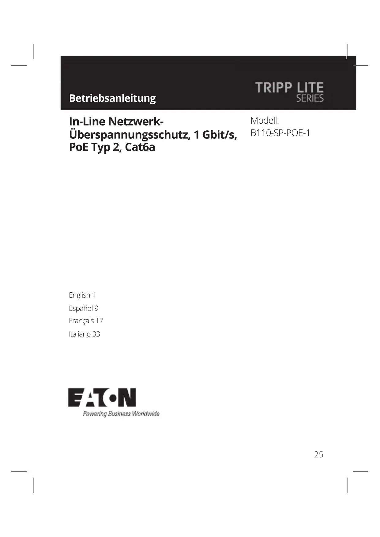 - Rücksendung neuer Geräte zum Recyling, wenn diese auslaufen und letztendlich zu Abfall werden Die Verwendung dieses Geräts für Lebenserhaltungssysteme, in denen der Ausfall des Geräts den Ausfall des Lebenserhaltungssystems verursachen oder dessen Sicherheit beziehungsweise Wirksamkeit bedeutend beeinträchtigen kann, wird nicht empfohlen. Eaton verfolgt eine Politik der kontinuierlichen Verbesserung. Spezikationen können ohne Ankündigung geändert werden. Fotos und Illustrationen können von den tatsächlichen Produkten leicht abweichen. Eaton 1000Eaton Boulevard Cleveland, OH44122 Vereinigte Staaten Eaton.com © 2024 Eaton Alle Rechte vorbehalten. Veröffentlichung Nr. 24-02-042 / 93-4A23_RevA April 2024 Eaton ist eine eingetragene Handelsmarke. Alle Marken sind Eigentum der jeweiligen Inhaber.33 Manuale d'uso English 1 Español 9 Français 17 Deutsch 25 Modello: B110-SP-POE-1 Protezione da sovratensione di rete in linea, 1 Gbps, PoE Tipo 2, Cat6a34