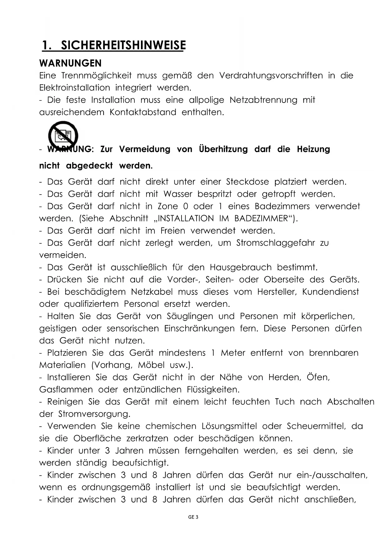 WARNUNGEN Eine Trennmöglichkeit muss gemäß den Verdrahtungsvorschriften in die Elektroinstallation integriert werden. - Die feste Installation muss eine allpolige Netzabtrennung mit ausreichendem Kontaktabstand enthalten. - WARNUNG: Zur Vermeidung von Überhitzung darf die Heizung nicht abgedeckt werden. - Das Gerät darf nicht direkt unter einer Steckdose platziert werden. - Das Gerät darf nicht mit Wasser bespritzt oder getropft werden. - Das Gerät darf nicht in Zone 0 oder 1 eines Badezimmers verwendet werden. (Siehe Abschnitt „INSTALLATION IM BADEZIMMER“). - Das Gerät darf nicht im Freien verwendet werden. - Das Gerät darf nicht zerlegt werden, um Stromschlaggefahr zu vermeiden. - Das Gerät ist ausschließlich für den Hausgebrauch bestimmt. - Drücken Sie nicht auf die Vorder-, Seiten- oder Oberseite des Geräts. - Bei beschädigtem Netzkabel muss dieses vom Hersteller, Kundendienst oder qualifiziertem Personal ersetzt werden. - Halten Sie das Gerät von Säuglingen und Personen mit körperlichen, geistigen oder sensorischen Einschränkungen fern. Diese Personen dürfen das Gerät nicht nutzen. - Platzieren Sie das Gerät mindestens 1 Meter entfernt von brennbaren Materialien (Vorhang, Möbel usw.). - Installieren Sie das Gerät nicht in der Nähe von Herden, Öfen, Gasflammen oder entzündlichen Flüssigkeiten. - Reinigen Sie das Gerät mit einem leicht feuchten Tuch nach Abschalten der Stromversorgung. - Verwenden Sie keine chemischen Lösungsmittel oder Scheuermittel, da sie die Oberfläche zerkratzen oder beschädigen können. - Kinder unter 3 Jahren müssen ferngehalten werden, es sei denn, sie werden ständig beaufsichtigt. - Kinder zwischen 3 und 8 Jahren dürfen das Gerät nur ein-/ausschalten, wenn es ordnungsgemäß installiert ist und sie beaufsichtigt werden. - Kinder zwischen 3 und 8 Jahren dürfen das Gerät nicht anschließen,GE 4 einstellen, reinigen oder warten. WARNUNG: Einige Teile des Geräts können heiß werden und Verbrennungen verursachen. Besondere Vorsicht ist bei Kindern und gefährdeten Personen geboten. - Der Heizkörper muss so installiert sein, dass Schalter für Personen in der Badewanne oder Dusche unerreichbar sind. - Das Gerät muss über einen Fehlerstromschutzschalter (RCD) mit einem maximalen Fehlerstrom von 30 mA angeschlossen werden. - Dieses Produkt entspricht den europäischen Normen EN60335-1, EN60335-2-30 und der Richtlinie 2014/30/EU zur Funkstörung. - Zur Befestigung mit Schrauben siehe Abschnitt „INSTALLATION“. - Das Gerät kann von Kindern ab 8 Jahren und eingeschränkten Personen unter Aufsicht verwendet werden, wenn sie die Gefahren verstehen. - Kinder dürfen nicht mit dem Gerät spielen. - Reinigung und Wartung dürfen nicht von Kindern ohne Aufsicht durchgeführt werden.