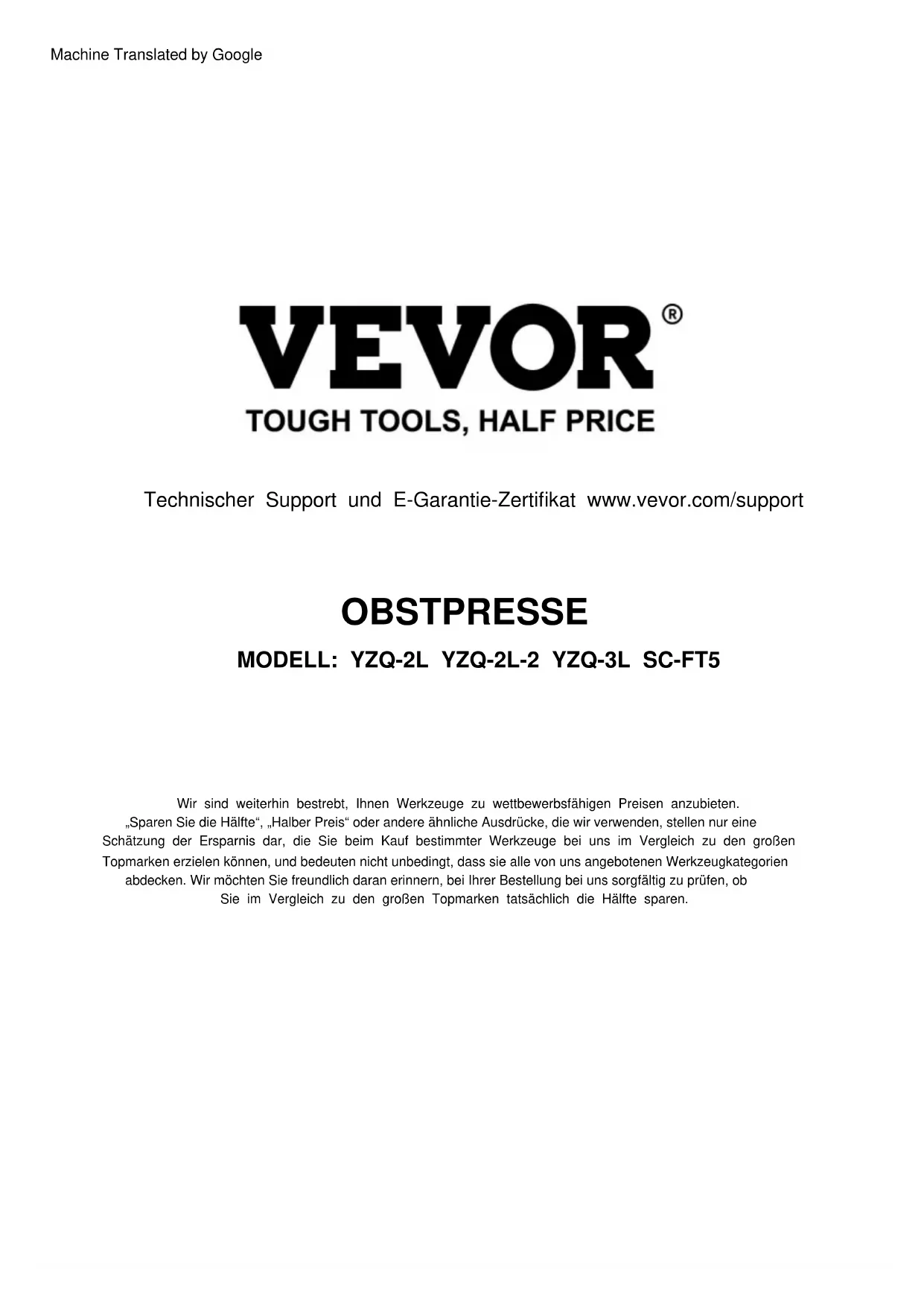 REPRÉSENTANTDUROYAUMEUNI REPRÉSENTANTDELACE Preston,RoyaumeUni GroupePooledasLtd Unité5MaisonAlbertEdward,LesPavillons RANCHOCUCAMONGA,Californie,91730ÉtatsUnisd'Amérique SHUNSHUNGmbH ImportéauxÉtatsUnis:VEVORSTOREINC,9448RINCHMONDPL#E Adresse:BaoshanquShuangchenglu803long11hao1602A1609shiShanghai Römeräcker9Z2021,76351 LinkenheimHochstetten,Allemagne Machine Translated by GoogleAssistancetechniqueetcertificatdegarantie électroniquewww.vevor.com/support Machine Translated by GoogleMODELL: YZQ-2L YZQ-2L-2 YZQ-3L SC-FT5 „Sparen Sie die Hälfte“, „Halber Preis“ oder andere ähnliche Ausdrücke, die wir verwenden, stellen nur eine Schätzung der Ersparnis dar, die Sie beim Kauf bestimmter Werkzeuge bei uns im Vergleich zu den großen Topmarken erzielen können, und bedeuten nicht unbedingt, dass sie alle von uns angebotenen Werkzeugkategorien abdecken. Wir möchten Sie freundlich daran erinnern, bei Ihrer Bestellung bei uns sorgfältig zu prüfen, ob Sie im Vergleich zu den großen Topmarken tatsächlich die Hälfte sparen. Wir sind weiterhin bestrebt, Ihnen Werkzeuge zu wettbewerbsfähigen Preisen anzubieten. OBSTPRESSE Technischer Support und E-Garantie-Zertifikat www.vevor.com/support Machine Translated by GoogleDies ist die Originalanleitung. Bitte lesen Sie alle Anweisungen sorgfältig durch, bevor Sie das Gerät in Betrieb nehmen. VEVOR behält sich eine klare Auslegung unserer Bedienungsanleitung vor. Das Erscheinungsbild des Produkts richtet sich nach dem Produkt, das Sie erhalten haben. Bitte verzeihen Sie uns, dass wir Sie nicht erneut informieren, wenn es Technologie- oder Software-Updates für unser Produkt gibt. MODELL: YZQ-2L YZQ-2L-2 YZQ-3L SC-FT5 Sie haben Fragen zu unseren Produkten? Sie benötigen technischen Support? Dann kontaktieren Sie uns gerne: Brauchen Sie Hilfe? Kontaktieren Sie uns! Obstpresse Kundenservice@vevor.com