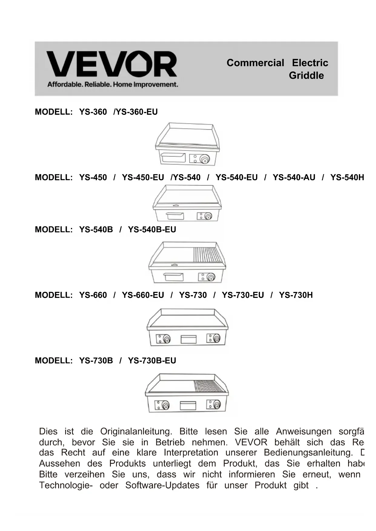 YS540EU - Grillplatte Vevor - Kostenlose Bedienungsanleitung