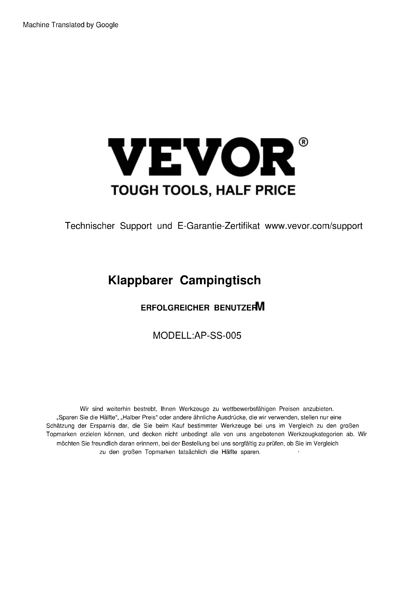 Dies ist die Originalanleitung. Bitte lesen Sie alle Anweisungen sorgfältig durch, bevor Sie das Gerät in Betrieb nehmen. VEVOR behält sich eine klare Auslegung unserer Bedienungsanleitung vor. Das Erscheinungsbild des Produkts richtet sich nach dem Produkt, das Sie erhalten haben. Bitte verzeihen Sie uns, dass wir Sie nicht erneut informieren, wenn es Technologie- oder Software-Updates für unser Produkt gibt. Sie haben Fragen zu unseren Produkten? Sie benötigen technischen Support? Dann kontaktieren Sie uns gerne: MODELL:AP-SS-005 Klappbarer Campingtisch Brauchen Sie Hilfe? Kontaktieren Sie uns! Machine Translated by GoogleStahlrahmen mit Tischplatte aus Oxford-StoffKlappbarer Campingtisch 2,3 kg ÿ720x610H Schwarz ÿ25 kg Produktfarbe: NW ( KG): Produktmaterial: Produktname: Produktgröße ( mm): Tragfähigkeit ( KG): schwere Verletzungen. BEWAHREN SIE DIESES HANDBUCH AUF WARNUNG: PRODUKTPARAMETER
