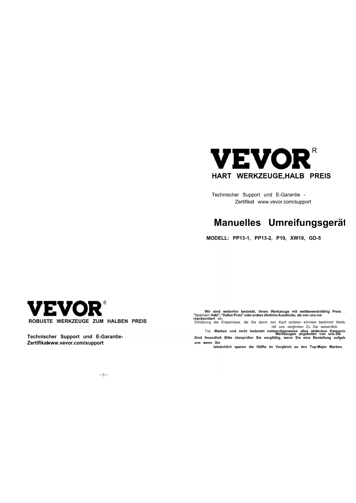 Technischer Support und E-Garantie - Zertifikat www.vevor.com/support Manuelles Umreifungsgerät MODELL: PP13-1, PP13-2, P19, XW19, GD-5 Wir sind weiterhin bestrebt, Ihnen Werkzeuge mit wettbewerbsfähig Preis . "Speichern Halb", "Halber Preis" oder andere ähnliche Ausdrücke, die von uns nur repräsentiert ein Schätzung der Ersparnisse, die Sie durch den Kauf erzielen könnten bestimmt Werkzeuge mit uns verglichen Zu Die wesentlich Top -Marken und nicht bedeutet notwendigerweise alles abdecken Kategorien von Werkzeugen angeboten von uns.Sie Sind freundlich Bitte überprüfen Sie sorgfältig, wenn Sie eine Bestellung aufgeben mit uns wenn Sie tatsächlich sparen die Hälfte im Vergleich zu den Top-Major Marken.—