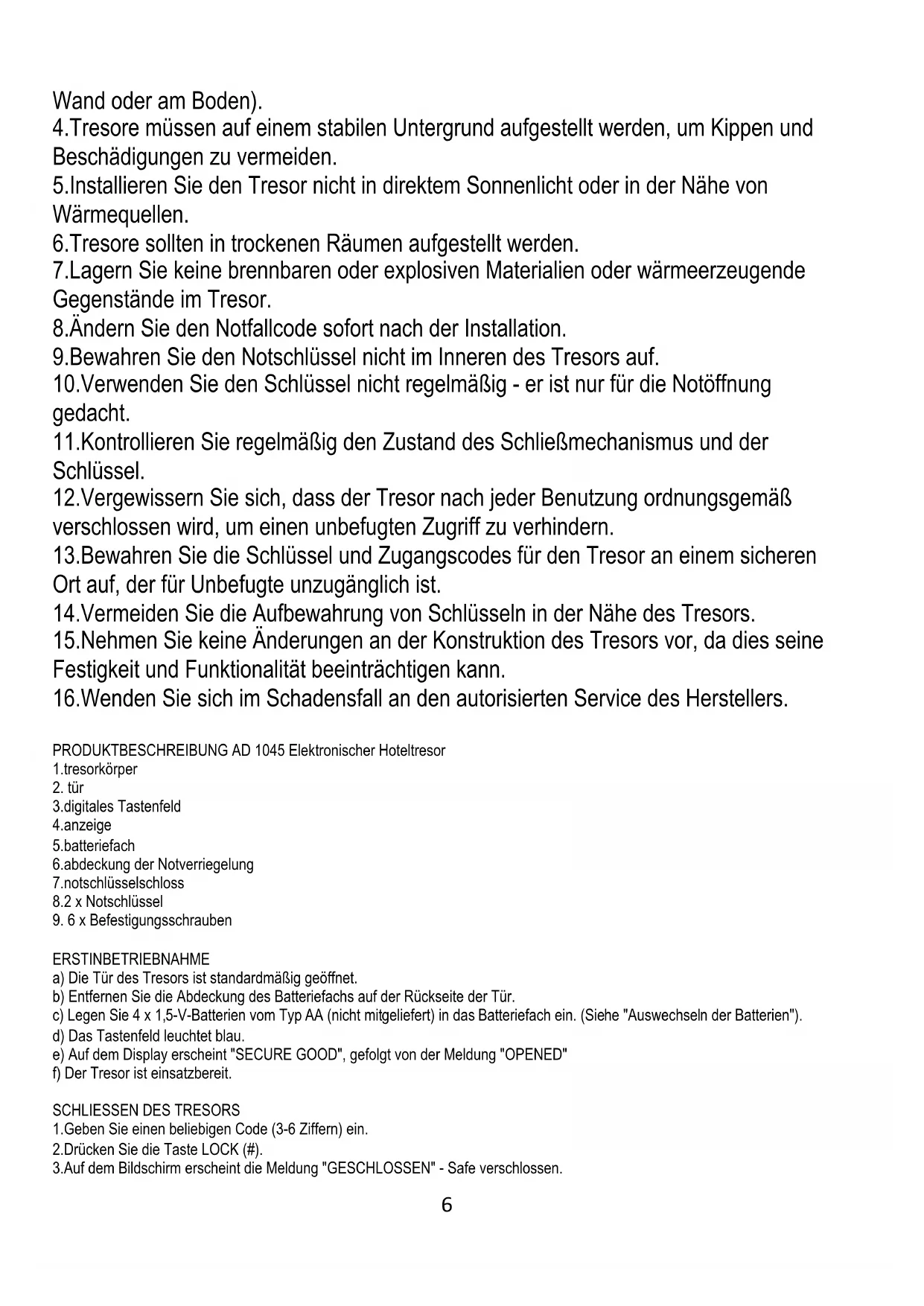 SORGFÄLTIG LESEN UND FÜR SPÄTERE VERWENDUNG AUFBEWAHREN 1.Lesen Sie die Bedienungsanleitung vor der Benutzung des Geräts und befolgen Sie die darin enthaltenen Anweisungen. Der Hersteller haftet nicht für Schäden, die durch nicht bestimmungsgemäßen Gebrauch oder unsachgemäße Handhabung des Geräts entstehen. 2.Seien Sie besonders vorsichtig, wenn Sie das Gerät in der Nähe von Kindern benutzen. Erlauben Sie Kindern nicht, mit dem Gerät zu spielen. Erlauben Sie Kindern oder anderen Personen, die nicht mit dem Gerät vertraut sind, es nicht zu benutzen. 3.Montieren Sie den Tresor vor der ersten Benutzung an einem festen Ort (z. B. an der6 Wand oder am Boden). 4.Tresore müssen auf einem stabilen Untergrund aufgestellt werden, um Kippen und Beschädigungen zu vermeiden. 5.Installieren Sie den Tresor nicht in direktem Sonnenlicht oder in der Nähe von Wärmequellen. 6.Tresore sollten in trockenen Räumen aufgestellt werden. 7.Lagern Sie keine brennbaren oder explosiven Materialien oder wärmeerzeugende Gegenstände im Tresor. 8.Ändern Sie den Notfallcode sofort nach der Installation. 9.Bewahren Sie den Notschlüssel nicht im Inneren des Tresors auf. 10.Verwenden Sie den Schlüssel nicht regelmäßig - er ist nur für die Notöffnung gedacht. 11.Kontrollieren Sie regelmäßig den Zustand des Schließmechanismus und der Schlüssel. 12.Vergewissern Sie sich, dass der Tresor nach jeder Benutzung ordnungsgemäß verschlossen wird, um einen unbefugten Zugriff zu verhindern. 13.Bewahren Sie die Schlüssel und Zugangscodes für den Tresor an einem sicheren Ort auf, der für Unbefugte unzugänglich ist. 14.Vermeiden Sie die Aufbewahrung von Schlüsseln in der Nähe des Tresors. 15.Nehmen Sie keine Änderungen an der Konstruktion des Tresors vor, da dies seine Festigkeit und Funktionalität beeinträchtigen kann. 16.Wenden Sie sich im Schadensfall an den autorisierten Service des Herstellers. PRODUKTBESCHREIBUNG AD 1045 Elektronischer Hoteltresor 1.tresorkörper