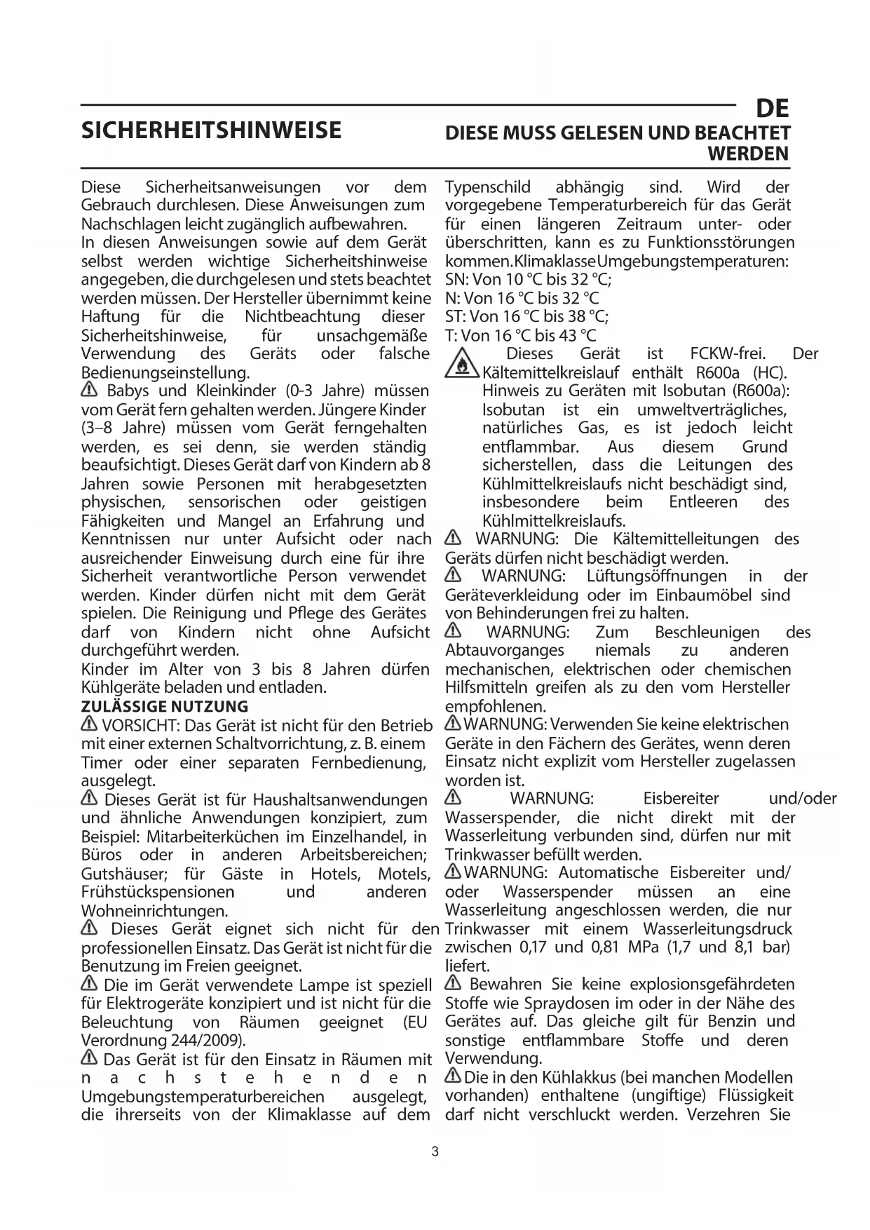 WERDEN Diese Sicherheitsanweisungen vor dem Gebrauch durchlesen. Diese Anweisungen zum Nachschlagen leicht zugänglich aufbewahren. In diesen Anweisungen sowie auf dem Gerät selbst werden wichtige Sicherheitshinweise angegeben, die durchgelesen und stets beachtet werden müssen. Der Hersteller übernimmt keine Haftung für die Nichtbeachtung dieser Sicherheitshinweise, für unsachgemäße Verwendung des Geräts oder falsche Bedienungseinstellung. Babys und Kleinkinder (0-3 Jahre) müssen vom Gerät fern gehalten werden. Jüngere Kinder (3–8 Jahre) müssen vom Gerät ferngehalten werden, es sei denn, sie werden ständig beaufsichtigt. Dieses Gerät darf von Kindern ab 8 Jahren sowie Personen mit herabgesetzten physischen, sensorischen oder geistigen Fähigkeiten und Mangel an Erfahrung und Kenntnissen nur unter Aufsicht oder nach ausreichender Einweisung durch eine für ihre Sicherheit verantwortliche Person verwendet werden. Kinder dürfen nicht mit dem Gerät spielen. Die Reinigung und Pege des Gerätes darf von Kindern nicht ohne Aufsicht durchgeführt werden. Kinder im Alter von 3 bis 8 Jahren dürfen Kühlgeräte beladen und entladen.
