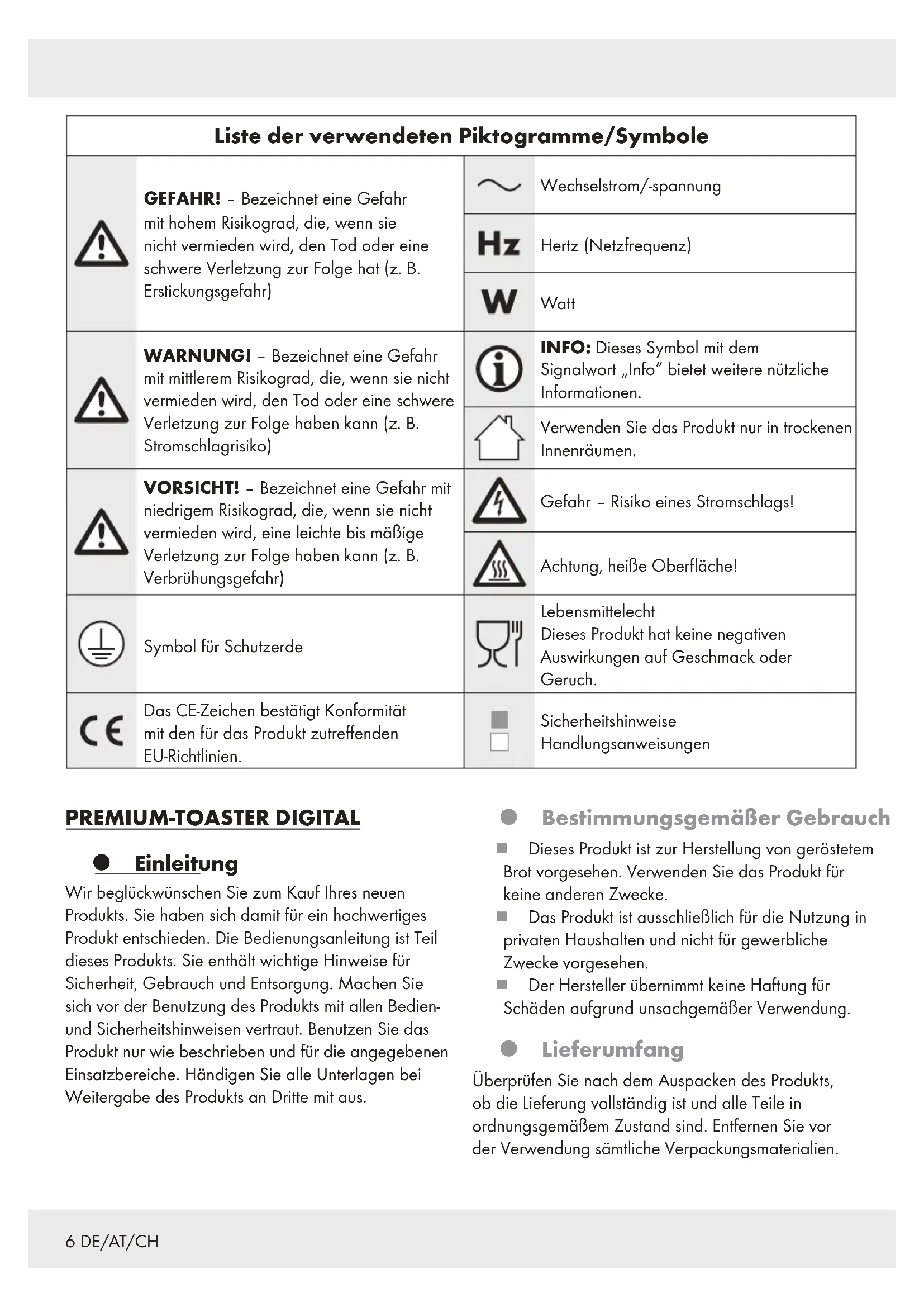 .06 DE/AT/CH Liste der verwendeten Piktogramme/Symbole GEFAHR! – Bezeichnet eine Gefahr mit hohem Risikograd, die, wenn sie nicht vermieden wird, den Tod oder eine schwere Verletzung zur Folge hat (z. B. Erstickungsgefahr) Wechselstrom/-spannung Hertz (Netzfrequenz) Watt WARNUNG! – Bezeichnet eine Gefahr mit mittlerem Risikograd, die, wenn sie nicht vermieden wird, den Tod oder eine schwere Verletzung zur Folge haben kann (z. B. Stromschlagrisiko) INFO: Dieses Symbol mit dem Signalwort „Info“ bietet weitere nützliche Informationen. Verwenden Sie das Produkt nur in trockenen Innenräumen. VORSICHT! – Bezeichnet eine Gefahr mit niedrigem Risikograd, die, wenn sie nicht vermieden wird, eine leichte bis mäßige Verletzung zur Folge haben kann (z. B. Verbrühungsgefahr) Gefahr – Risiko eines Stromschlags! Achtung, heiße Oberfläche! Symbol für Schutzerde Lebensmittelecht Dieses Produkt hat keine negativen Auswirkungen auf Geschmack oder Geruch. Das CE-Zeichen bestätigt Konformität mit den für das Produkt zutreffenden EU-Richtlinien. Sicherheitshinweise Handlungsanweisungen PREMIUM-TOASTER DIGITAL Einleitung Wir beglückwünschen Sie zum Kauf Ihres neuen Produkts. Sie haben sich damit für ein hochwertiges Produkt entschieden. Die Bedienungsanleitung ist Teil dieses Produkts. Sie enthält wichtige Hinweise für Sicherheit, Gebrauch und Entsorgung. Machen Sie sich vor der Benutzung des Produkts mit allen Bedien- und Sicherheitshinweisen vertraut. Benutzen Sie das Produkt nur wie beschrieben und für die angegebenen Einsatzbereiche. Händigen Sie alle Unterlagen bei Weitergabe des Produkts an Dritte mit aus. Bestimmungsgemäßer Gebrauch Dieses Produkt ist zur Herstellung von geröstetem Brot vorgesehen. Verwenden Sie das Produkt für keine anderen Zwecke. Das Produkt ist ausschließlich für die Nutzung in privaten Haushalten und nicht für gewerbliche Zwecke vorgesehen. Der Hersteller übernimmt keine Haftung für Schäden aufgrund unsachgemäßer Verwendung. Lieferumfang Überprüfen Sie nach dem Auspacken des Produkts, ob die Lieferung vollständig ist und alle Teile in ordnungsgemäßem Zustand sind. Entfernen Sie vor der Verwendung sämtliche Verpackungsmaterialien.7DE/AT/CH