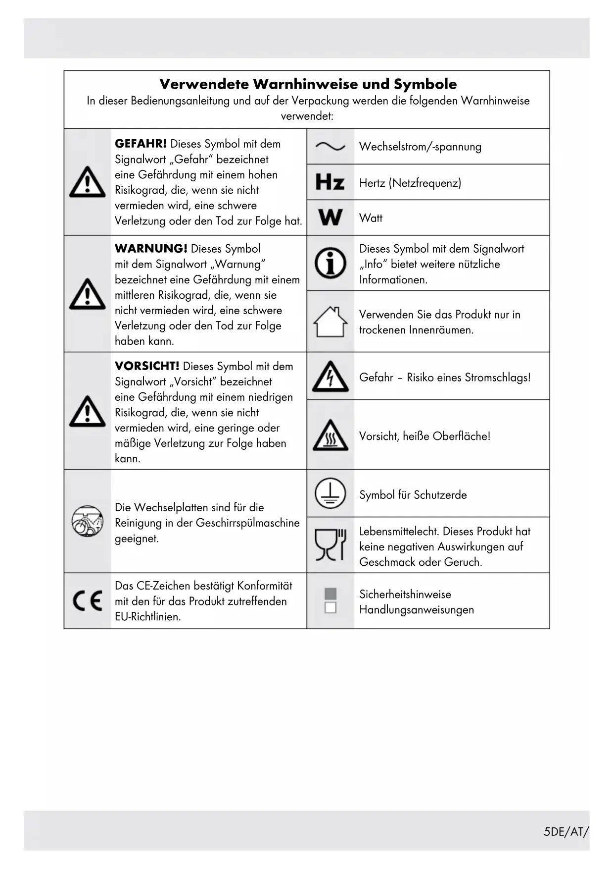 A4 DE/AT/CH Verwendete Warnhinweise und Symbole....................... Seite 5 Kurzanleitung ....................................................... Seite 6 Bestimmungsgemäßer Gebrauch........................................... Seite 6 Lieferumfang........................................................... Seite 6 Teilebeschreibung ...................................................... Seite 6 Technische Daten ....................................................... Seite 6 Sicherheitshinweise ................................................ Seite 6 Vor der ersten Verwendung....................................... Seite 10 Produkt auspacken und grundreinigen....................................... Seite 10 Verwendung ........................................................ Seite 10 Wechselplatten einsetzen und entfernen . . . . . . . . . . . . . . . . . . . . . . . . . . . . . . . . . . . . . Seite 10 Bedienung ............................................................ Seite 10 Sandwiches grillen...................................................... Seite 11 Grillen ............................................................... Seite 11 Waffeln backen ........................................................ Seite 12 Rezepte .............................................................. Seite 12 Thunfisch-Sandwich ..................................................... Seite 12 Truthahn-Sandwich...................................................... Seite 12 Monte Cristo Sandwich .................................................. Seite 13 Gegrillte Pepperoni-Pizza-Sandwiches....................................... Seite 13 Eiersalat-Sandwich...................................................... Seite 13 Belgische Waffeln ...................................................... Seite 14 Blaubeer-Waffeln ....................................................... Seite 14 Schinken-/Käsewaffeln................................................... Seite 14 Belgische Brownie-Waffeln ............................................... Seite 15 Garnelenspieße mit Pflaumen ............................................. Seite 15 Reinigung und Pflege .............................................. Seite 16 Entsorgung .......................................................... Seite 17 Garantie ............................................................. Seite 18 Abwicklung im Garantiefall ............................................... Seite 18 Service ............................................................... Seite 18 V 2.05DE/AT/CH Verwendete Warnhinweise und Symbole In dieser Bedienungsanleitung und auf der Verpackung werden die folgenden Warnhinweise verwendet: GEFAHR! Dieses Symbol mit dem Signalwort „Gefahr“ bezeichnet eine Gefährdung mit einem hohen Risikograd, die, wenn sie nicht vermieden wird, eine schwere Verletzung oder den Tod zur Folge hat. Wechselstrom/-spannung Hertz (Netzfrequenz) Watt WARNUNG! Dieses Symbol mit dem Signalwort „Warnung“ bezeichnet eine Gefährdung mit einem mittleren Risikograd, die, wenn sie nicht vermieden wird, eine schwere Verletzung oder den Tod zur Folge haben kann. Dieses Symbol mit dem Signalwort „Info“ bietet weitere nützliche Informationen. Verwenden Sie das Produkt nur in trockenen Innenräumen. VORSICHT! Dieses Symbol mit dem Signalwort „Vorsicht“ bezeichnet eine Gefährdung mit einem niedrigen Risikograd, die, wenn sie nicht vermieden wird, eine geringe oder mäßige Verletzung zur Folge haben kann. Gefahr – Risiko eines Stromschlags! Vorsicht, heiße Oberfläche! Die Wechselplatten sind für die Reinigung in der Geschirrspülmaschine geeignet. Symbol für Schutzerde Lebensmittelecht. Dieses Produkt hat keine negativen Auswirkungen auf Geschmack oder Geruch. Das CE-Zeichen bestätigt Konformität mit den für das Produkt zutreffenden EU-Richtlinien. Sicherheitshinweise Handlungsanweisungen6 DE/AT/CH SANDWICHMAKER Kurzanleitung Bei diesem Dokument handelt es sich um eine verkürzte Druckausgabe der vollständigen Bedienungsanleitung. Durch das Scannen des QR-Codes gelangen Sie direkt auf die Lidl-Service-Seite (www.lidl-service.com) und können durch die Eingabe der Artikelnummer (IAN) 472451_2407 die vollständige Bedienungsanleitung einsehen und herunterladen. Die Kurzanleitung ist Bestandteil dieses Produkts. Machen Sie sich vor der Benutzung des Produkts mit allen Bedien- und Sicherheitshinweisen vertraut. Bewahren Sie die Kurzanleitung gut auf und händigen Sie alle Unterlagen bei Weitergabe des Produkts an Dritte mit aus. Bestimmungsgemäßer Gebrauch Dieses Produkt ist zur Herstellung von Waffeln, Sandwiches und zum Grillen vorgesehen. Verwenden Sie es für keine anderen Zwecke. Das Produkt ist ausschließlich für die Nutzung in privaten Haushalten und nicht für gewerbliche Zwecke vorgesehen. Der Hersteller übernimmt keine Haftung für Schäden aufgrund unsachgemäßer Verwendung. Lieferumfang 1× Sandwichmaker 3× Austauschbare Wechselplatten-Sets 1× Bedienungsanleitung Teilebeschreibung [1] Verriegelung [2] Rote Kontrollleuchte (Betrieb) [3] Grüne Kontrollleuchte (Heizen) [4] Anschlussleitung mit Netzstecker [5] Kabelaufwicklung [6] Heizelement [7] Große Hakenklemme [8] Entriegelungshebel [9] Äußere Rastnase (klein) [] Innere Rastnase (groß) [] Sandwich-Platte (obere und untere Platte) [] Grill-Platte (obere und untere Platte) [] Waffel-Platte (obere und untere Platte) [] Deckel [] Griff Technische Daten Eingangsspannung: 220–240 V∼, 50–60Hz Leistungsaufnahme: 750 W Schutzklasse: I HG09121: GS (TÜV SÜD) HG09121-CH: – HG09121-BS: – Sicherheitshinweise