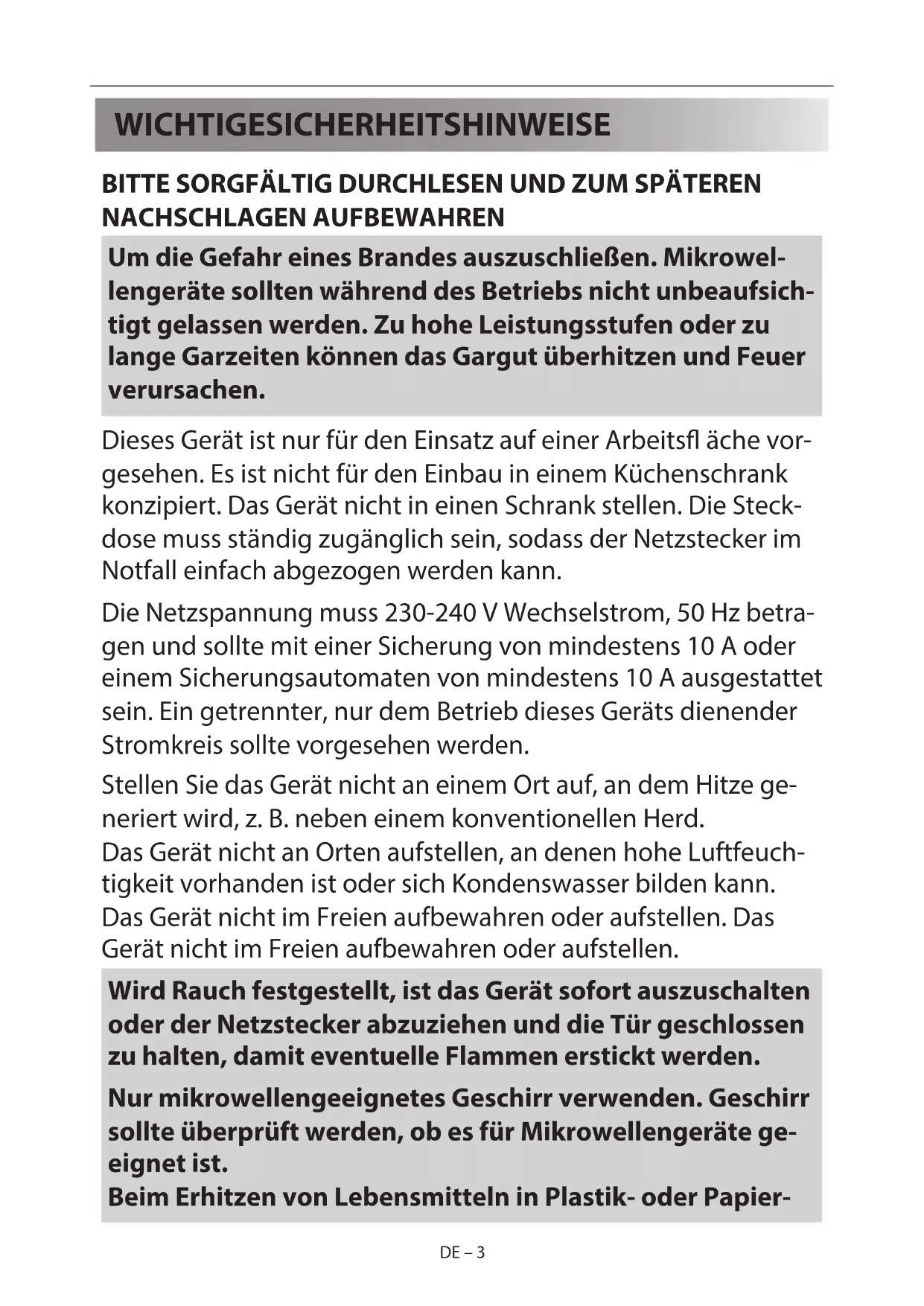 - - Nur für Modelle mit Grill.DE – 3 DE – 3 WICHTIGE SICHERHEITSHINWEISE BITTE SORGFÄLTIG DURCHLESEN UND ZUM SPÄTEREN NACHSCHLAGEN AUFBEWAHREN Um die Gefahr eines Brandes auszuschließen. Mikrowel- lengeräte sollten während des Betriebs nicht unbeaufsich- tigt gelassen werden. Zu hohe Leistungsstufen oder zu lange Garzeiten können das Gargut überhitzen und Feuer verursachen. Dieses Gerät ist nur für den Einsatz auf einer Arbeits äche vor- gesehen. Es ist nicht für den Einbau in einem Küchenschrank konzipiert. Das Gerät nicht in einen Schrank stellen. Die Steck- dose muss ständig zugänglich sein, sodass der Netzstecker im Notfall einfach abgezogen werden kann. Die Netzspannung muss 230-240 V Wechselstrom, 50 Hz betra- gen und sollte mit einer Sicherung von mindestens 10 A oder einem Sicherungsautomaten von mindestens 10 A ausgestattet sein. Ein getrennter, nur dem Betrieb dieses Geräts dienender Stromkreis sollte vorgesehen werden. Stellen Sie das Gerät nicht an einem Ort auf, an dem Hitze ge- neriert wird, z. B. neben einem konventionellen Herd. Das Gerät nicht an Orten aufstellen, an denen hohe Luftfeuch- tigkeit vorhanden ist oder sich Kondenswasser bilden kann. Das Gerät nicht im Freien aufbewahren oder aufstellen. Das Gerät nicht im Freien aufbewahren oder aufstellen. Wird Rauch festgestellt, ist das Gerät sofort auszuschalten oder der Netzstecker abzuziehen und die Tür geschlossen zu halten, damit eventuelle Flammen erstickt werden. Nur mikrowellengeeignetes Geschirr verwenden. Geschirr sollte überprüft werden, ob es für Mikrowellengeräte ge- eignet ist. Beim Erhitzen von Lebensmitteln in Plastik- oder Papier- DE – 4DE – 4 behältern müssen Sie das Gerät überwachen, da sich diese entzünden könnten. Reinigen Sie die Abdeckung des Hohlleiters und den Gar- raum. Sie müssen trocken und frei von Fett sein. Angesam- meltes Fett könnte sich überhitzen, zu rauchen anfangen oder Feuer fangen. Keine brennbaren Materialien in der Nähe desGerätes oder den Lüftungsö nungen aufbewahren. Niemals die Lüftungsö - nungen blockieren. Alle Metallverschlüsse, Drähte usw. von Lebensmitteln und Ver- packungen entfernen. Funkenbildung auf Metallober ächen kann zu Feuer führen. Das Mikrowellengerät nicht zum Frittierenvon Lebensmitteln in Öl oder Fett verwenden.Die Temperatur kann nicht kontrol- liert werden und das Fett kann sich entzünden. Zum Herstellen von Popcorn sollte nur fürMikrowellengeräte vorgesehenes Popcorn-Geschirr verwendet werden. Keine Lebensmittel oder andere Gegenstände im Gerät lagern. Die Einstellungen nach dem Starten des Gerätes überprüfen, um sicherzustellen, dass das Gerät wie gewünscht arbeitet. Lassen Sie den Ofen beim Betrieb nicht unbeaufsichtigt. Zur Vermeidung von Überhitzung und Feuer sollte besonders vorsichtig vorgegangen werden, wenn Lebensmittel mit einem besonders hohen Zucker- oder Fettgehalt gegart oder aufge- wärmt werden, wie z.B. Würstchen, Kuchen oder weihnachtli- che Süßspeisen. Beachten Sie die entsprechenden Hinweise in dieser Bedienungsanleitung. Zur Vermeidung von Verletzungen. WARNUNG: Das Gerät nicht betreiben, wenn es beschädigt ist oder Fehl- funktionen aufweist. Überprüfen Sie vor dem Betrieb die folgenden Punkte:DE DE – 3DE – 3 WICHTIGE SICHERHEITSHINWEISE BITTE SORGFÄLTIG DURCHLESEN UND ZUM SPÄTEREN NACHSCHLAGEN AUFBEWAHREN Um die Gefahr eines Brandes auszuschließen. Mikrowel- lengeräte sollten während des Betriebs nicht unbeaufsich- tigt gelassen werden. Zu hohe Leistungsstufen oder zu lange Garzeiten können das Gargut überhitzen und Feuer verursachen. Dieses Gerät ist nur für den Einsatz auf einer Arbeits äche vor- gesehen. Es ist nicht für den Einbau in einem Küchenschrank konzipiert. Das Gerät nicht in einen Schrank stellen. Die Steck- dose muss ständig zugänglich sein, sodass der Netzstecker im Notfall einfach abgezogen werden kann. Die Netzspannung muss 230-240 V Wechselstrom, 50 Hz betra- gen und sollte mit einer Sicherung von mindestens 10 A oder einem Sicherungsautomaten von mindestens 10 A ausgestattet sein. Ein getrennter, nur dem Betrieb dieses Geräts dienender Stromkreis sollte vorgesehen werden. Stellen Sie das Gerät nicht an einem Ort auf, an dem Hitze ge- neriert wird, z. B. neben einem konventionellen Herd. Das Gerät nicht an Orten aufstellen, an denen hohe Luftfeuch- tigkeit vorhanden ist oder sich Kondenswasser bilden kann. Das Gerät nicht im Freien aufbewahren oder aufstellen. Das Gerät nicht im Freien aufbewahren oder aufstellen. Wird Rauch festgestellt, ist das Gerät sofort auszuschalten oder der Netzstecker abzuziehen und die Tür geschlossen zu halten, damit eventuelle Flammen erstickt werden. Nur mikrowellengeeignetes Geschirr verwenden. Geschirr sollte überprüft werden, ob es für Mikrowellengeräte ge- eignet ist. Beim Erhitzen von Lebensmitteln in Plastik- oder Papier- DE – 4 DE – 4 behältern müssen Sie das Gerät überwachen, da sich diese entzünden könnten. Reinigen Sie die Abdeckung des Hohlleiters und den Gar- raum. Sie müssen trocken und frei von Fett sein. Angesam- meltes Fett könnte sich überhitzen, zu rauchen anfangen oder Feuer fangen. Keine brennbaren Materialien in der Nähe desGerätes oder den Lüftungsö nungen aufbewahren. Niemals die Lüftungsö - nungen blockieren. Alle Metallverschlüsse, Drähte usw. von Lebensmitteln und Ver- packungen entfernen. Funkenbildung auf Metallober ächen kann zu Feuer führen. Das Mikrowellengerät nicht zum Frittierenvon Lebensmitteln in Öl oder Fett verwenden.Die Temperatur kann nicht kontrol- liert werden und das Fett kann sich entzünden. Zum Herstellen von Popcorn sollte nur fürMikrowellengeräte vorgesehenes Popcorn-Geschirr verwendet werden. Keine Lebensmittel oder andere Gegenstände im Gerät lagern. Die Einstellungen nach dem Starten des Gerätes überprüfen, um sicherzustellen, dass das Gerät wie gewünscht arbeitet. Lassen Sie den Ofen beim Betrieb nicht