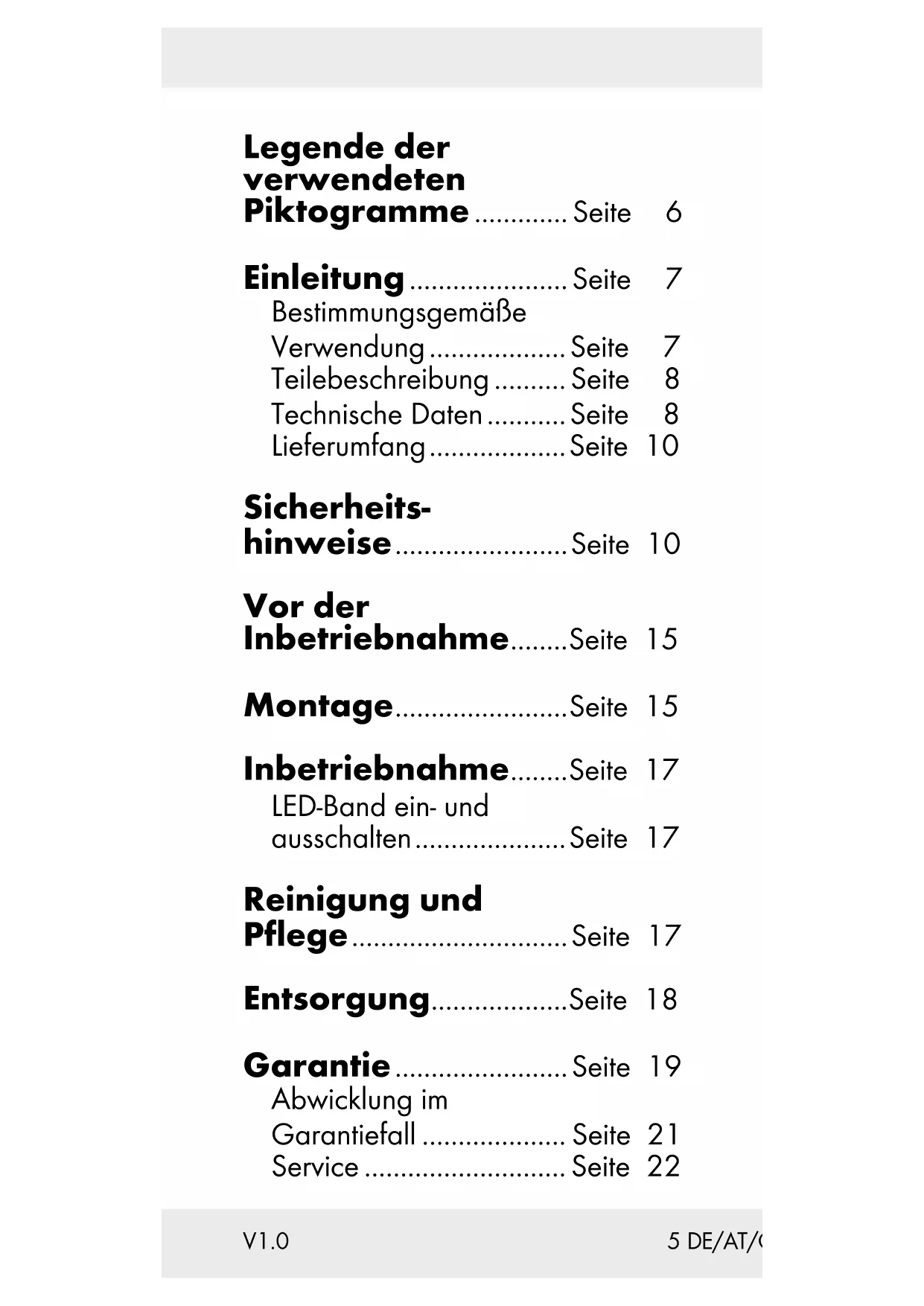35 DE/AT/CH Legende der verwendeten Piktogramme ............. Seite 6 Einleitung ...................... Seite 7 Bestimmungsgemäße Verwendung ................... Seite 7 Teilebeschreibung .......... Seite 8 Technische Daten ........... Seite 8 Lieferumfang ................... Seite 10 Sicherheits - hinweise ........................ Seite 10 Vor der Inbetriebnahme ........ Seite 15 Montage ........................ Seite 15 Inbetriebnahme ........ Seite 17 LED-Band ein- und ausschalten ..................... Seite 17 Reinigung und Pflege .............................. Seite 17 Entsorgung ................... Seite 18 Garantie ........................ Seite 19 Abwicklung im Garantiefall .................... Seite 21 Service ............................ Seite 22 V1.06 DE/AT/CH Legende der verwendeten Piktogramme Gleichstrom / -spannung Wechselstrom / -spannung Schutzklasse II Unabhängiges Betriebsgerät Kurzschlussfester Sicherheitstransformator Nicht dimmbar Das CE-Zeichen bestätigt die Konformität mit den für das Produkt zutref- fenden EU-Richtlinien.7 DE/AT/CH LED-Band, 1 m Einleitung Wir beglückwünschen Sie zum Kauf Ihres neuen Produkts. Sie haben sich damit für ein hochwertiges Produkt entschieden. Die Bedienungsanlei- tung ist Teil dieses Produkts. Sie ent- hält wichtige Hinweise für Sicherheit, Gebrauch und Entsorgung. Machen Sie sich vor der Benutzung des Pro- dukts mit allen Bedien- und Sicher- heitshinweisen vertraut. Benutzen Sie das Produkt nur wie beschrieben und für die angegebenen Einsatzbe- reiche. Händigen Sie alle Unterla- gen bei Weitergabe des Produkts an Dritte mit aus. Bestimmungsgemäße Verwendung Das Produkt ist für den Betrieb im Innenbereich geeignet und nur für den Einsatz in privaten Haushalten vorgesehen und nicht für den8 DE/AT/CH Gebrauch in anderen Anwendungs- bereichen. Das Produkt kann auf allen normal entflammbaren, glatten Ober- flächen aufgeklebt werden. Das Pro- dukt ist nicht für den gewerblichen