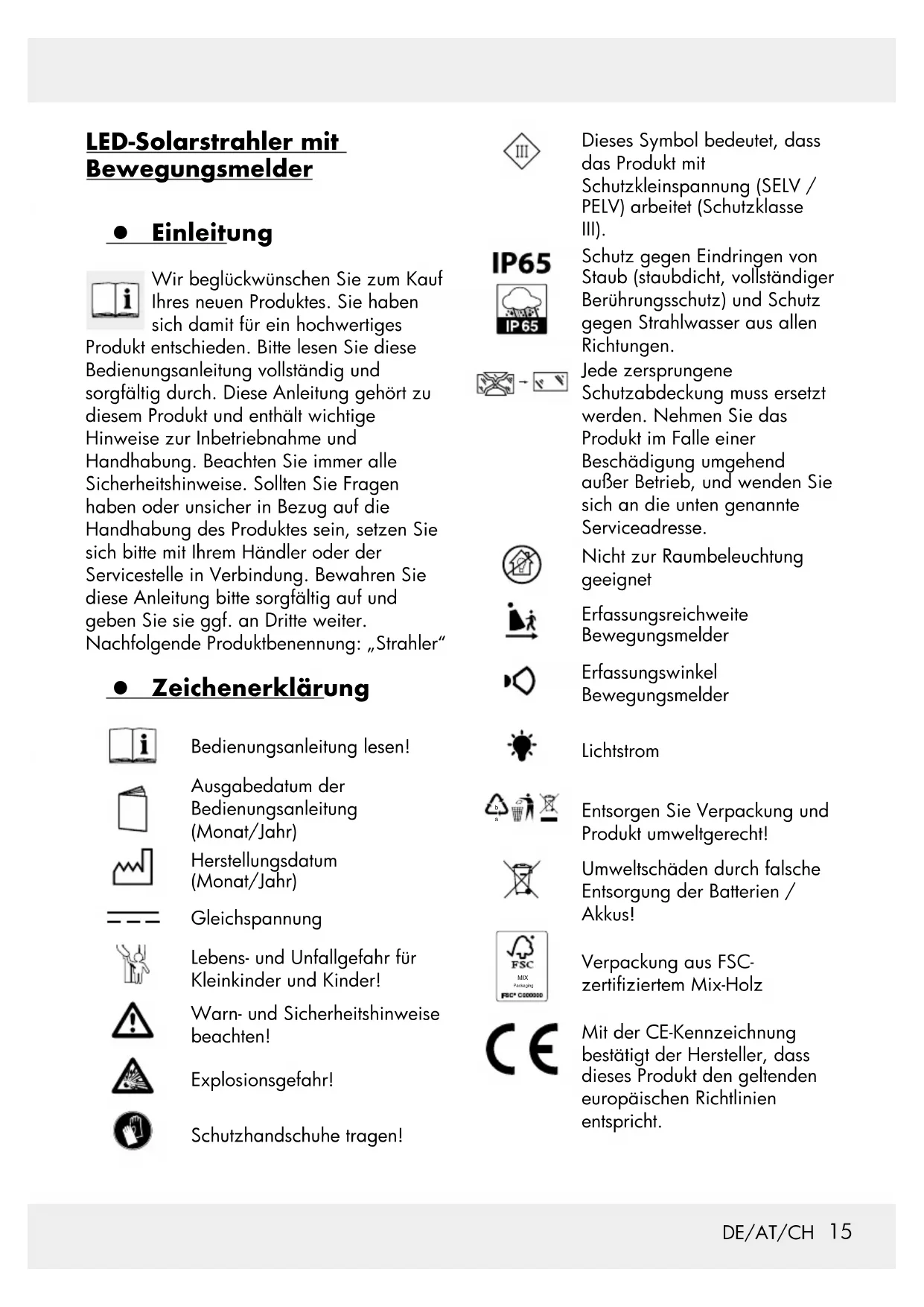 Servis Česko Tel. : 00800 80040044 E-Mail: administration@mynetsend.de IAN 375304_2101 Pro jakékoli dotazy mějte prosím připravenou pokladní stvrzenku a číslo položky (např. IAN 123456) jako doklad o koupi. Aktuální návod k obsluze najdete na webu www.citygate24.de15 DE/AT/CH LED-Solarstrahler mit Bewegungsmelder z Einleitung Wir beglückwünschen Sie zum Kauf Ihres neuen Produktes. Sie haben sich damit für ein hochwertiges Produkt entschieden. Bitte lesen Sie diese Bedienungsanleitung vollständig und sorgfältig durch. Diese Anleitung gehört zu diesem Produkt und enthält wichtige Hinweise zur Inbetriebnahme und Handhabung. Beachten Sie immer alle Sicherheitshinweise. Sollten Sie Fragen haben oder unsicher in Bezug auf die Handhabung des Produktes sein, setzen Sie sich bitte mit Ihrem Händler oder der Servicestelle in Verbindung. Bewahren Sie diese Anleitung bitte sorgfältig auf und geben Sie sie ggf. an Dritte weiter. Nachfolgende Produktbenennung: „Strahler“ z Zeichenerklärung Bedienungsanleitung lesen! Ausgabedatum der Bedienungsanleitung (Monat/Jahr) Herstellungsdatum (Monat/Jahr) Gleichspannung Lebens- und Unfallgefahr für Kleinkinder und Kinder! Warn- und Sicherheitshinweise beachten! Explosionsgefahr! Schutzhandschuhe tragen! Dieses Symbol bedeutet, dass das Produkt mit Schutzkleinspannung (SELV / PELV) arbeitet (Schutzklasse III). Schutz gegen Eindringen von Staub (staubdicht, vollständiger Berührungsschutz) und Schutz gegen Strahlwasser aus allen Richtungen. Jede zersprungene Schutzabdeckung muss ersetzt werden. Nehmen Sie das Produkt im Falle einer Beschädigung umgehend außer Betrieb, und wenden Sie sich an die unten genannte Serviceadresse. Nicht zur Raumbeleuchtung geeignet Erfassungsreichweite Bewegungsmelder Erfassungswinkel Bewegungsmelder Lichtstrom