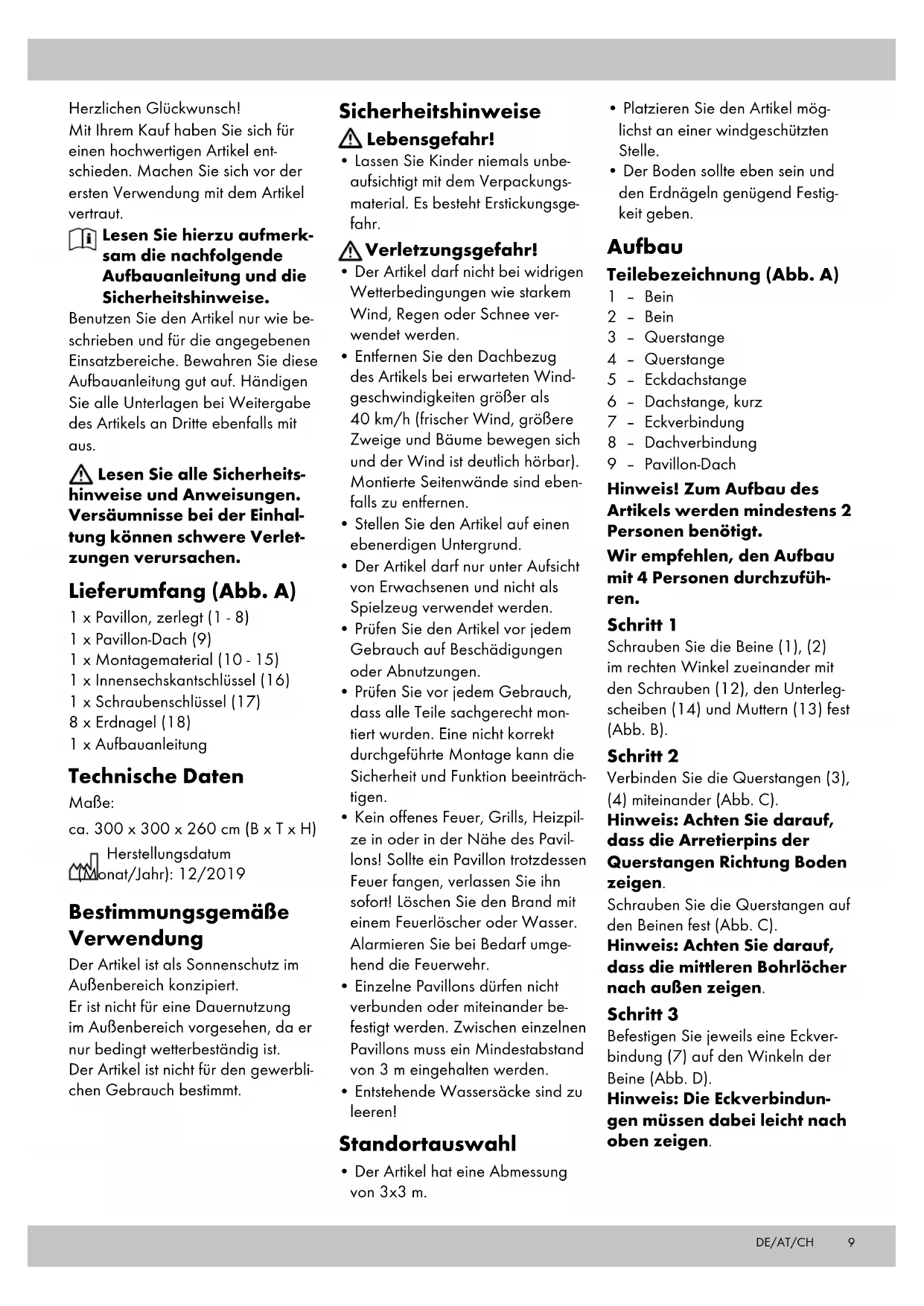 Herzlichen Glückwunsch! Mit Ihrem Kauf haben Sie sich für einen hochwertigen Artikel ent- schieden. Machen Sie sich vor der ersten Verwendung mit dem Artikel vertraut. Lesen Sie hierzu aufmerk- sam die nachfolgende Aufbauanleitung und die Sicherheitshinweise. Benutzen Sie den Artikel nur wie be- schrieben und für die angegebenen Einsatzbereiche. Bewahren Sie diese Aufbauanleitung gut auf. Händigen Sie alle Unterlagen bei Weitergabe des Artikels an Dritte ebenfalls mit aus. Lesen Sie alle Sicherheits- hinweise und Anweisungen. Versäumnisse bei der Einhal- tung können schwere Verlet- zungen verursachen. Lieferumfang (Abb. A) 1 x Pavillon, zerlegt (1 - 8) 1 x Pavillon-Dach (9) 1 x Montagematerial (10 - 15) 1 x Innensechskantschlüssel (16) 1 x Schraubenschlüssel (17) 8 x Erdnagel (18) 1 x Aufbauanleitung Technische Daten Maße: ca. 300 x 300 x 260 cm (B x T x H) Herstellungsdatum (Monat/Jahr): 12/2019 Bestimmungsgemäße Verwendung Der Artikel ist als Sonnenschutz im Außenbereich konzipiert. Er ist nicht für eine Dauernutzung im Außenbereich vorgesehen, da er nur bedingt wetterbeständig ist. Der Artikel ist nicht für den gewerbli- chen Gebrauch bestimmt. Sicherheitshinweise Lebensgefahr!