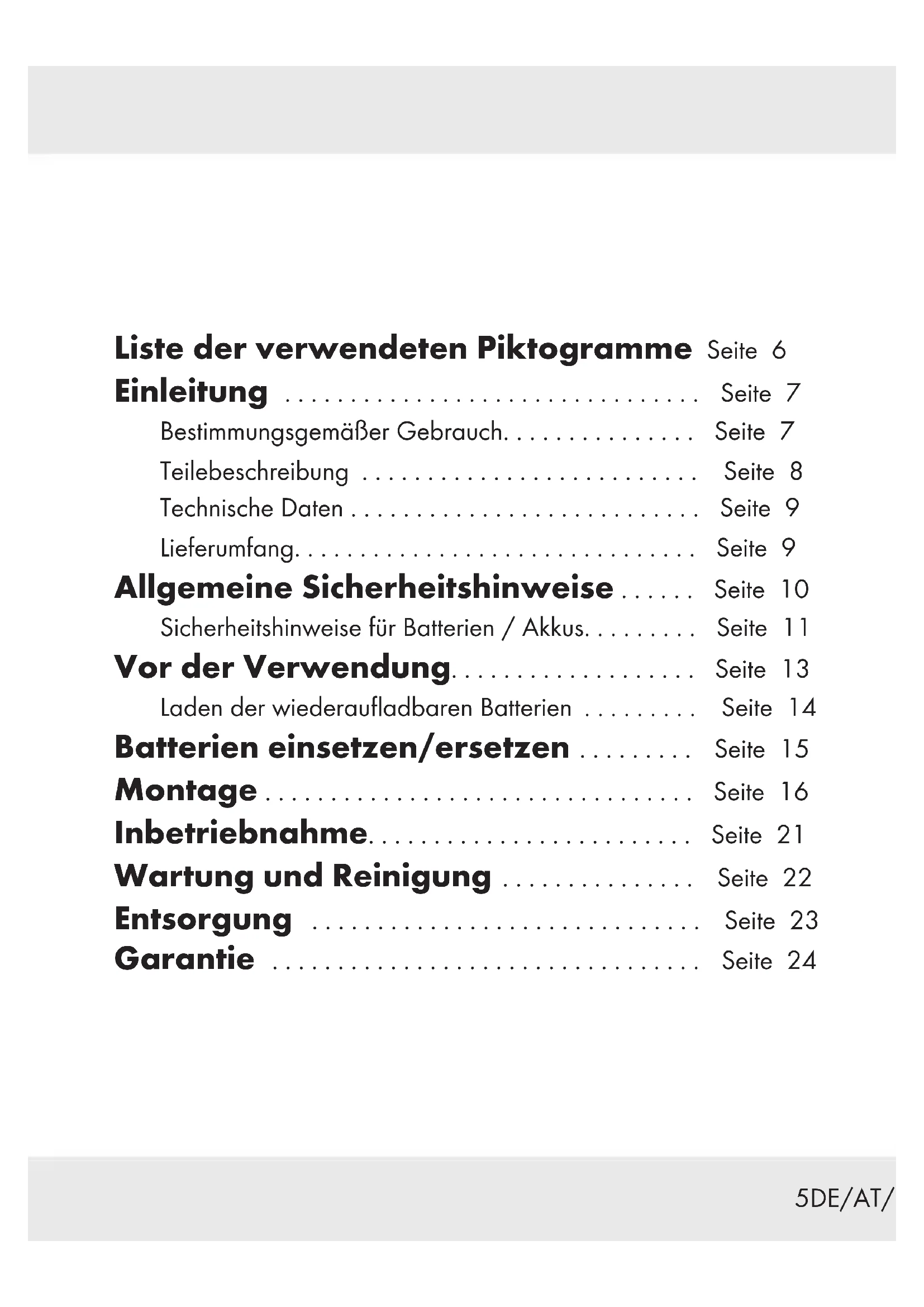 35DE/AT/CH Liste der verwendeten Piktogramme Seite 6 Einleitung ................................ Seite 7 Bestimmungsgemäßer Gebrauch............... Seite 7 Teilebeschreibung .......................... Seite 8 Technische Daten ........................... Seite 9 Lieferumfang............................... Seite 9 Allgemeine Sicherheitshinweise . . . . . . Seite 10 Sicherheitshinweise für Batterien/ Akkus......... Seite 11 Vor der Verwendung................... Seite 13 Laden der wiederaufladbaren Batterien ......... Seite 14 Batterien einsetzen/ersetzen ......... Seite 15 Montage ................................. Seite 16 Inbetriebnahme......................... Seite 21 Wartung und Reinigung ............... Seite 22 Entsorgung .............................. Seite 23 Garantie ................................. Seite 246 DE/AT/CH Liste der verwendeten Piktogramme Gleichstrom/-spannung Das CE-Zeichen bestätigt Konformität mit den für das Produkt zutreffenden EU-Richtlinien. Reichweite des Bewegungssensors ca. 5 – 8m Erkennungswinkel des Bewegungssensors: ca. 90º IP-Schutzart: IP44 (spritzwasserfest) Batterien mitgeliefert (Ni-MH) Beleuchtungsdauer (nach Aktivierung): ca.30Sekunden7DE/AT/CH LED-SOLARSTRAHLER Einleitung Wir beglückwünschen Sie zum Kauf Ihres neuen Produkts. Sie haben sich damit für ein hochwertiges Produkt entschieden. Die Bedienungsanleitung ist Teil dieses Produkts. Sie enthält wichtige Hinweise für Sicherheit, Gebrauch und Entsorgung. Machen Sie sich vor der Benutzung des Produkts mit allen Bedien- und Sicherheitshinweisen vertraut. Benutzen Sie das Produkt nur wie beschrieben und für die angegebenen Einsatzbereiche. Händigen Sie alle Unterlagen bei Weitergabe des Produkts an Dritte mit aus. Bestimmungsgemäßer Gebrauch Das Produkt ist zur Beleuchtung von Außenbereichen ohne Stromanschluss vorgesehen. Das Produkt ist zur Nutzung in Privathaushalten vorgesehen und nicht für gewerbliche Zwecke oder andere Anwendungen geeignet. Nicht zur normalen Raumbeleuchtung im Haushalt geeignet.8 DE/AT/CH Teilebeschreibung [1] Solar-Paneel [2] ON-/OFF-Schalter (ein/aus) [3] Strahler [4] Sensor [5] Dübel (Montageplatte) [6] Montageplatte [7] Kugelgelenk-Abdeckung [8] Schraube (Montageplatte) [9] Öffnung