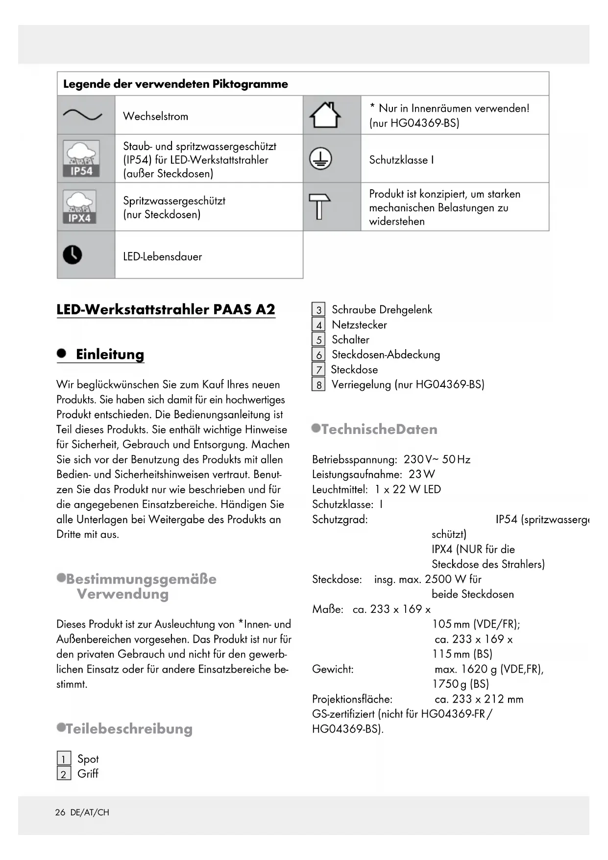 Verriegelung (nur HG04369-BS) Technische Daten Betriebsspannung: 230 V∼ 50 Hz Leistungsaufnahme: 23 W Leuchtmittel: 1 x 22 W LED Schutzklasse: I Schutzgrad: IP54 (spritzwasserge- schützt) IPX4 (NUR für die Steckdose des Strahlers) Steckdose: insg. max. 2500 W für beide Steckdosen Maße: ca. 233 x 169 x 105 mm (VDE/FR); ca. 233 x 169 x 115 mm (BS) Gewicht: max. 1620 g (VDE,FR), 1750 g (BS) Projektionsfläche: ca. 233 x 212 mm GS-zertifiziert (nicht für HG04369-FR / HG04369-BS).27 DE/AT/CH Risikogruppe 2 Vorsicht! Gefährliche optische Strahlungen könnten von diesem Produkt ausgehen. Nicht in den Strahl blicken. Dies könnte schädlich für das Auge sein. Produkt getestet gemäß EN62471 Lieferumfang Kontrollieren Sie unmittelbar nach dem Auspacken immer den Lieferumfang auf Vollständigkeit sowie den einwandfreien Zustand des Produkts. 1 LED-Werkstatt-Scheinwerfer 1 Bedienungs anleitung Allgemeine Sicherheitshinweise MACHEN SIE SICH VOR DER ERSTEN BENUT-