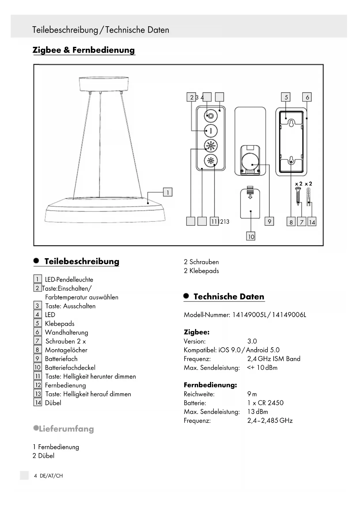 Dübel Lieferumfang 1 Fernbedienung 2 Dübel 2 Schrauben 2 Klebepads Technische Daten Modell-Nummer: 14149005L / 14149006L Zigbee: Version: 3.0 Kompatibel: iOS 9.0 / Android 5.0 Frequenz: 2,4 GHz ISM Band Max. Sendeleistung: <+ 10 dBm Fernbedienung: Reichweite: 9 m Batterie: 1 x CR 2450 Max. Sendeleistung: 13 dBm Frequenz: 2,4‒2,485 GHz Leuchte zurücksetzen / Fernbedienung und Smartphone mit der ...5 DE/AT/CH Teilebeschreibung / Technische Daten Leuchte zurücksetzen / Fernbedienung und Smartphone mit der ... Leuchte zurücksetzen Um die Leuchte mit der App oder der Fernbedienung zu verbinden, muss sich die Leuchte im Anlernmodus befinden. Dieser wird durch ein regelmäßiges Blin- ken der Leuchte angezeigt. Sollte die Leuchte nicht von selbst blinken, muss die Leuchte in den Anlernmodus zurückgesetzt werden. Um den Anlernmodus zu aktivieren, schalten Sie die Leuchte bitte in folgendem Rhythmus ein und aus: – 10 Sek. aus – 1 Sek. ein – 3 Sek. aus – 1 Sek. ein – 3 Sek. aus – Einschalten Die Leuchte sollte nun im Anlernmodus regelmäßig blinken. Hinweis: Dieser Vorgang setzt das Produkt nur in den Offline-Modus zurück und startet den Anlernmodus. Wenn Sie alle Daten des Produkts und der Cloud entfernen möchten, lesen Sie bitte den Abschnitt „Smartphone trennen“. Folgen Sie den Anweisungen und wählen Sie bei „Gerät entfernen“ den Punkt „Trennen und Daten löschen“. Fernbedienung und Smartphone mit der LED-Pendelleuchte verbinden Hinweis: Hinweise zur Datenschutzrichtlinie entnehmen Sie bitte der „Lidl Home“ App.