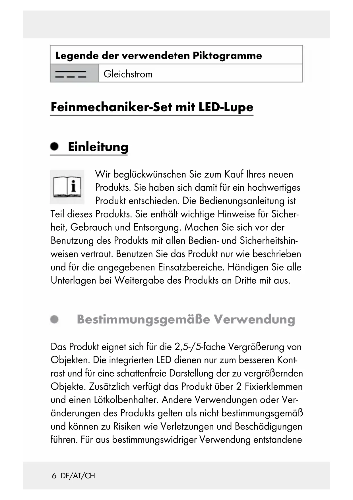 13 135 DE/AT/CH Legende der verwendeten Piktogramme .................................................... Seite 6 Einleitung .............................................................. Seite 6 Bestimmungsgemäße Verwendung .........................Seite 6 Teilebeschreibung ....................................................Seite 7 Technische Daten ..................................................... Seite 8 Lieferumfang ............................................................. Seite 8 Sicherheit ..............................................................Seite 9 Allgemeine Sicherheitshinweise ..............................Seite 9 Sicherheitshinweise für Batterien / Akkus ................Seite 11 Vor der Inbetriebnahme .........................Seite 12 Batterien einsetzen ................................................... Seite 12 Reparaturvorrichtung anbringen .............................Seite 13 Lupe montieren ......................................................... Seite 13 Standfuß platzieren ..................................................Seite 14 Gebrauch ..............................................................Seite 14 Verwendung des Produkts ....................................... Seite 14 Batterien wechseln ...................................................Seite 15 Fehler beheben ...............................................Seite 15 Reinigung und Pflege .................................Seite 16 Entsorgung .......................................................... Seite 17 Service ....................................................................Seite 186 DE/AT/CH Legende der verwendeten Piktogramme Gleichstrom Feinmechaniker-Set mit LED-Lupe Einleitung Wir beglückwünschen Sie zum Kauf Ihres neuen Produkts. Sie haben sich damit für ein hochwertiges Produkt entschieden. Die Bedienungsanleitung ist Teil dieses Produkts. Sie enthält wichtige Hinweise für Sicher- heit, Gebrauch und Entsorgung. Machen Sie sich vor der Benutzung des Produkts mit allen Bedien- und Sicherheitshin- weisen vertraut. Benutzen Sie das Produkt nur wie beschrieben und für die angegebenen Einsatzbereiche. Händigen Sie alle Unterlagen bei Weitergabe des Produkts an Dritte mit aus. Bestimmungsgemäße Verwendung Das Produkt eignet sich für die 2,5-/5-fache Vergrößerung von Objekten. Die integrierten LED dienen nur zum besseren Kont- rast und für eine schattenfreie Darstellung der zu vergrößernden Objekte. Zusätzlich verfügt das Produkt über 2 Fixierklemmen und einen Lötkolbenhalter. Andere Verwendungen oder Ver- änderungen des Produkts gelten als nicht bestimmungsgemäß und können zu Risiken wie Verletzungen und Beschädigungen führen. Für aus bestimmungswidriger Verwendung entstandene7 DE/AT/CH Schäden übernimmt der Hersteller keine Haftung. Das Produkt ist ausschließlich für den Betrieb im Innenbereich geeignet. Das Produkt ist nicht für den kommerziellen Gebrauch oder für andere Anwendungsbereiche vorgesehen. Dieses Produkt ist nicht zur Raum beleuchtung im Haushalt geeignet. Teilebeschreibung