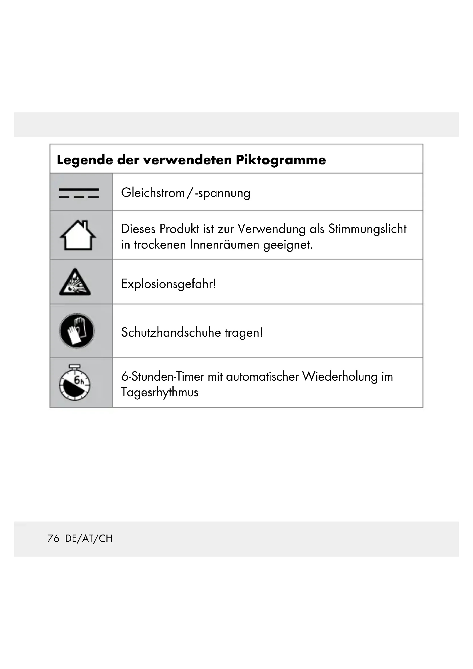Schalter Technische Daten HG01039A/HG01039C: Betriebsspannung: 4,5 V Leistung: 0,15 W Leuchtmittel: 1 LED (Die LED ist nicht austauschbar.) Batterien: 3 x 1,5 V , LR03 (Typ AAA) Leuchtdauer: ca. 150 Stunden79 DE/AT/CH HG01039B/HG01039D: Betriebsspannung: 3 V Leistung: 0,015 W Leuchtmittel: 1 LED (Die LED ist nicht austauschbar.) Batterie: 3 V , Knopfzelle (Typ CR2032) Leuchtdauer: ca. 70 Stunden Lieferumfang HG01039A/HG01039C: 2 LED-Echtwachskerzen 6 LR03-Batterien (Typ AAA) 1 Bedienungsanleitung HG01039B/HG01039D: 4 LED-Echtwachskerzen 4 Batterien - Knopfzelle (Typ CR2032) 1 Bedienungsanleitung80 DE/AT/CH Allgemeine Sicherheitshinweise Machen Sie sich vor der ersten Benutzung des Produkts mit allen Bedien- und Sicherheitshinweisen vertraut! Händigen Sie alle Unterlagen bei Weitergabe des Produkts an Dritte ebenfalls mit aus! Dieses Produkt kann von Kindern ab 8 Jahren und darüber sowie von Personen mit verringerten physischen, sensorischen oder men- talen Fähigkeiten oder Mangel an Erfahrung und Wissen benutzt werden, wenn sie beaufsichtigt oder bezüglich des sicheren Ge- brauchs des Produkts unterwiesen wurden und die daraus resul- tierenden Gefahren verstehen. Kinder dürfen nicht mit dem Produkt spielen. Reinigung und Benutzerwartung dürfen nicht von Kindern ohne Beaufsichtigung durchgeführt werden. Setzen Sie das Produkt keinen Witterungseinflüssen aus. Ansonsten droht eine Beschädigung des Produkts. Setzen Sie das Produkt keiner direkten Sonneneinstrahlung aus. Positionieren Sie es nicht über Heizkörpern. Das Wachs des Pro- dukts kann ansonsten aufweichen und die Form verlieren, welches zu Fehlfunktionen führen kann.81 DE/AT/CH Die LED ist nicht austauschbar. Sollte die LED am Ende ihrer Lebensdauer ausfallen, muss das ganze Produkt ersetzt werden. Stellen Sie das Produkt nicht ohne geeigneten Schutz auf wertvolle oder empfindliche Oberflächen. Andernfalls kann die Oberfläche durch das Produkt beschädigt werden. Sicherheitshinweise für Batterien / Akkus LEBENSGEFAHR! Halten Sie Batterien / Akkus außer Reichweite von Kindern. Suchen Sie im Falle eines Verschluckens sofort einen Arzt auf! Verschlucken kann zu Verbrennungen, Perforation von Weichge- webe und Tod führen. Schwere Verbrennungen können innerhalb von 2 Stunden nach dem Verschlucken auftreten. EXPLOSIONSGEFAHR! Laden Sie nicht aufladbare Batterien niemals wieder auf. Schließen Sie Batterien / Akkus nicht kurz und / oder öffnen Sie diese nicht. Überhitzung, Brandgefahr oder Platzen können die Folge sein.82 DE/AT/CH Werfen Sie Batterien / Akkus niemals in Feuer oder Wasser. Setzen Sie Batterien / Akkus keiner mechanischen Belastung aus. Risiko des Auslaufens von Batterien / Akkus Vermeiden Sie extreme Bedingungen und Temperaturen, die auf Batterien / Akkus einwirken können, z. B. auf Heizkörpern / durch direkte Sonneneinstrahlung. Wenn Batterien / Akkus ausgelaufen sind, vermeiden Sie den Kontakt von Haut, Augen und Schleimhäuten mit den Chemika- lien! Spülen Sie die betroffenen Stellen sofort mit klarem Wasser und suchen Sie einen Arzt auf! SCHUTZHANDSCHUHE TRAGEN! Ausgelaufene oder beschädigte Batterien / Akkus können bei Berüh- rung mit der Haut Verätzungen verursachen. Tragen Sie deshalb in diesem Fall geeignete Schutzhandschuhe. Im Falle eines Auslaufens der Batterien / Akkus entfernen Sie diese sofort aus dem Produkt, um Beschädigungen zu vermeiden. Verwenden Sie nur Batterien / Akkus des gleichen Typs. Mischen Sie nicht alte Batterien / Akkus mit neuen! Entfernen Sie die Batterien / Akkus, wenn das Produkt längere Zeit nicht verwendet wird.83 DE/AT/CH Risiko der Beschädigung des Produkts Verwenden Sie ausschließlich den angegebenen Batterietyp / Akkutyp! Setzen Sie Batterien / Akkus gemäß der Polaritätskennzeichnung (+) und (-) an Batterie / Akku und des Produkts ein. Reinigen Sie Kontakte an Batterie / Akku und im Batteriefach vor dem Einlegen mit einem trockenen, fusselfreien Tuch oder Watte- stäbchen! Entfernen Sie erschöpfte Batterien / Akkus umgehend aus dem Produkt. Vor der Inbetriebnahme Hinweis: Entfernen Sie sämtliches Verpackungsmaterial vom Produkt. Hinweis: Bei Auslieferung sind die Batterien bereits eingelegt. Ziehen Sie den Isolierstreifen, welcher aus dem Batteriefach