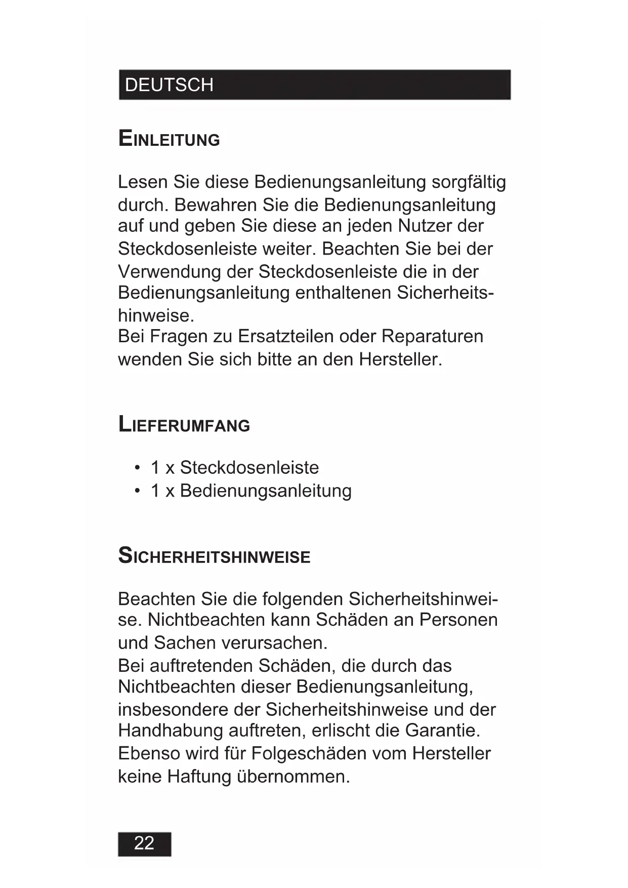 EINLEITUNG Lesen Sie diese Bedienungsanleitung sorgfältig durch. Bewahren Sie die Bedienungsanleitung auf und geben Sie diese an jeden Nutzer der Steckdosenleiste weiter. Beachten Sie bei der Verwendung der Steckdosenleiste die in der Bedienungsanleitung enthaltenen Sicherheits- hinweise. Bei Fragen zu Ersatzteilen oder Reparaturen wenden Sie sich bitte an den Hersteller. LIEFERUMFANG 1 x Steckdosenleiste 1 x Bedienungsanleitung SICHERHEITSHINWEISE Beachten Sie die folgenden Sicherheitshinwei- se. Nichtbeachten kann Schäden an Personen und Sachen verursachen. Bei auftretenden Schäden, die durch das Nichtbeachten dieser Bedienungsanleitung, insbesondere der Sicherheitshinweise und der Handhabung auftreten, erlischt die Garantie. Ebenso wird für Folgeschäden vom Hersteller keine Haftung übernommen.