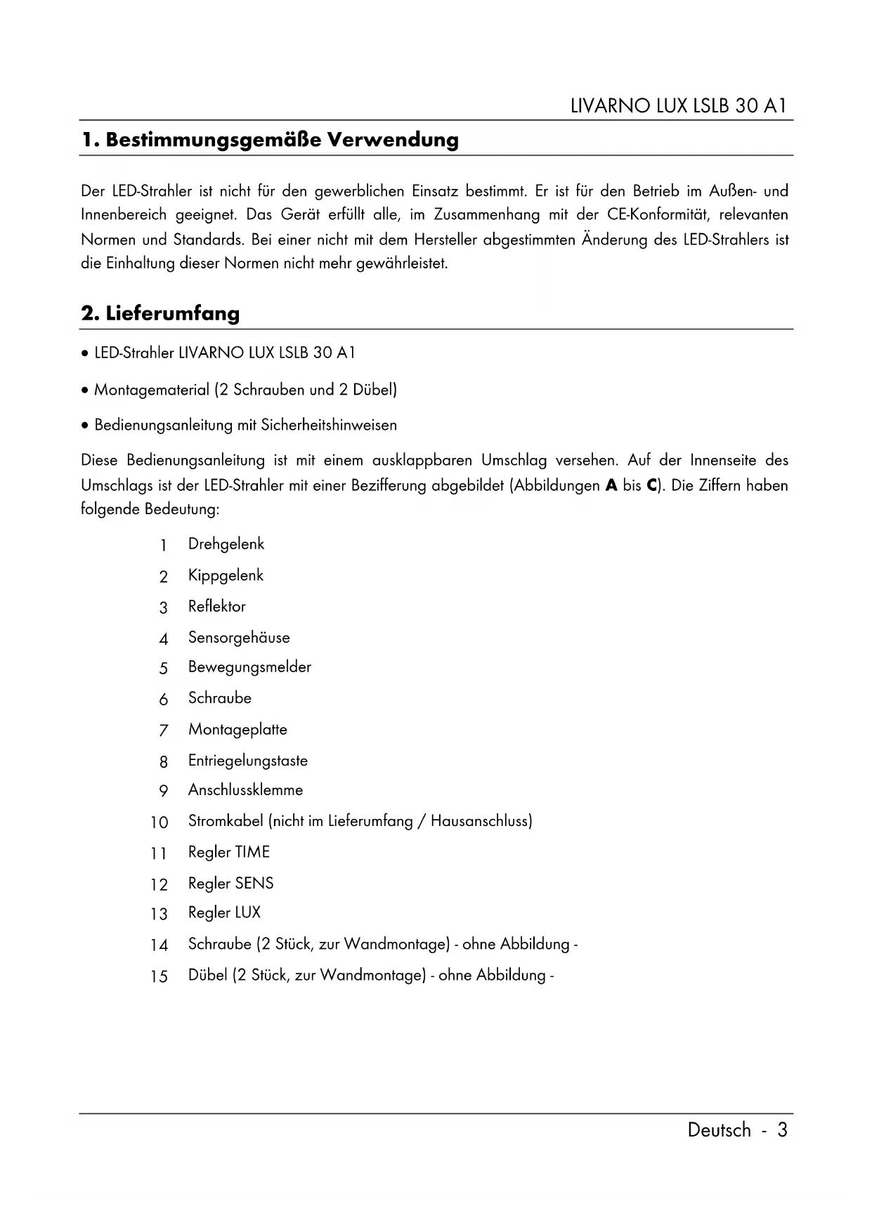 LED-Strahler LIVARNO LUX LSLB 30 A1 Montagematerial (2 Schrauben und 2 Dübel) Bedienungsanleitung mit Sicherheitshinweisen Diese Bedienungsanleitung ist mit einem ausklappbaren Umschlag versehen. Auf der Innenseite des Umschlags ist der LED-Strahler mit einer Bezifferung abgebildet (Abbildungen A bis C). Die Ziffern haben folgende Bedeutung: