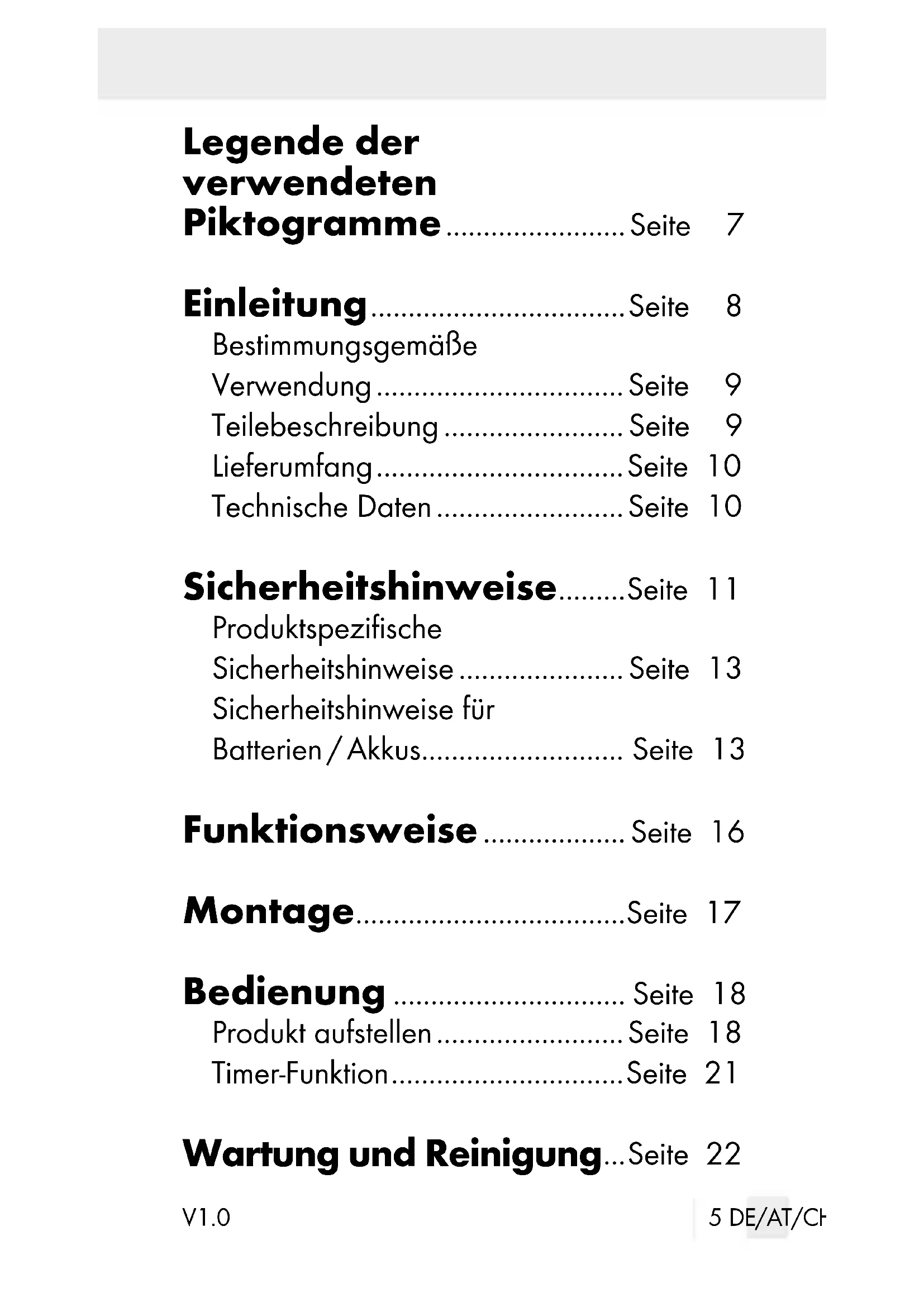 Istruzioni di montaggio, d’uso e di sicurezzaDE / AT / CH Montage-, Bedienungs- und Sicherheitshinweise Seite 5 FR /CH Instructions de montage, d‘utilisation et consignes de sécurité Page 31 IT / CH Istruzioni di montaggio, d’uso e di sicurezza Pagina 581 2 3 4 57 65 DE/AT/CH Legende der verwendeten Piktogramme ........................ Seite 7 Einleitung .................................. Seite 8 Bestimmungsgemäße Verwendung ................................. Seite 9 Teilebeschreibung ........................ Seite 9 Lieferumfang ................................. Seite 10 Technische Daten ......................... Seite 10 Sicherheitshinweise ......... Seite 11 Produktspezifische Sicherheitshinweise ...................... Seite 13 Sicherheitshinweise für Batterien / Akkus........................... Seite 13 Funktionsweise ................... Seite 16 Montage .................................... Seite 17 Bedienung ............................... Seite 18 Produkt aufstellen ......................... Seite 18 Timer-Funktion ............................... Seite 21 Wartung und Reinigung ... Seite 22 V1.06 DE/AT/CH Fehler beheben ................... Seite 23 Entsorgung .............................. Seite 25 Garantie .................................... Seite 27 Abwicklung im Garantiefall ......... Seite 29 Service .......................................... Seite 307 DE/AT/CH Legende der verwendeten Piktogramme Dieses Symbol zeigt an, dass dieses Produkt aus 2 Lichterketten-Streifen besteht. Jeder Lichterketten- Streifen ist ca. 5 m und die Zuleitung ca. 3 m lang. Spritzwassergeschützt Gleichstrom/-spannung Wechselstrom/-spannung Integrierter 6-Stunden-Timer, mit dem die LED-Solar-Lichter- kette maximal 6 Stunden lang kontinuierlich leuchtet Für den Außenbereich geeignet8 DE/AT/CH Legende der verwendeten Piktogramme Akkubetrieb Das CE-Zeichen bestätigt die Konformität mit den für das Produkt zutreffenden EU-Richtlinien. Sicherheitshinweise Handlungsanweisungen LED-Solar-Lichterkette Einleitung Wir beglückwünschen Sie zum Kauf Ihres neuen Produkts. Sie haben sich damit für ein hochwertiges Produkt entschieden. Die Be- dienungsanleitung ist Teil dieses Produkts. Sie enthält wichtige Hinweise für Sicherheit, Gebrauch und Entsorgung. Machen Sie sich9 DE/AT/CH vor der Benutzung des Produkts mit allen Be- dien- und Sicherheitshinweisen vertraut. Be- nutzen Sie das Produkt nur wie beschrieben und für die angegebenen Einsatzbereiche. Händigen Sie alle Unterlagen bei Weiter- gabe des Produkts an Dritte mit aus. Bestimmungsgemäße Verwendung Dieses Produkt ist für den Außenbereich ge- eignet. Dieses Produkt ist für die Verwen- dung in privaten Haushalten vorgesehen und nicht für die gewerbliche Verwendung oder für andere Anwendungen geeignet. Teilebeschreibung