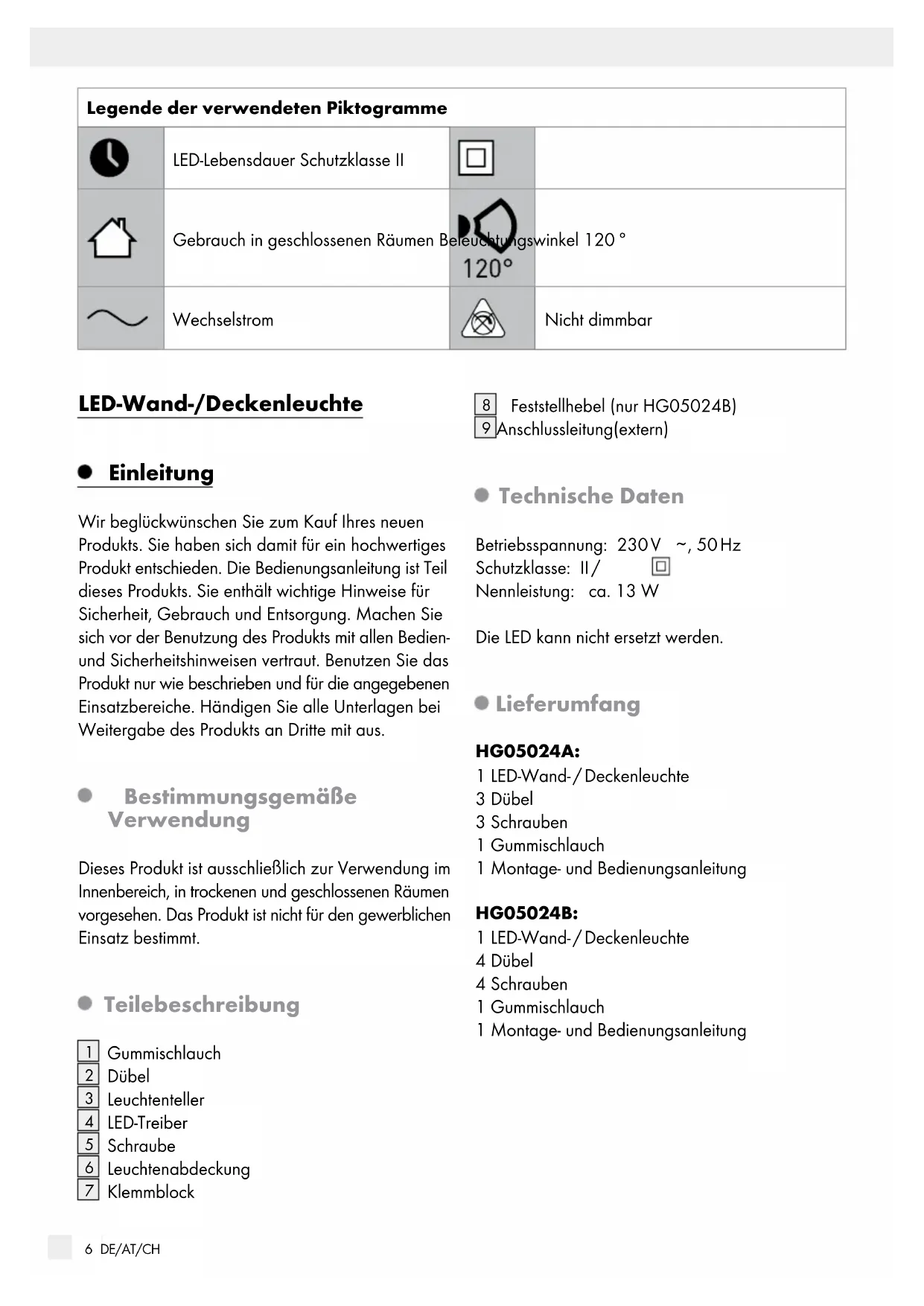 , 50 Hz Schutzklasse: II / Nennleistung: ca. 13 W Die LED kann nicht ersetzt werden. Lieferumfang HG05024A: 1 LED-Wand- / Deckenleuchte 3 Dübel 3 Schrauben 1 Gummischlauch 1 Montage- und Bedienungsanleitung HG05024B: 1 LED-Wand- / Deckenleuchte 4 Dübel 4 Schrauben 1 Gummischlauch 1 Montage- und Bedienungsanleitung7 DE/AT/CH Sicherheit Sicherheitshinweise LESEN SIE DIE ANLEITUNG VOR DER VERWEN-