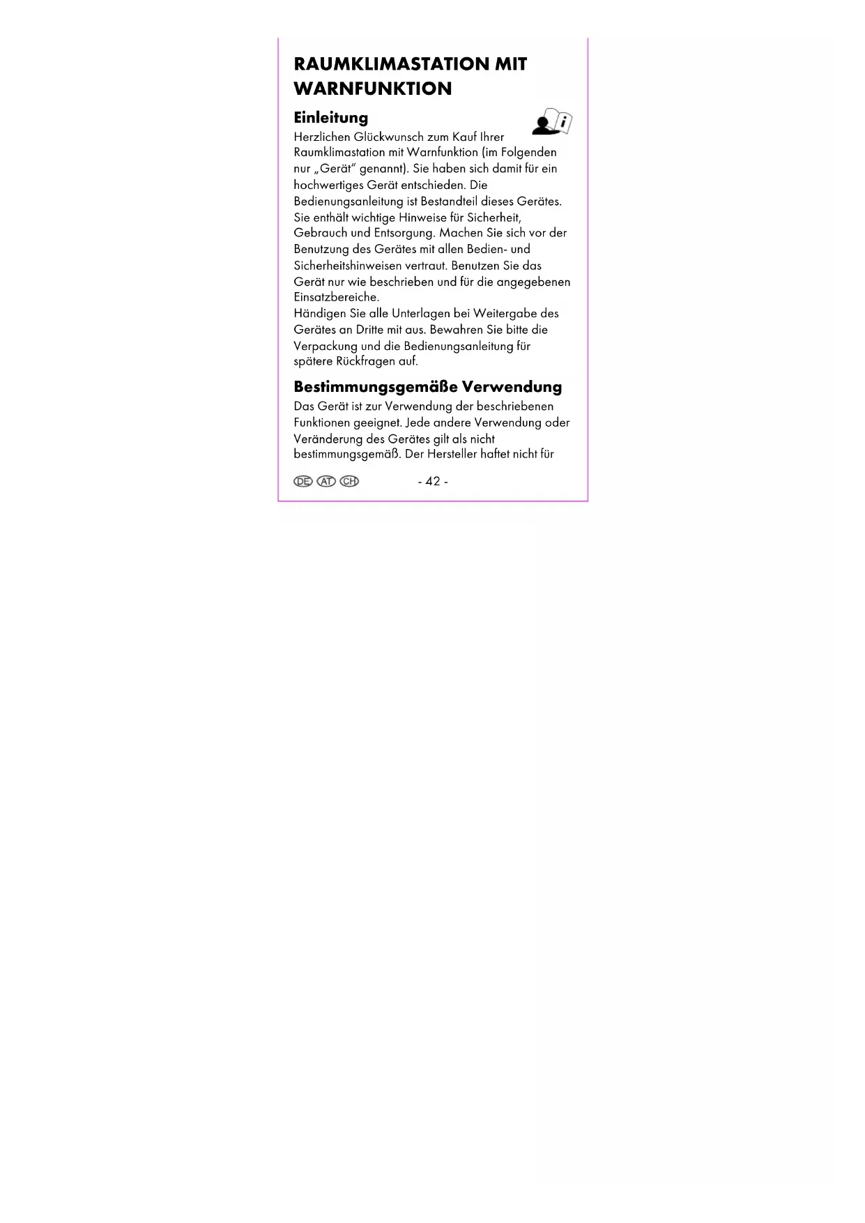 Supplier Please note that the following address is not a service address. Contact the service point named above first. digi-tech gmbh Valterweg 27A 65817 Eppstein GERMANY- 40 - Bedienungs- und Sicherheitshinweise Inhaltsverzeichnis Inhaltsverzeichnis ................................................. - 40 - Einleitung .............................................................. - 42 - Bestimmungsgemäße Verwendung .................... - 42 - Lieferumfang ......................................................... - 43 - Technische Daten ................................................. - 43 - Erklärung der Batteriesymbole ........................... - 46 - Wichtige Sicherheitshinweise Wichtige SicherheitshinweiseWichtige Sicherheitshinweise Wichtige Sicherheitshinweise .......................... - 48 - Sicherheitshinweise für Benutzer .................. - 48 - Sicherheitshinweise zu der Batterie .............. - 49 - Display .................................................................. - 53 - Bedienfelder ......................................................... - 54 - Das Gerät sicher positionieren ..................... - 55 - Inbetriebnahme .................................................... - 56 - Grundeinstellung ........................................... - 57 - Taupunkttemperaturanzeige/ DEW POINT ..... - 57 - Taupunkttemperatur....................................... - 57 - Luftfeuchtigkeitsgrenzwerte einstellen ................ - 59 - Luftfeuchtigkeitsalarm aktivieren oder deaktivieren .......................................................... - 60 - Komfortindex.................................................. - 61 - Raumtemperaturanzeige ..................................... - 62 -- 41 - Schimmelwarnung einstellen ............................... - 62 - Grippe- und Hitzeverzeichnis ............................. - 63 - Grippewarnungsanzeige .................................... - 63 - Hitzewarnungsanzeige ....................................... - 64 - MAX.MIN-Aufzeichnung anzeigen ................... - 64 - MAX.MIN-Aufzeichnung löschen ...................... - 64 - Batteriestandsanzeige ......................................... - 65 - Reinigungshinweis ............................................... - 65 - Lagerung............................................................... - 66 - Vereinfachte EU-Konformitätserklärung ............. - 66 - Entsorgung............................................................ - 67 - Entsorgung des Elektrogeräts ....................... - 67 - Entsorgung der Batterien ............................... - 70 - Recycling ........................................................ - 74 - Müllentsorgung .............................................. - 74 - Garantie der digi-tech gmbh .............................. - 74 - Garantiebedingungen .................................. - 74 - Garantiezeit und gesetzliche Mängelansprüche ......................................... - 75 - Garantieumfang ............................................ - 75 - Abwicklung im Garantiefall .......................... - 77 - Service .................................................................. - 78 - Lieferant ................................................................ - 80 -- 42 - RAUMKLIMASTATION MIT WARNFUNKTION Einleitung Herzlichen Glückwunsch zum Kauf Ihrer Raumklimastation mit Warnfunktion (im Folgenden nur „Gerät“ genannt). Sie haben sich damit für ein hochwertiges Gerät entschieden. Die Bedienungsanleitung ist Bestandteil dieses Gerätes. Sie enthält wichtige Hinweise für Sicherheit, Gebrauch und Entsorgung. Machen Sie sich vor der Benutzung des Gerätes mit allen Bedien- und Sicherheitshinweisen vertraut. Benutzen Sie das Gerät nur wie beschrieben und für die angegebenen Einsatzbereiche. Händigen Sie alle Unterlagen bei Weitergabe des Gerätes an Dritte mit aus. Bewahren Sie bitte die Verpackung und die Bedienungsanleitung für spätere Rückfragen auf. Bestimmungsgemäße Verwendung Das Gerät ist zur Verwendung der beschriebenen Funktionen geeignet. Jede andere Verwendung oder Veränderung des Gerätes gilt als nicht bestimmungsgemäß. Der Hersteller haftet nicht für- 43 - Schäden, die durch nicht bestimmungsgemäßen Gebrauch oder falsche Bedienung verursacht werden. Das Gerät ist nicht für den gewerblichen Einsatz vorgesehen. Lieferumfang Hinweis: Bitte überprüfen Sie nach dem Kauf den Lieferumfang. Stellen Sie sicher, dass alle Teile vorhanden und nicht defekt sind. Sollte die Lieferung unvollständig und/oder Teile beschädigt sein, benutzen Sie das Gerät nicht. Wenden Sie sich an die Serviceabteilung (siehe "Abwicklung im Garantiefall"). 1 x Raumklimastation 2 x Batterien 1,5 V AAA LR03 1 x Bedienungsanleitung Technische Daten Messbereich/Temperatur: 0 °C - 50 °C Messbereich/Luftfeuchtigkeit: 20 % - 95 % Temperaturanzeige/Toleranz im Kernmessbereich: +/- 1 °C Luftfeuchtigkeitsanzeige/Toleranz im Kernmessbereich: 41 % - 80 % - ±3 %; sonstiger Bereich: ±5 %- 44 - Maße: ca. 115 x 74 x 24 mm Gewicht: Modell 1: ca. 97 g (exkl. Batterien) Modell 2: ca. 93 g (exkl. Batterien) Batterien: 2 x 1,5 V AAA R03/LR03 - Kennzeichen für Gleichspannung Zeichenerklärung WARNUNG ! Dieses Signalsymbol/-wort bezeichnet eine Gefährdung mit einem mittleren Risikograd, die, wenn sie nicht vermieden wird, den Tod oder eine schwere Verletzung zur Folge haben kann. Hinweis: Dieses Signalwort wird für zusätzliche Informationen verwendet.