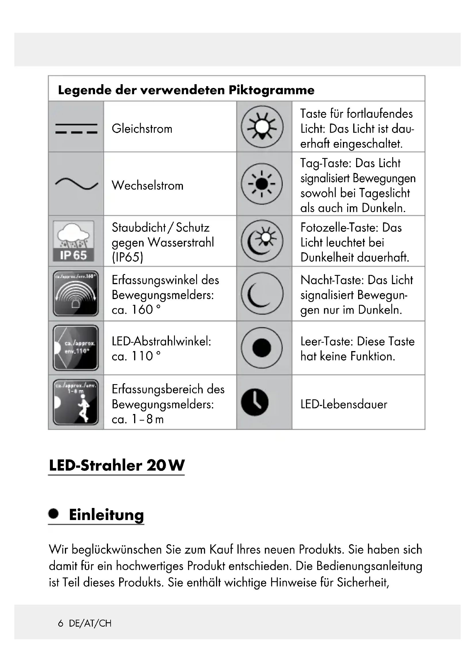 235 DE/AT/CH Legende der verwendeten Piktogramme ..... Seite 6 Einleitung ................................................................................... Seite 6 Bestimmungsgemäße Verwendung ..............................................Seite 7 Teilebeschreibung .........................................................................Seite 7 Technische Daten ..........................................................................Seite 8 Lieferumfang ..................................................................................Seite 8 Allgemeine Sicherheitshinweise ............................ Seite 9 Sicherheitshinweise für Batterien / Akkus ..................................... Seite 10 Vor der Montage ................................................................Seite 12 Montage .....................................................................................Seite 12 Inbetriebnahme ...................................................................Seite 14 Mode-Tasten ..................................................................................Seite 15 Sensitivity-Tasten ............................................................................ Seite 16 Time-Tasten ....................................................................................Seite 17 Batterie wechseln ...............................................................Seite 17 Reinigung und Pflege ......................................................Seite 18 Entsorgung ...............................................................................Seite 18 Garantie .....................................................................................Seite 206 DE/AT/CH Legende der verwendeten Piktogramme Gleichstrom Taste für fortlaufendes Licht: Das Licht ist dau- erhaft eingeschaltet. Wechselstrom Tag-Taste: Das Licht signalisiert Bewegungen sowohl bei Tageslicht als auch im Dunkeln. Staubdicht / Schutz gegen Wasserstrahl (IP65) Fotozelle-Taste: Das Licht leuchtet bei Dunkelheit dauerhaft. Erfassungswinkel des Bewegungsmelders: ca. 160 ° Nacht-Taste: Das Licht signalisiert Bewegun- gen nur im Dunkeln. LED-Abstrahlwinkel: ca. 110 ° Leer-Taste: Diese Taste hat keine Funktion. Erfassungsbereich des Bewegungsmelders: ca. 1–8 m LED-Lebensdauer LED-Strahler 20 W Einleitung Wir beglückwünschen Sie zum Kauf Ihres neuen Produkts. Sie haben sich damit für ein hochwertiges Produkt entschieden. Die Bedienungsanleitung ist Teil dieses Produkts. Sie enthält wichtige Hinweise für Sicherheit,7 DE/AT/CH Gebrauch und Entsorgung. Machen Sie sich vor der Benutzung des Produkts mit allen Bedien- und Sicherheitshinweisen vertraut. Benutzen Sie das Pro dukt nur wie beschrieben und für die angegebenen Einsatzbereiche. Händigen Sie alle Unterlagen bei Weitergabe des Produkts an Dritte mit aus. Bestimmungsgemäße Verwendung Dieses Produkt ist zur Ausleuchtung von Innen- und Außenbereichen vorge- sehen. Das Produkt ist nur für den privaten Gebrauch und nicht für den gewerblichen Einsatz oder für andere Einsatzbereiche bestimmt. Teilebeschreibung