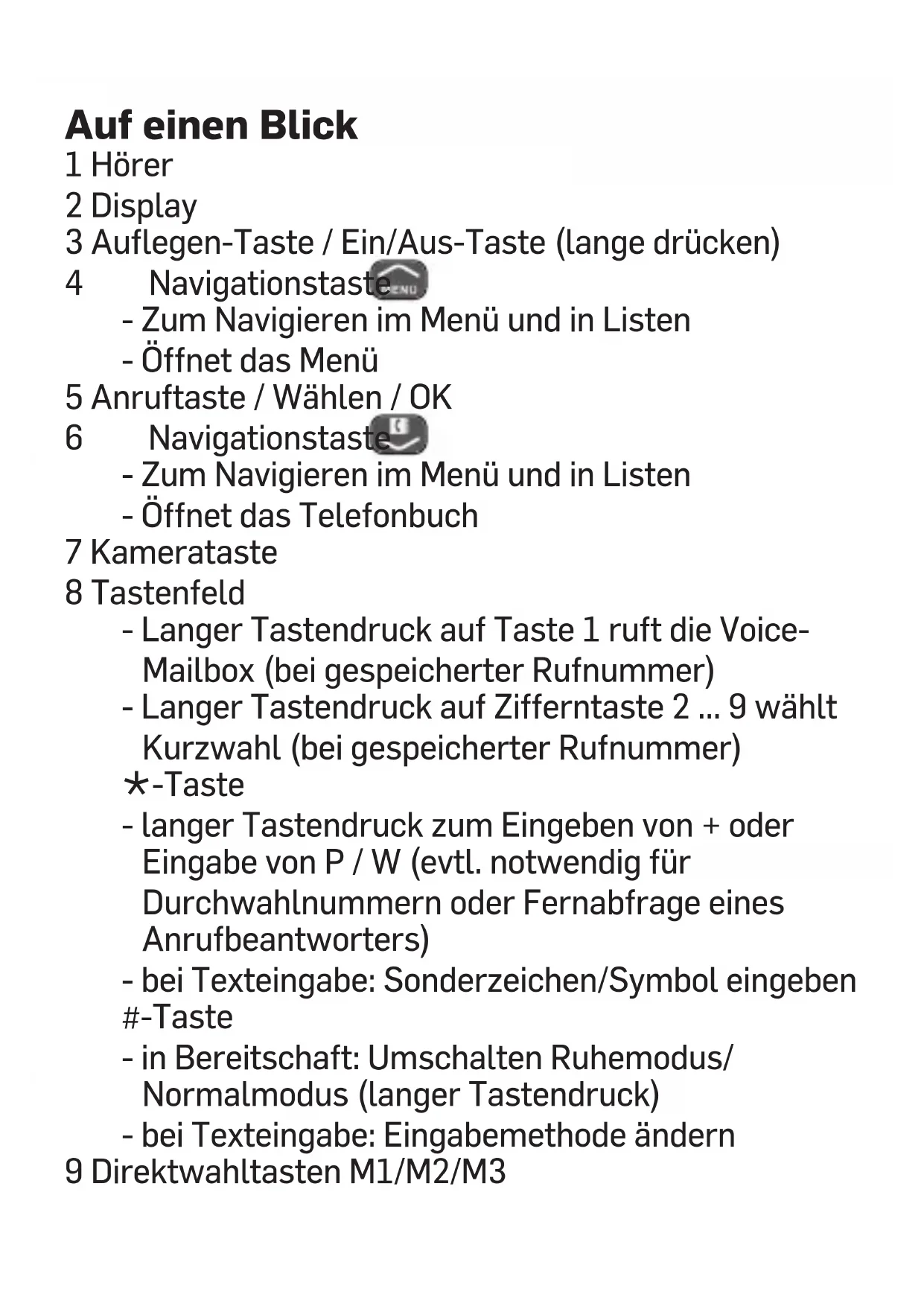 M228 Mobile Phone Bedienungsanleitung User’s Manual Manuel de l’utilisateur Manuale utente Manual de instrucciones Handleiding DEUTSCH ENGLISH FRANÇAIS ITALIANO ESPAÑOL NEDERLANDS Please read carefully before using this equipment.Auf einen Blick 1 Hörer 2 Display 3 Auflegen-Taste / Ein/Aus-Taste (lange drücken) 4 Navigationstaste - Zum Navigieren im Menü und in Listen - Öffnet das Menü 5 Anruftaste / Wählen / OK 6 Navigationstaste - Zum Navigieren im Menü und in Listen - Öffnet das Telefonbuch 7 Kamerataste 8 Tastenfeld - Langer Tastendruck auf Taste 1 ruft die Voice- Mailbox (bei gespeicherter Rufnummer) - Langer Tastendruck auf Zifferntaste 2 ... 9 wählt Kurzwahl (bei gespeicherter Rufnummer) -Taste - langer Tastendruck zum Eingeben von + oder Eingabe von P / W (evtl. notwendig für Durchwahlnummern oder Fernabfrage eines Anrufbeantworters) - bei Texteingabe: Sonderzeichen/Symbol eingeben #-Taste - in Bereitschaft: Umschalten Ruhemodus/ Normalmodus (langer Tastendruck) - bei Texteingabe: Eingabemethode ändern 9 Direktwahltasten M1/M2/M310 Headsetanschluss 3,5 mm 11 Tragebandbefestigung 12 Lautstärkeeinstellung (+/-) 13 Kameraobjektiv 14 LED “SMS” 15 LED “Verpasste Anrufe” 16 LED “Akkuladung”