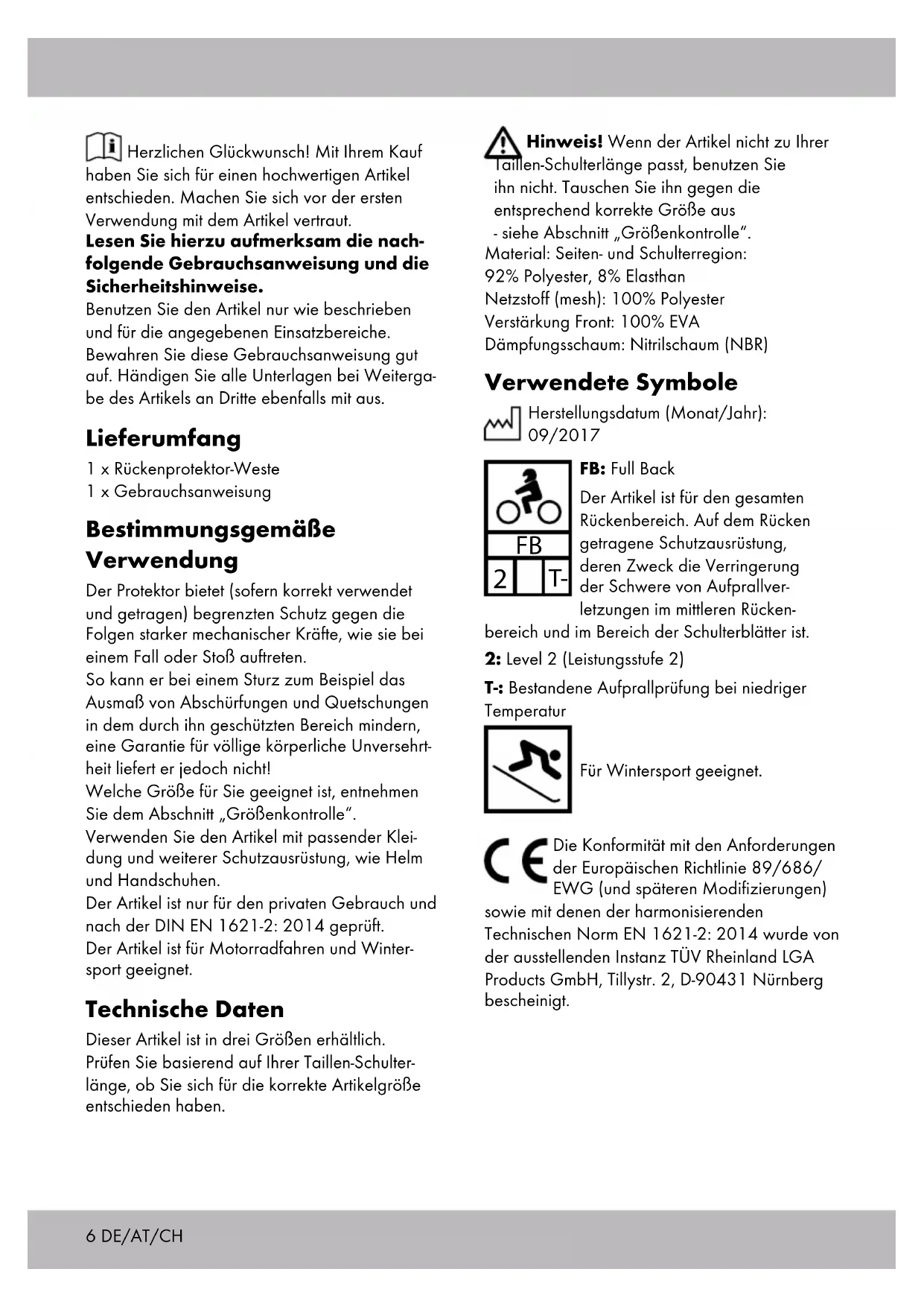 FB: Full Back Der Artikel ist für den gesamten Rückenbereich. Auf dem Rücken getragene Schutzausrüstung, deren Zweck die Verringerung der Schwere von Aufprallver- letzungen im mittleren Rücken- bereich und im Bereich der Schulterblätter ist. 2: Level 2 (Leistungsstufe 2) T-: Bestandene Aufprallprüfung bei niedriger Temperatur Für Wintersport geeignet. Die Konformität mit den Anforderungen der Europäischen Richtlinie 89/686/ EWG (und späteren Modifizierungen) sowie mit denen der harmonisierenden Technischen Norm EN 1621-2: 2014 wurde von der ausstellenden Instanz TÜV Rheinland LGA Products GmbH, Tillystr. 2, D-90431 Nürnberg bescheinigt. Herzlichen Glückwunsch! Mit Ihrem Kauf haben Sie sich für einen hochwertigen Artikel entschieden. Machen Sie sich vor der ersten Verwendung mit dem Artikel vertraut. Lesen Sie hierzu aufmerksam die nach- folgende Gebrauchsanweisung und die Sicherheitshinweise. Benutzen Sie den Artikel nur wie beschrieben und für die angegebenen Einsatzbereiche. Bewahren Sie diese Gebrauchsanweisung gut auf. Händigen Sie alle Unterlagen bei Weiterga- be des Artikels an Dritte ebenfalls mit aus. Lieferumfang 1 x Rückenprotektor-Weste 1 x Gebrauchsanweisung Bestimmungsgemäße Verwendung Der Protektor bietet (sofern korrekt verwendet und getragen) begrenzten Schutz gegen die Folgen starker mechanischer Kräfte, wie sie bei einem Fall oder Stoß auftreten. So kann er bei einem Sturz zum Beispiel das Ausmaß von Abschürfungen und Quetschungen in dem durch ihn geschützten Bereich mindern, eine Garantie für völlige körperliche Unversehrt- heit liefert er jedoch nicht! Welche Größe für Sie geeignet ist, entnehmen Sie dem Abschnitt „Größenkontrolle“. Verwenden Sie den Artikel mit passender Klei- dung und weiterer Schutzausrüstung, wie Helm und Handschuhen. Der Artikel ist nur für den privaten Gebrauch und nach der DIN EN 1621-2: 2014 geprüft. Der Artikel ist für Motorradfahren und Winter- sport geeignet. Technische Daten Dieser Artikel ist in drei Größen erhältlich. Prüfen Sie basierend auf Ihrer Taillen-Schulter- länge, ob Sie sich für die korrekte Artikelgröße entschieden haben.7 Sicherheitshinweise