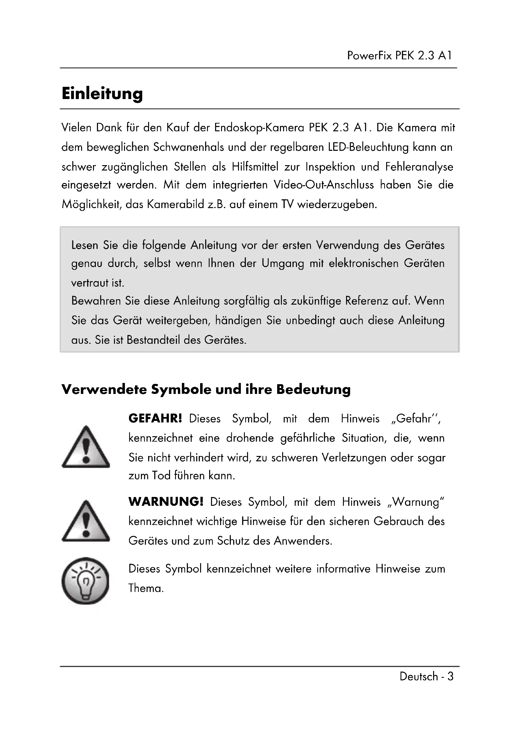 - Hinweise zu Garantie und Serviceabwicklung PowerFix PEK 2.3 A1 Deutsch - 3 Einleitung Vielen Dank für den Kauf der Endoskop-Kamera PEK 2.3 A1. Die Kamera mit dem beweglichen Schwanenhals und der regelbaren LED-Beleuchtung kann an schwer zugänglichen Stellen als Hilfsmittel zur Inspektion und Fehleranalyse eingesetzt werden. Mit dem integrierten Video-Out-Anschluss haben Sie die Möglichkeit, das Kamerabild z.B. auf einem TV wiederzugeben. Lesen Sie die folgende Anleitung vor der ersten Verwendung des Gerätes genau durch, selbst wenn Ihnen der Umgang mit elektronischen Geräten vertraut ist. Bewahren Sie diese Anleitung sorgfältig als zukünftige Referenz auf. Wenn Sie das Gerät weitergeben, händigen Sie unbedingt auch diese Anleitung aus. Sie ist Bestandteil des Gerätes. Verwendete Symbole und ihre Bedeutung GEFAHR! Dieses Symbol, mit dem Hinweis „Gefahr‘‘, kennzeichnet eine drohende gefährliche Situation, die, wenn Sie nicht verhindert wird, zu schweren Verletzungen oder sogar zum Tod führen kann. WARNUNG! Dieses Symbol, mit dem Hinweis „Warnung“ kennzeichnet wichtige Hinweise für den sicheren Gebrauch des Gerätes und zum Schutz des Anwenders. Dieses Symbol kennzeichnet weitere informative Hinweise zum Thema.PowerFix PEK 2.3 A1 p. 19