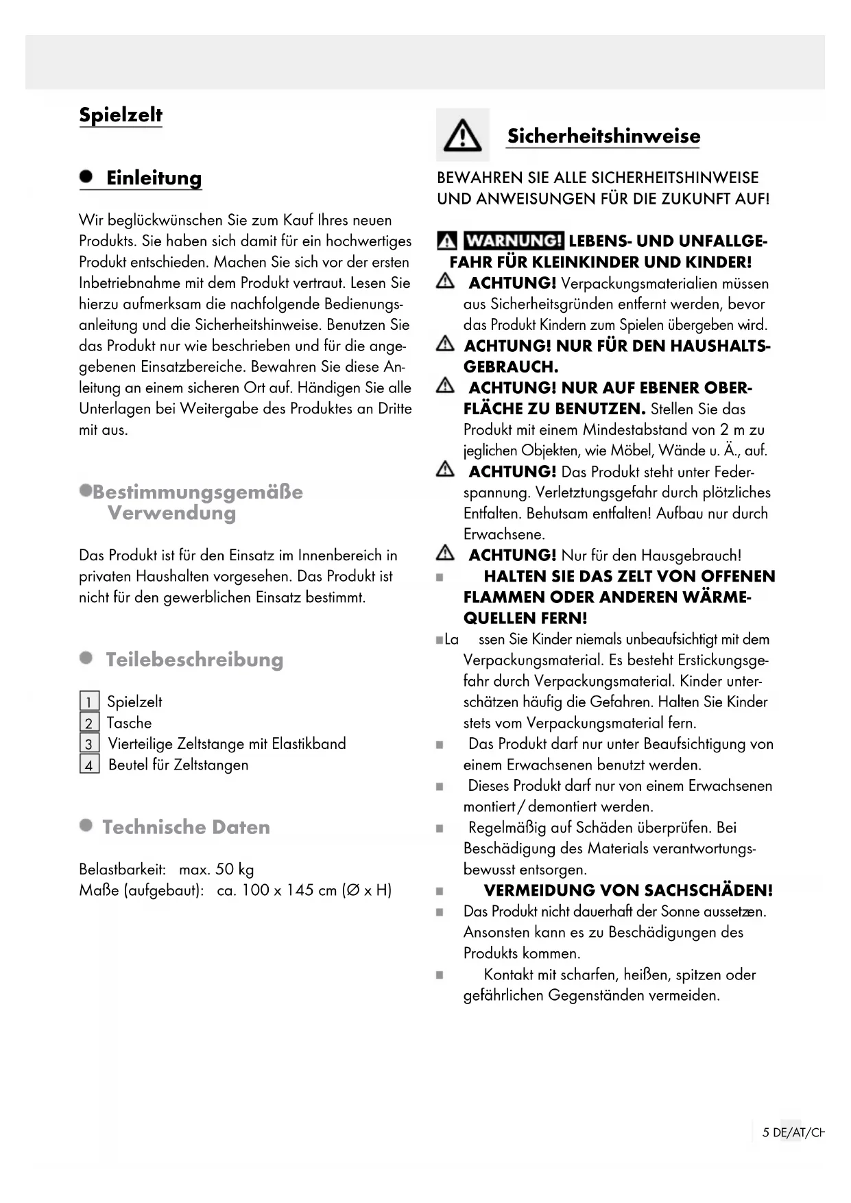 35 DE/AT/CH Spielzelt Einleitung Wir beglückwünschen Sie zum Kauf Ihres neuen Produkts. Sie haben sich damit für ein hochwertiges Produkt entschieden. Machen Sie sich vor der ersten Inbetriebnahme mit dem Produkt vertraut. Lesen Sie hierzu aufmerksam die nachfolgende Bedienungs- anleitung und die Sicherheitshinweise. Benutzen Sie das Produkt nur wie beschrieben und für die ange- gebenen Einsatzbereiche. Bewahren Sie diese An- leitung an einem sicheren Ort auf. Händigen Sie alle Unterlagen bei Weitergabe des Produktes an Dritte mit aus. Bestimmungsgemäße Verwendung Das Produkt ist für den Einsatz im Innenbereich in privaten Haushalten vorgesehen. Das Produkt ist nicht für den gewerblichen Einsatz bestimmt. Teilebeschreibung