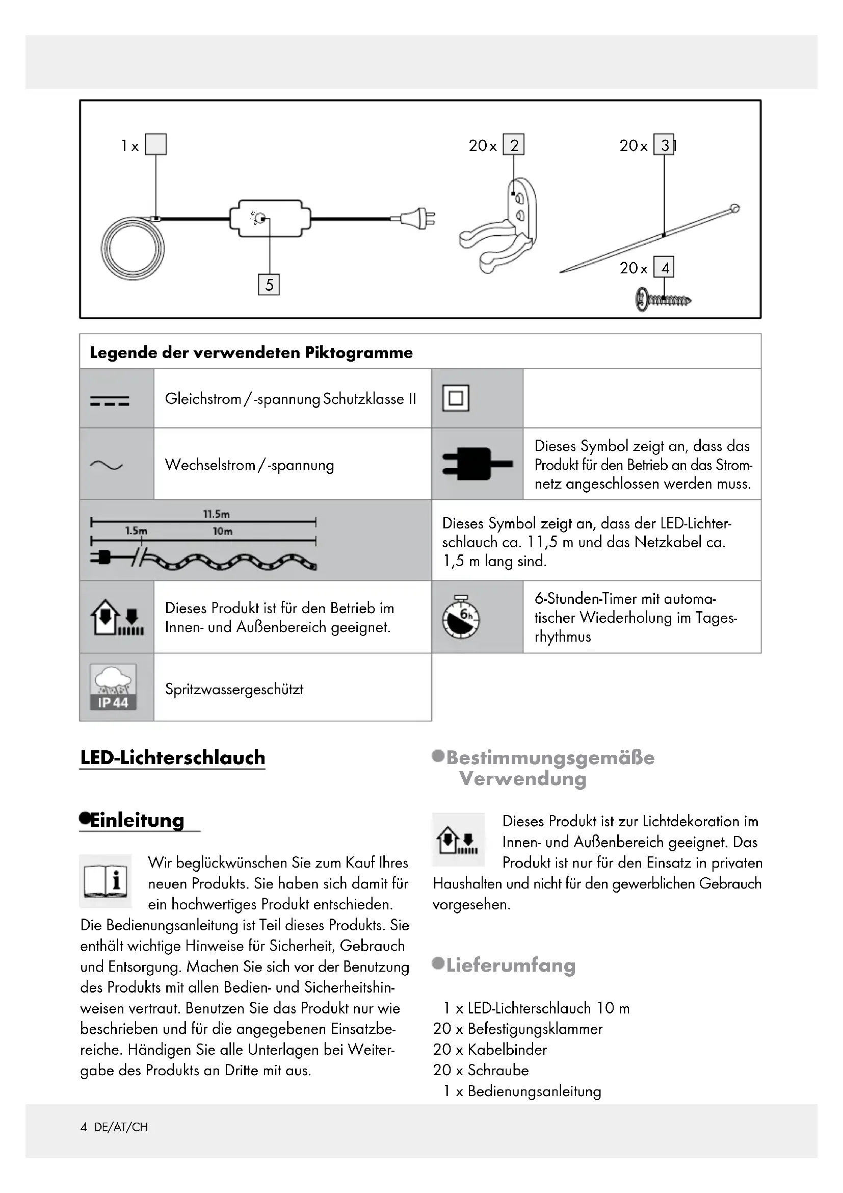 Wskazówki dotyczące obsługi i bezpieczeństwaDE / AT / CH Bedienungs- und Sicherheitshinweise Seite 3 GB / IE Operation and safety notes Page 9 FR / BE Instructions d‘utilisation et consignes de sécurité Page 15 NL / BE Bedienings- en veiligheidsinstructies Pagina 22 PL Wskazówki dotyczące obsługi i bezpieczeństwa Strona 28 CZ Pokyny pro obsluhu a bezpečnostní pokyny Strana 34 SK Pokyny pre obsluhu a bezpečnostné pokyny Strana 403 DE/AT/CH Legende der verwendeten Piktogramme ........................................................... Seite 4 Einleitung ......................................................................................................................................... Seite 4 Bestimmungsgemäße Verwendung ....................................................................................................Seite 4 Lieferumfang ........................................................................................................................................ Seite 4 Teilebeschreibung ...............................................................................................................................Seite 5 Technische Daten ................................................................................................................................Seite 5 Sicherheitshinweise ................................................................................................................Seite 5 Sicherheitshinweise zur Montage ......................................................................................................Seite 6 Montage ...........................................................................................................................................Seite 6 Anwendung ..................................................................................................................................Seite 7 Timer verwenden .....................................................................................................................Seite 7 Reinigung und Pflege ............................................................................................................Seite 7 Lagerung .........................................................................................................................................Seite 7 Entsorgung .....................................................................................................................................Seite 7 Garantie ........................................................................................................................................... Seite 8 Abwicklung im Garantiefall ................................................................................................................Seite 8 Service .................................................................................................................................................Seite 84 DE/AT/CH Legende der verwendeten Piktogramme Gleichstrom / -spannung Schutzklasse II Wechselstrom / -spannung Dieses Symbol zeigt an, dass das Produkt für den Betrieb an das Strom- netz angeschlossen werden muss. Dieses Symbol zeigt an, dass der LED-Lichter- schlauch ca. 11,5 m und das Netzkabel ca. 1,5 m lang sind. Dieses Produkt ist für den Betrieb im Innen- und Außenbereich geeignet. 6-Stunden-Timer mit automa- tischer Wiederholung im Tages- rhythmus Spritzwassergeschützt LED-Lichterschlauch Einleitung Wir beglückwünschen Sie zum Kauf Ihres neuen Produkts. Sie haben sich damit für ein hochwertiges Produkt entschieden. Die Bedienungsanleitung ist Teil dieses Produkts. Sie enthält wichtige Hinweise für Sicherheit, Gebrauch und Entsorgung. Machen Sie sich vor der Benutzung des Produkts mit allen Bedien- und Sicherheitshin- weisen vertraut. Benutzen Sie das Produkt nur wie beschrieben und für die angegebenen Einsatzbe- reiche. Händigen Sie alle Unterlagen bei Weiter- gabe des Produkts an Dritte mit aus. Bestimmungsgemäße Verwendung Dieses Produkt ist zur Lichtdekoration im Innen- und Außenbereich geeignet. Das Produkt ist nur für den Einsatz in privaten Haushalten und nicht für den gewerblichen Gebrauch vorgesehen. Lieferumfang 1 x LED-Lichterschlauch 10 m 20 x Befestigungsklammer 20 x Kabelbinder 20 x Schraube 1 x Bedienungsanleitung