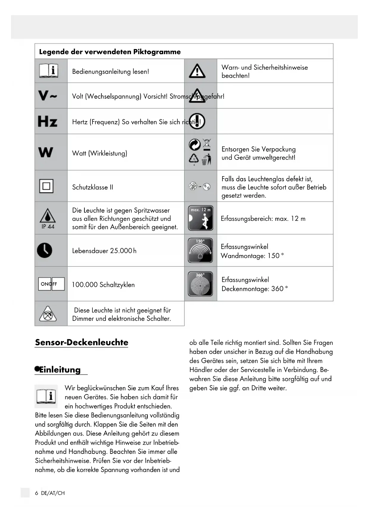 Erfassungswinkel Deckenmontage: 360 ° Diese Leuchte ist nicht geeignet für Dimmer und elektronische Schalter. Sensor-Deckenleuchte Einleitung Wir beglückwünschen Sie zum Kauf Ihres neuen Gerätes. Sie haben sich damit für ein hochwertiges Produkt entschieden. Bitte lesen Sie diese Bedienungsanleitung vollständig und sorgfältig durch. Klappen Sie die Seiten mit den Abbildungen aus. Diese Anleitung gehört zu diesem Produkt und enthält wichtige Hinweise zur Inbetrieb- nahme und Handhabung. Beachten Sie immer alle Sicherheitshinweise. Prüfen Sie vor der Inbetrieb- nahme, ob die korrekte Spannung vorhanden ist und ob alle Teile richtig montiert sind. Sollten Sie Fragen haben oder unsicher in Bezug auf die Handhabung des Gerätes sein, setzen Sie sich bitte mit Ihrem Händler oder der Servicestelle in Verbindung. Be- wahren Sie diese Anleitung bitte sorgfältig auf und geben Sie sie ggf. an Dritte weiter.7 DE/AT/CH Einleitung / Sicherheit Bestimmungsgemäße Verwendung Diese Leuchte ist für den Betrieb im Innenbereich und Außenbereich geeignet. Die Leuchte kann auf allen normal entflammbaren Oberflächen befestigt werden. Die Elektrofachkraft, die die Leuchte instal- liert, hat darauf zu achten, dass die Leuchte nicht auf feuchtem oder leitendem Untergrund installiert wird! Dieses Gerät ist nur für den Einsatz in priva- ten Haushalten vorgesehen. Lieferumfang Kontrollieren Sie unmittelbar nach dem Auspacken immer den Lieferumfang auf Vollständigkeit sowie den einwandfreien Zustand des Gerätes. 1 Sensor-Deckenleuchte 1 LED-Leuchtmittel (5,5 W, E27) (nicht dimmbar) Montagematerial (Dübel und Schrauben) 1 Bedienungsanleitung Teilbeschreibung