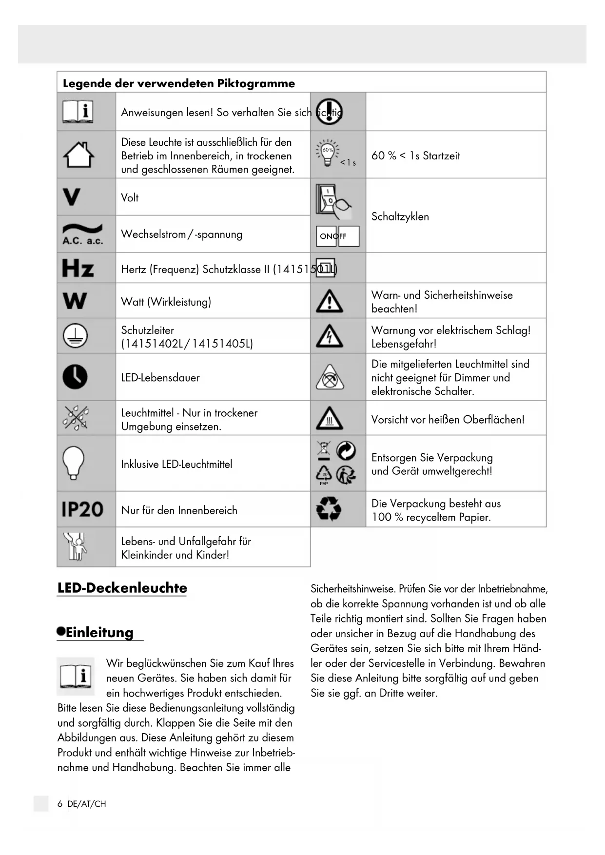 PAP Entsorgen Sie Verpackung und Gerät umweltgerecht! Nur für den Innenbereich Die Verpackung besteht aus 100 % recyceltem Papier. Lebens- und Unfallgefahr für Kleinkinder und Kinder! LED-Deckenleuchte Einleitung Wir beglückwünschen Sie zum Kauf Ihres neuen Gerätes. Sie haben sich damit für ein hochwertiges Produkt entschieden. Bitte lesen Sie diese Bedienungsanleitung vollständig und sorgfältig durch. Klappen Sie die Seite mit den Abbildungen aus. Diese Anleitung gehört zu diesem Produkt und enthält wichtige Hinweise zur Inbetrieb- nahme und Handhabung. Beachten Sie immer alle Sicherheitshinweise. Prüfen Sie vor der Inbetriebnahme, ob die korrekte Spannung vorhanden ist und ob alle Teile richtig montiert sind. Sollten Sie Fragen haben oder unsicher in Bezug auf die Handhabung des Gerätes sein, setzen Sie sich bitte mit Ihrem Händ- ler oder der Servicestelle in Verbindung. Bewahren Sie diese Anleitung bitte sorgfältig auf und geben Sie sie ggf. an Dritte weiter.7 DE/AT/CH Einleitung / Sicherheit Bestimmungsgemäße Verwendung Diese Leuchte ist ausschließlich für den Betrieb im Innenbereich, in trockenen und geschlossenen Räumen geeignet. Die Leuchte kann auf allen normal entflammbaren Oberflächen befestigt werden. Dieses Gerät ist nur für den Einsatz in privaten Haushalten vorgesehen. Dieses Produkt ist vorgesehen für den normalen Betrieb. Lieferumfang Kontrollieren Sie unmittelbar nach dem Auspacken immer den Lieferumfang auf Vollständigkeit sowie den einwandfreien Zustand des Gerätes. 1 LED-Deckenleuchte, Modell 14151402L / 14151405L / 14151501L 2 Schrauben (Montagewinkel) 2 Dübel 2 Schutzschläuche (14151402L / 14151405L) 1 Gummitülle (14151501L) 3 LED-Leuchtmittel 1 Montage- und Bedienungsanleitung Teilebeschreibung