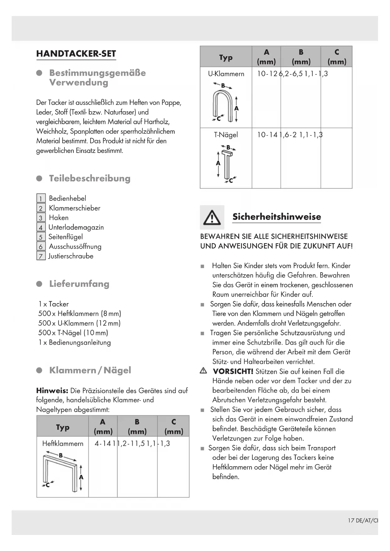 UND ANWEISUNGEN FÜR DIE ZUKUNFT AUF! J Halten Sie Kinder stets vom Produkt fern. Kinder unterschätzen häufig die Gefahren. Bewahren Sie das Gerät in einem trockenen, geschlossenen Raum unerreichbar für Kinder auf. J Sorgen Sie dafür, dass keinesfalls Menschen oder Tiere von den Klammern und Nägeln getroffen werden. Andernfalls droht Verletzungsgefahr. J Tragen Sie persönliche Schutzausrüstung und immer eine Schutzbrille. Das gilt auch für die Person, die während der Arbeit mit dem Gerät Stütz- und Haltearbeiten verrichtet. VORSICHT! Stützen Sie auf keinen Fall die Hände neben oder vor dem Tacker und der zu bearbeitenden Fläche ab, da bei einem Abrutschen Verletzungsgefahr besteht. J Stellen Sie vor jedem Gebrauch sicher, dass sich das Gerät in einem einwandfreien Zustand befindet. Beschädigte Geräteteile können Verletzungen zur Folge haben. J Sorgen Sie dafür, dass sich beim Transport oder bei der Lagerung des Tackers keine Heftklammern oder Nägel mehr im Gerät befinden.18 DE/AT/CH