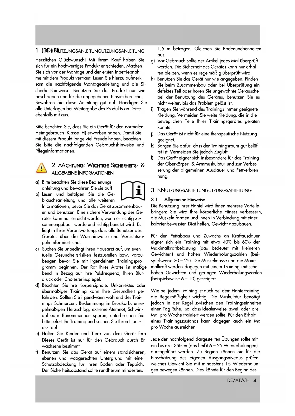 a) Bitte beachten Sie diese Bedienungs- anleitung und bewahren Sie sie auf! b) Lesen und befolgen Sie die Ge- brauchsanleitung und alle weiteren Informationen, bevor Sie das Gerät zusammenbau- en und benutzen. Eine sichere Verwendung des Ge- rätes kann nur erreicht werden, wenn es richtig zu- sammengebaut wurde und richtig benutzt wird. Es liegt in Ihrer Verantwortung, dass alle Benutzer des Gerätes über die Warnhinweise und Vorsichtsre- geln informiert sind. c) Suchen Sie unbedingt Ihren Hausarzt auf, um even- tuelle Gesundheitsrisiken festzustellen bzw. vorzu- beugen bevor Sie mit irgendeinem Trainingspro- gramm beginnen. Der Rat Ihres Arztes ist maßge- bend in Bezug auf Ihre Pulsfrequenz, Ihren Blut- druck oder Cholesterinspiegel. d) Beachten Sie Ihre Körpersignale. Unkorrektes oder übermäßiges Training kann Ihre Gesundheit ge- fährden. Sollten Sie irgendwann während des Trai- nings Schmerzen, Beklemmung im Brustkorb, unre- gelmäßigen Herzschlag, extreme Atemnot, Schwin- del oder Benommenheit spüren, unterbrechen Sie bitte sofort Ihr Training und suchen Sie Ihren Haus- arzt auf. e) Halten Sie Kinder und Tiere von dem Gerät fern. Dieses Gerät ist nur für den Gebrauch durch Er- wachsene bestimmt. f) Benutzen Sie das Gerät auf einem standsicheren, ebenen und waagerechten Untergrund mit einer Schutzabdeckung für Ihren Boden oder Teppich. Der Sicherheitsabstand sollte rundherum mindestens 1,5 m betragen. Gleichen Sie Bodenunebenheiten aus. g) Vor Gebrauch sollte der Artikel jedes Mal überprüft werden. Die Sicherheit des Gerätes kann nur erhal- ten bleiben, wenn es regelmäßig überprüft wird. h) Benutzen Sie das Gerät nur wie angegeben. Finden Sie beim Zusammenbau oder bei Überprüfung ein defektes Teil oder hören Sie ungewohnte Geräusche bei der Benutzung des Gerätes, benutzen Sie es nicht weiter, bis das Problem gelöst ist.