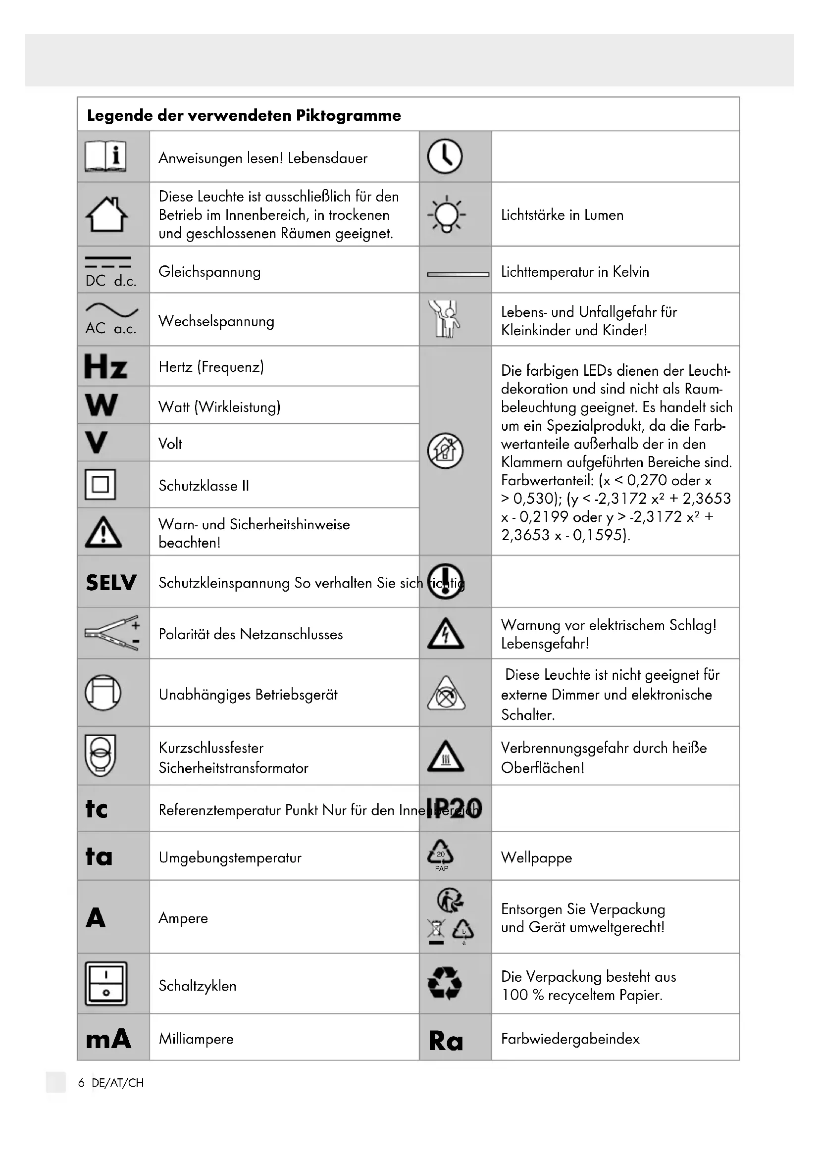 KINDER UND KINDER! Lassen Sie Kinder niemals unbeaufsichtigt mit dem Verpackungsmaterial. Es besteht Erstickungs- gefahr durch Verpackungsmaterial. Kinder un- terschätzen häufig die Gefahren. Lassen Sie die Leuchte oder Verpackungsmaterial nicht achtlos liegen. Plastikfolien / -tüten, Kunst- stoffteile etc. könnten für Kinder zu einem ge- fährlichen Spielzeug werden. Dieses Gerät kann von Kindern ab 8 Jahren und darüber sowie von Personen mit verringerten physischen, sensorischen oder mentalen Fähig- keiten oder Mangel an Erfahrung und Wissen benutzt werden, wenn sie beaufsichtigt oder bezüglich des sicheren Gebrauchs des Gerätes unterwiesen wurden und die daraus resultieren- den Gefahren verstehen. Kinder dürfen nicht mit dem Gerät spielen. Reinigung und Benutzerwar- tung dürfen nicht von Kindern ohne Beaufsichti- gung durchgeführt werden. Vermeiden Sie Lebensgefahr durch elektrischen Schlag Überprüfen Sie vor jedem Gebrauch die Leuchte auf etwaige Beschädigungen. Benutzen Sie Ihre Leuchte niemals, wenn Sie irgendwelche Beschä- digungen feststellen. Eine beschädigte Leuchte bedeutet Lebensge- fahr durch elektrischen Schlag. Wen den Sie sich bei Beschädigungen, Reparaturen oder anderen Problemen an der Leuchte an die Servicestelle oder eine Elektrofachkraft. Die äußere flexible Leitung dieser Leuchte kann nicht ausgetauscht werden; falls die Leitung beschädigt ist, muss die Leuchte verschrottet werden. Vergewissern Sie sich vor der Benutzung, dass die vorhandene Netzspannung mit der benötigten Betriebsspannung der Leuchte über- einstimmt (siehe „Technische Daten“). Vermeiden Sie unbedingt die Berührung der Leuchte mit Wasser oder anderen Flüssigkeiten. Ziehen Sie immer den Netzstecker vor der Mon- tage, Demontage, Reinigung oder, wenn Sie die Leuchte eine Zeit lang nicht verwenden, aus der Steckdose. Öffnen Sie niemals eines der elektrischen Be- triebsmittel oder stecken irgendwelche Gegen- stände in dieselben. Derartige Eingriffe bedeuten Lebensgefahr durch elektrischen Schlag. Die Lichtquelle dieser Leuchte ist nicht ersetzbar; wenn die Lichtquelle das Ende ihrer Lebensdauer erreicht hat, ist die gesamte Leuchte zu ersetzen. Diese Leuchte ist nicht geeignet für externe Dimmer und elektronische Schalter. Bei den farbigen LEDs handelt es sich um eine Leuchtdekoration. Nicht zur Raumbeleuchtung geeignet. Vermeiden Sie Brand- und Verletzungsgefahr Bei Betrieb nicht aus kurzem Abstand in die Lichtquelle schauen. Die LED nicht mit einem optischen Instrument (z. B. Lupe) betrachten. Bei manchen Personen kann es zu epileptischen Anfällen oder Bewusstseinsstörungen kommen, wenn Sie bestimmten Blitzlichtern oder Lichtef- fekten ausgesetzt werden. Suchen Sie bei epilep- tischen Symptomen umgehend einen Arzt auf. Decken Sie die Leuchte bzw. den Netzstecker nicht mit Gegenständen ab. Eine übermäßige Wärmeentwicklung kann zu Brandentwicklung führen.9 DE/AT/CH ... / ... / Wandmontage ... / Vor der ... / Inbetriebnahme / Leuchte zurücksetzen Betreiben Sie das Produkt nicht in der Verpac kung. Andernfalls besteht Überhitzungsgefahr! Lassen Sie die Leuchte im Betrieb nicht unbeaufsichtigt. So verhalten Sie sich richtig Montieren Sie die Leuchte so, dass sie vor Feuchtigkeit und Verschmutzung geschützt ist. Seien Sie stets aufmerksam! Achten Sie immer darauf, was Sie tun und gehen Sie stets mit Vernunft vor. Montieren und benutzen Sie die Leuchte in keinem Fall, wenn Sie unkonzentriert sind oder sich unwohl fühlen. Um die Leuchte vollständig von der Stromver- sorgung zu trennen, muss der Netzstecker aus der Steckdose entfernt werden. Vorbereitung Benötigtes Werkzeug und Material Die genannten Werkzeuge und Materialien sind nicht im Lieferumfang enthalten. Es handelt sich hier- bei um unverbindliche Angaben und Werte zur Ori- entierung. Die Beschaffenheit des Materials richtet sich nach den individuellen Gegebenheiten vor Ort. - Bleistift / Markierwerkzeug - Schraubendreher - Bohrmaschine - Bohrer (ca. ø 6 mm) - Leiter - Lineal / Zollstock - Wasserwaage Wandmontage (optional) Hinweis: Achten Sie bei der Wandmontage darauf, dass sich eine ordnungsgemäß installierte Steckdose in ausreichender Nähe befindet. Markieren Sie die Bohrlöcher mit Hilfe eines Lineals / Zollstocks im Abstand von ca. 195 mm an der Wand. Bohren Sie nun die Befestigungslöcher (ø 6 mm, Tiefe ca. 40 mm). Führen Sie die Dübel