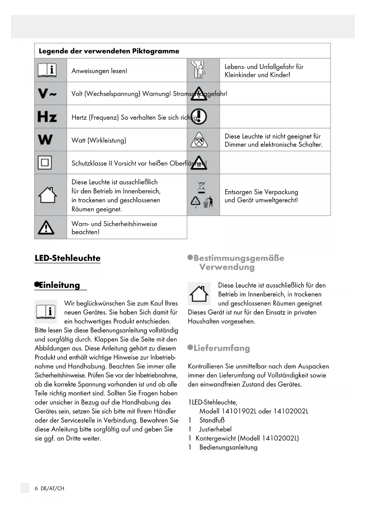 Entsorgen Sie Verpackung und Gerät umweltgerecht! Warn- und Sicherheitshinweise beachten! LED-Stehleuchte Einleitung Wir beglückwünschen Sie zum Kauf Ihres neuen Gerätes. Sie haben Sich damit für ein hochwertiges Produkt entschieden. Bitte lesen Sie diese Bedienungsanleitung vollständig und sorgfältig durch. Klappen Sie die Seite mit den Abbildungen aus. Diese Anleitung gehört zu diesem Produkt und enthält wichtige Hinweise zur Inbetrieb- nahme und Handhabung. Beachten Sie immer alle Sicherheitshinweise. Prüfen Sie vor der Inbetriebnahme, ob die korrekte Spannung vorhanden ist und ob alle Teile richtig montiert sind. Sollten Sie Fragen haben oder unsicher in Bezug auf die Handhabung des Gerätes sein, setzen Sie sich bitte mit Ihrem Händler oder der Servicestelle in Verbindung. Bewahren Sie diese Anleitung bitte sorgfältig auf und geben Sie sie ggf. an Dritte weiter. Bestimmungsgemäße Verwendung Diese Leuchte ist ausschließlich für den Betrieb im Innenbereich, in trockenen und geschlossenen Räumen geeignet. Dieses Gerät ist nur für den Einsatz in privaten Haushalten vorgesehen. Lieferumfang Kontrollieren Sie unmittelbar nach dem Auspacken immer den Lieferumfang auf Vollständigkeit sowie den einwandfreien Zustand des Gerätes. 1 LED-Stehleuchte, Modell 14101902L oder 14102002L 1 Standfuß 1 Justierhebel 1 Kontergewicht (Modell 14102002L) 1 Bedienungsanleitung7 DE/AT/CH Einleitung / SicherheitEinleitung Teilebeschreibung