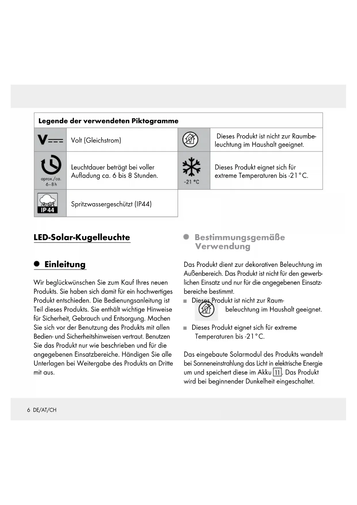 75 DE/AT/CH Legende der verwendeten Piktogramme ....................................................... Seite 6 Einleitung .....................................................................................................................................Seite 6 Bestimmungsgemäße Verwendung ................................................................................................Seite 6 Teilebeschreibung ...........................................................................................................................Seite 7 Lieferumfang ....................................................................................................................................Seite 7 Technische Daten ............................................................................................................................Seite 7 Sicherheitshinweise ............................................................................................................ Seite 8 Produktspezifische Sicherheitshinweise .........................................................................................Seite 8 Sicherheitshinweise für Batterien / Akkus ....................................................................................... Seite 9 Inbetriebnahme .....................................................................................................................Seite 10 Produkt montieren ...........................................................................................................................Seite 10 Produkt aufstellen ............................................................................................................................Seite 10 Produkt vor der Erstinbetrieb nahme vorbereiten ...........................................................................Seite 11 Produkt ein- / ausschalten ...............................................................................................................Seite 11 Akku wechseln .................................................................................................................................Seite 11 Fehlerbehebung ....................................................................................................................Seite 12 Wartung / Reinigung ..........................................................................................................Seite 13 Entsorgung .................................................................................................................................Seite 13 Garantie .......................................................................................................................................Seite 146 DE/AT/CH Legende der verwendeten Piktogramme Volt (Gleichstrom) Dieses Produkt ist nicht zur Raumbe- leuchtung im Haushalt geeignet. aprox./ca. 6‒8 h Leuchtdauer beträgt bei voller Aufladung ca. 6 bis 8 Stunden. Dieses Produkt eignet sich für extreme Temperaturen bis -21°C. Spritzwassergeschützt (IP44) LED-Solar-Kugelleuchte Einleitung Wir beglückwünschen Sie zum Kauf Ihres neuen Produkts. Sie haben sich damit für ein hochwertiges Produkt entschieden. Die Bedienungsanleitung ist Teil dieses Produkts. Sie enthält wichtige Hinweise für Sicherheit, Gebrauch und Entsorgung. Machen Sie sich vor der Benutzung des Produkts mit allen Bedien- und Sicherheitshinweisen vertraut. Benutzen Sie das Produkt nur wie beschrieben und für die angegebenen Einsatzbereiche. Händigen Sie alle Unterlagen bei Weitergabe des Produkts an Dritte mit aus. Bestimmungsgemäße Verwendung Das Produkt dient zur dekorativen Beleuchtung im Außenbereich. Das Produkt ist nicht für den gewerb- lichen Einsatz und nur für die angegebenen Einsatz- bereiche bestimmt. Dieses Produkt ist nicht zur Raum- beleuchtung im Haushalt geeignet. Dieses Produkt eignet sich für extreme Temperaturen bis -21°C. Das eingebaute Solarmodul des Produkts wandelt bei Sonneneinstrahlung das Licht in elektrische Energie um und speichert diese im Akku