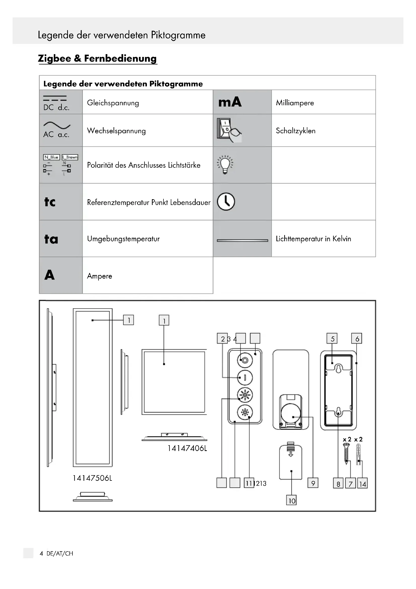 Teilbeschreibung / Technische Daten / Leuchte zurück... / Fernbedienung und...5 DE/AT/CH Legende der verwendeten Piktogramme Teilbeschreibung / Technische Daten / Leuchte zurück... / Fernbedienung und... Teilebeschreibung
