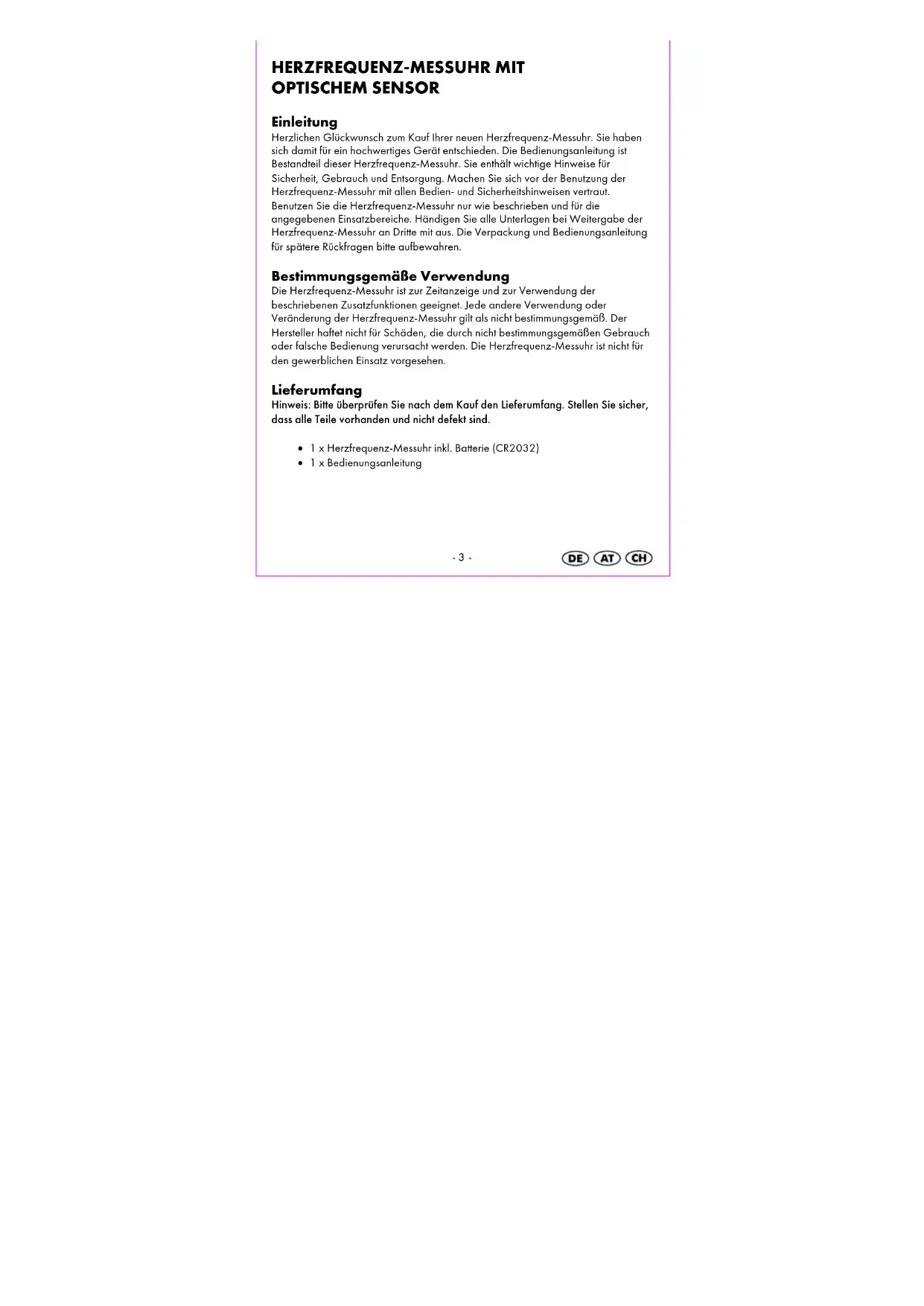 Reinigungshinweis Reinigen Sie die Herzfrequenz-Messuhr nur mit einem trockenen, fusselfreien Tuch, wie es z. B. zur Reinigung von Brillengläsern verwendet wird. Nach jedem Tragen reinigen Sie das Uhrenarmband mit lauwarmen Wasser oder einer milden Seifenwasserlösung und einem Schwamm. Achten Sie darauf, dass die Herzfrequenz-Messuhr dabei nicht nass wird. Trocknen Sie alle Teile mit einem Tuch ab. Schweiß und Verunreinigungen beeinträchtigen die Funktion des Sensors. Entsorgung der Herzfrequenz-Messuhr Diese Herzfrequenz-Messuhr darf nicht im normalen Hausmüll entsorgt werden. Entsorgen Sie die Herzfrequenz-Messuhr über einen zugelassenen Entsorgungsbetrieb oder über Ihre kommunale Entsorgungseinrichtung. Beachten Sie die aktuell geltenden Vorschriften. Setzen Sie sich im Zweifelsfall mit Ihrer Entsorgungseinrichtung in Verbindung. Entsorgung der Batterien Bitte entsorgen Sie Ihre Batterien sachgerecht in extra hierfür aufgestellten Gefäßen im Handel. Batterien gehören nicht in den Hausmüll. Entsorgen Sie Batterien bitte über einen zugelassenen Entsorgungsbetrieb oder über Ihre kommunale Entsorgungseinrichtung. Beachten Sie die aktuell geltenden Vorschriften. Setzen Sie sich im Zweifelsfall mit Ihrer Entsorgungseinrichtung in Verbindung.-